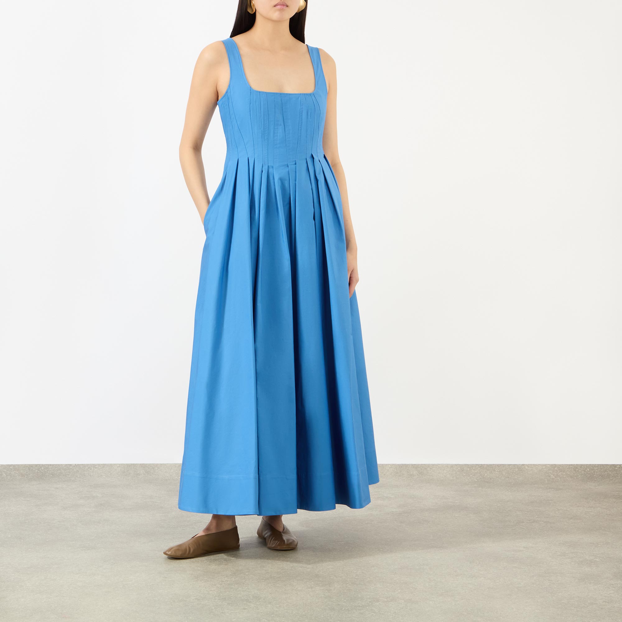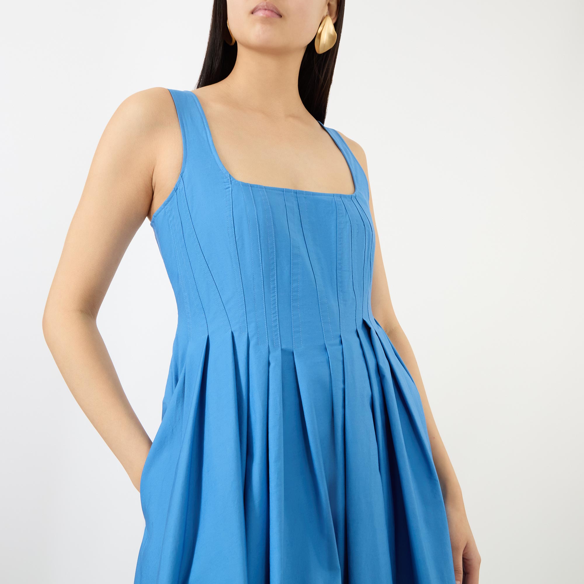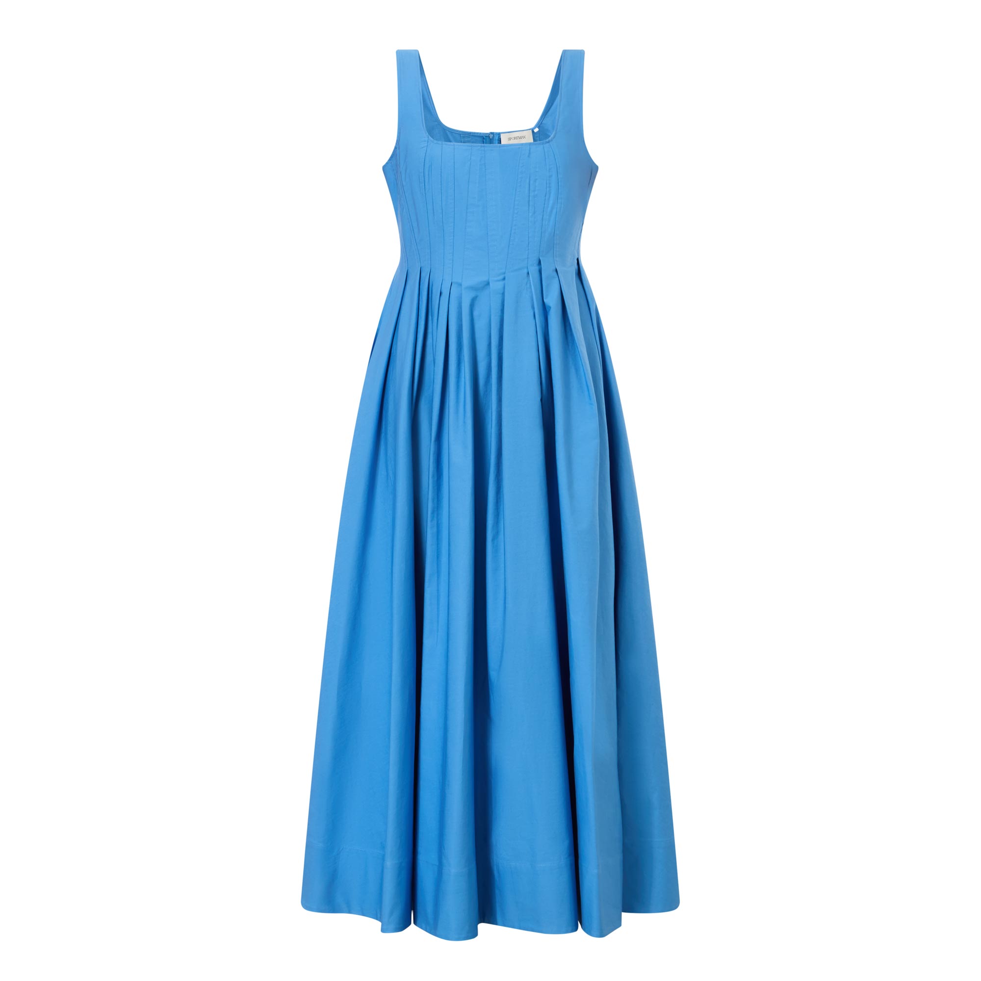 - Squared neckline, wide straps, midi length, zip fastening to the back, flared pleated skirt, side entry pockets, vertical seam and dart motif on the bodice