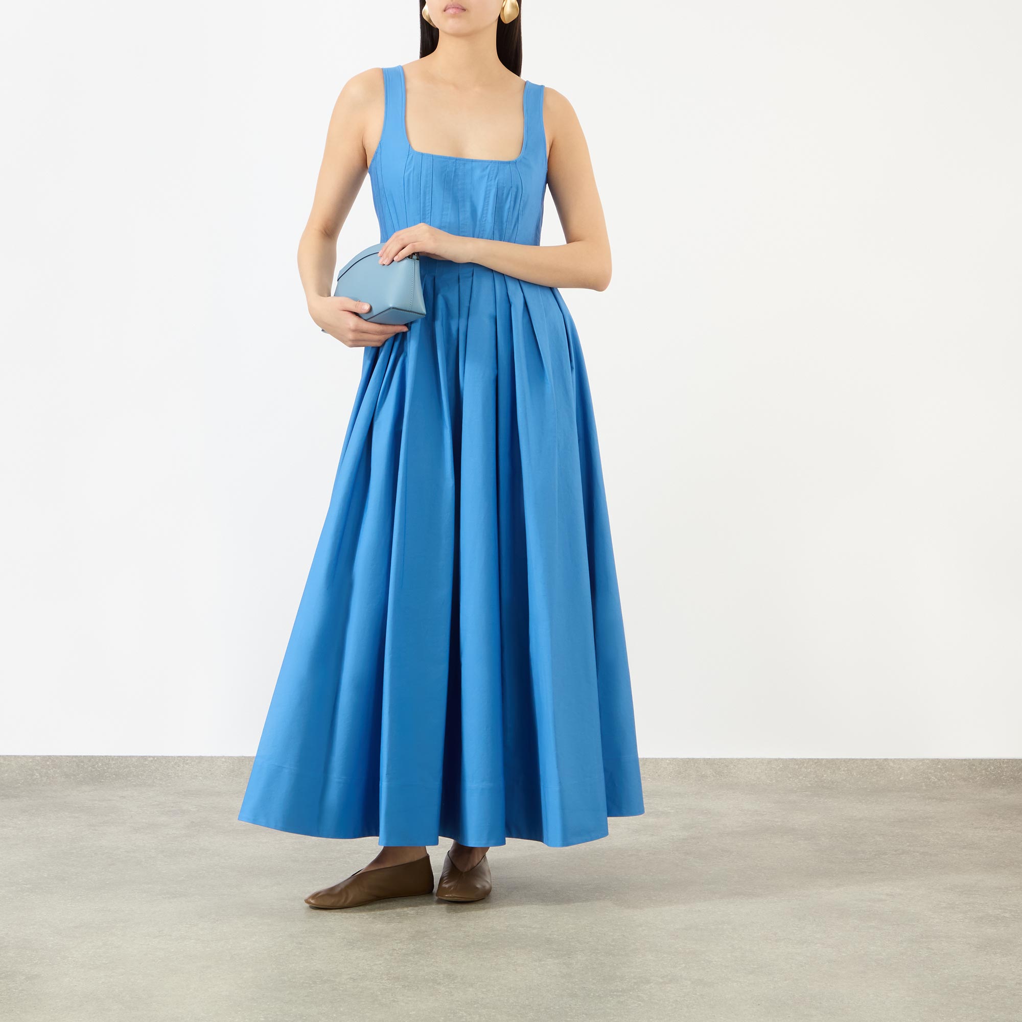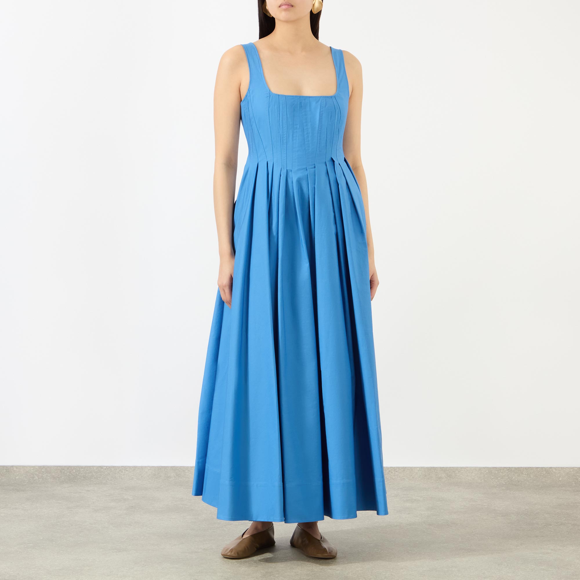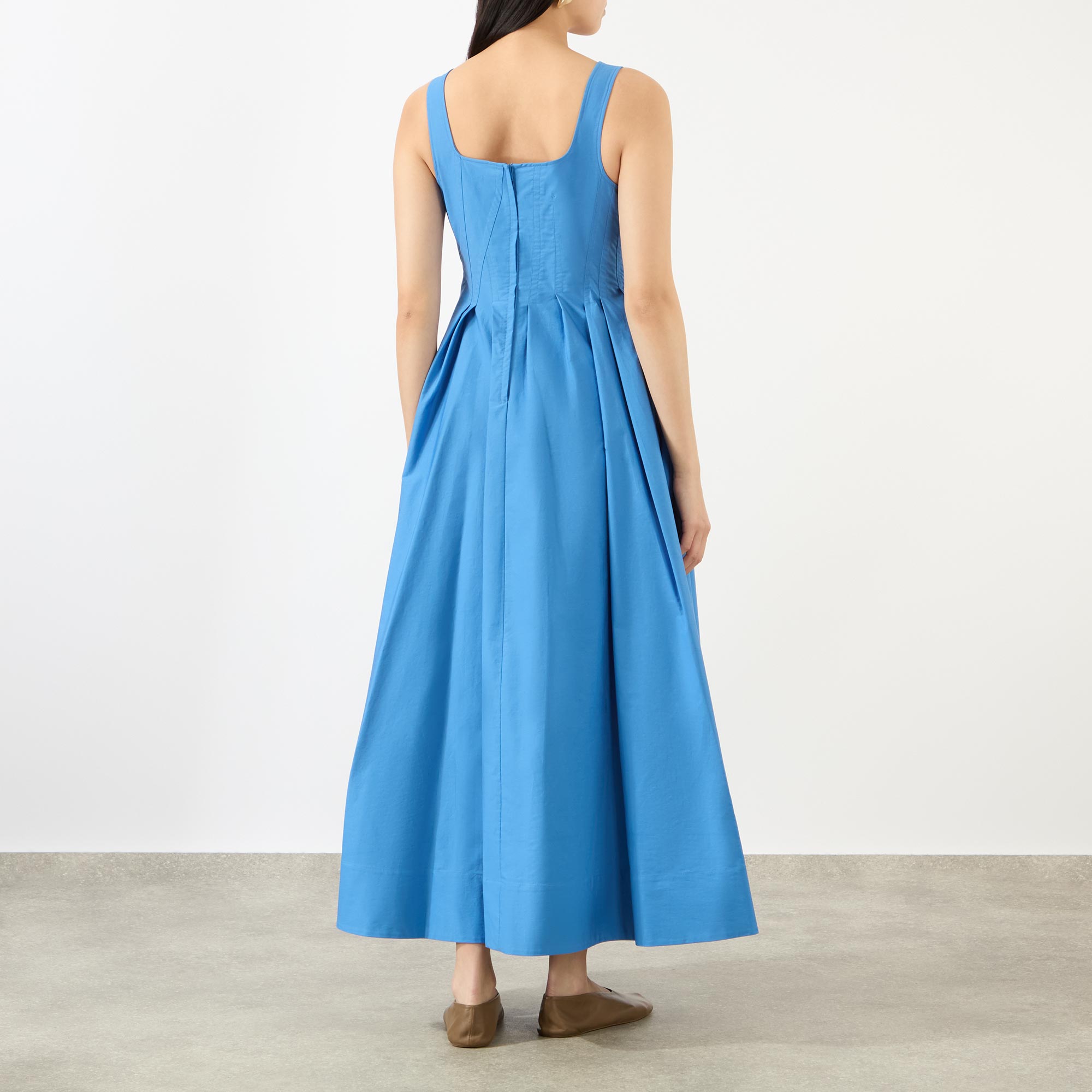 - Squared neckline, wide straps, midi length, zip fastening to the back, flared pleated skirt, side entry pockets, vertical seam and dart motif on the bodice