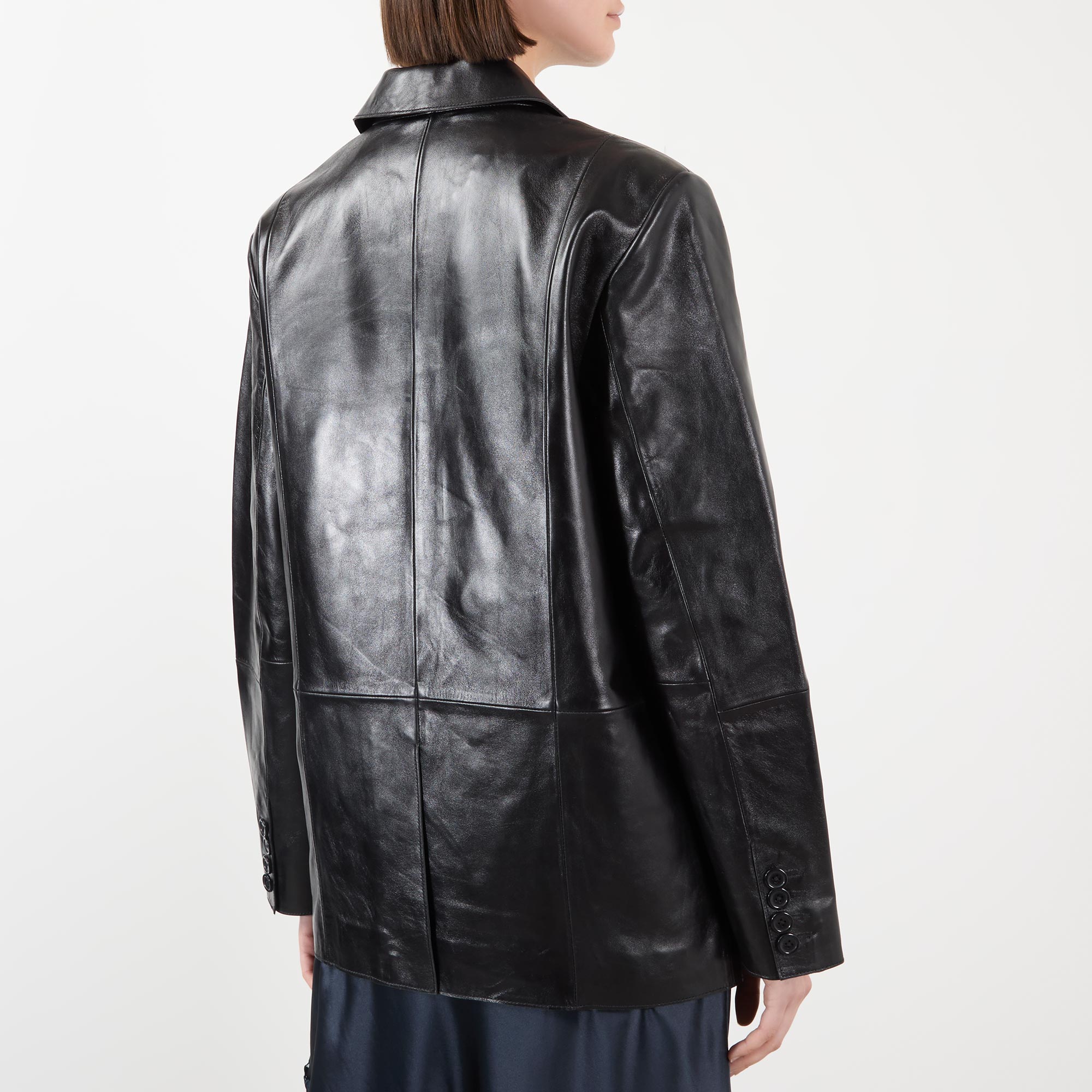 • Double-breasted front, long sleeves, dropped shoulders, peak lapel collar, tonal buttons, chest welt pocket, two side flap pockets, buttoned cuffs, grained leather finish