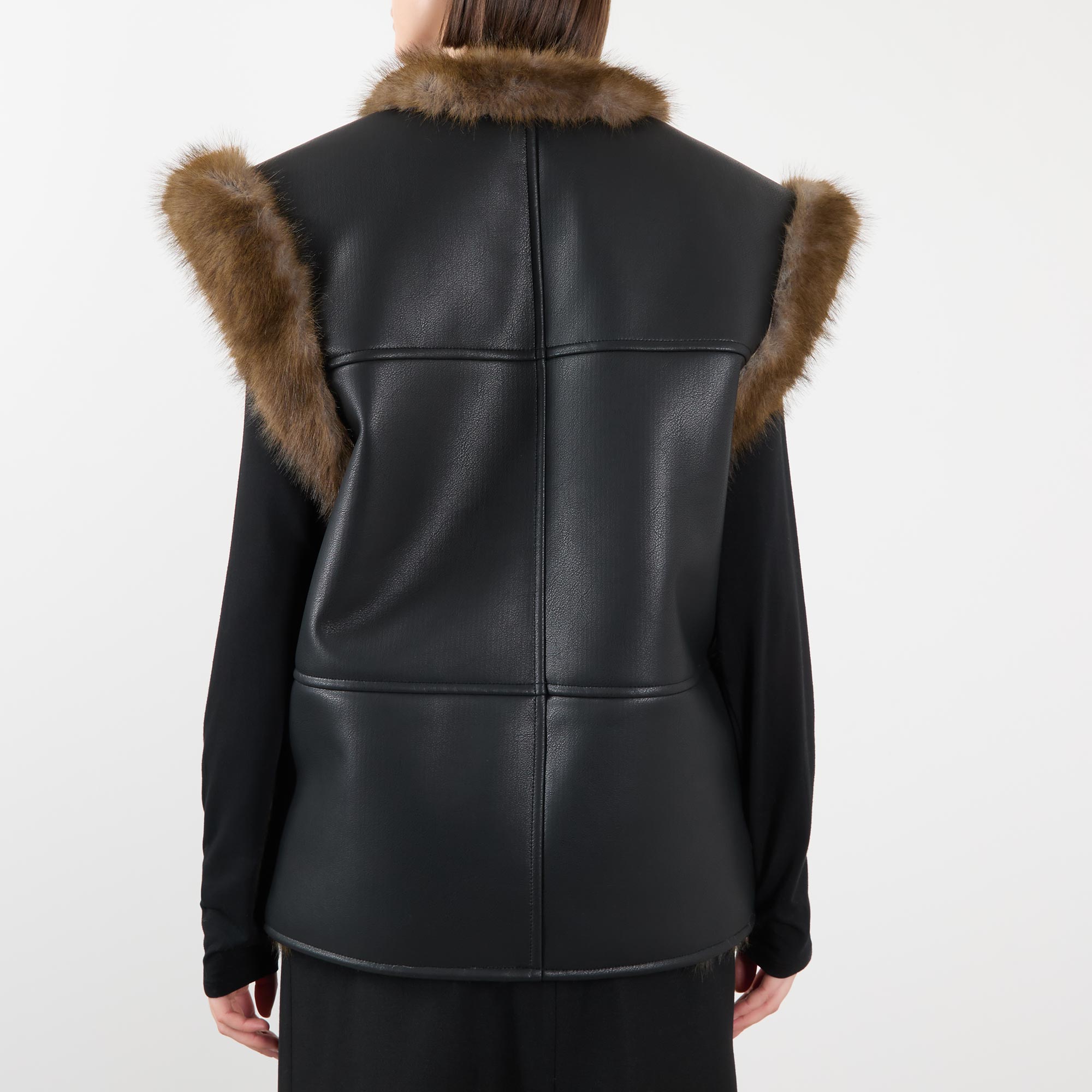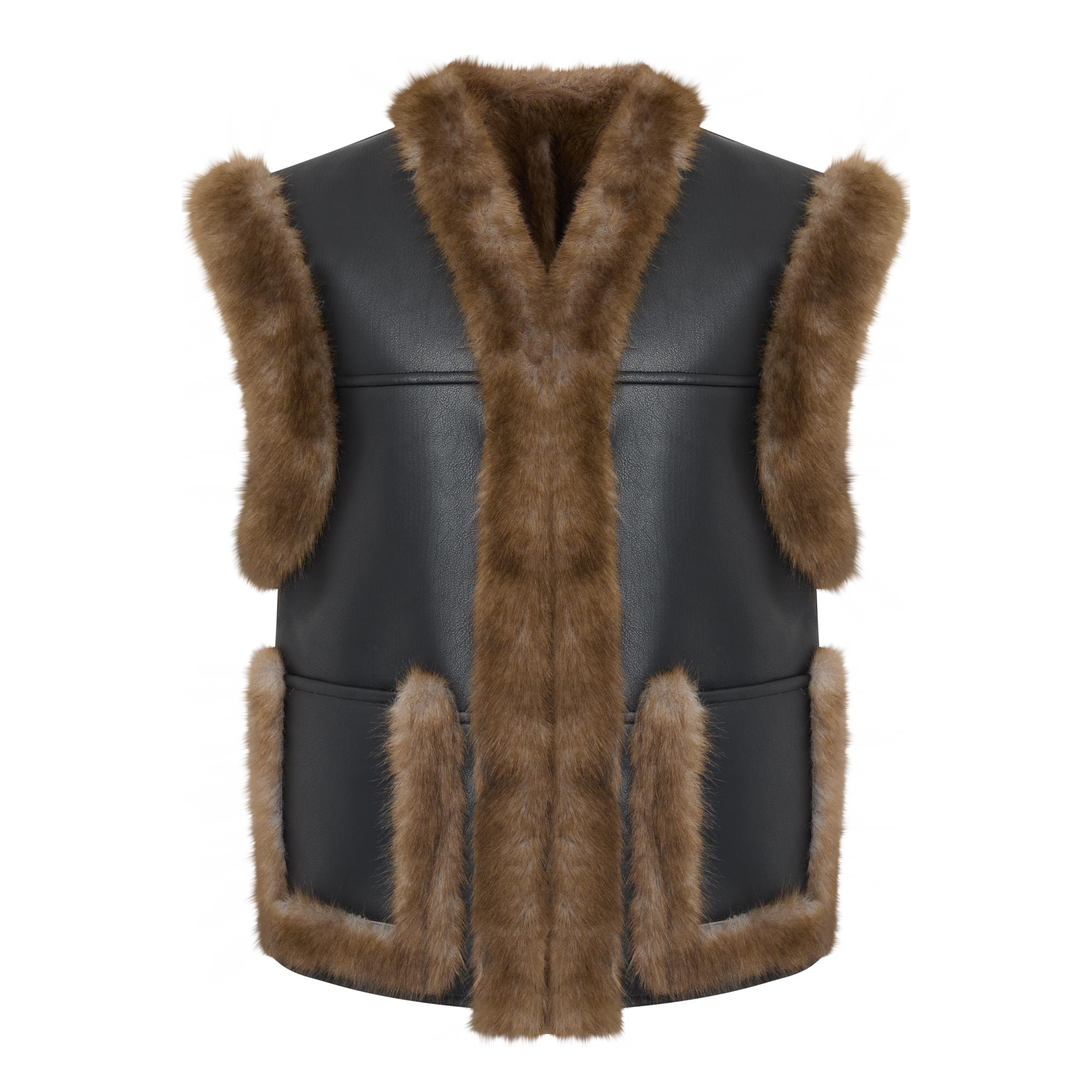 - Reversible design, short cap sleeves, faux shearling trims and lining , two side patch pockets, faux leather finish