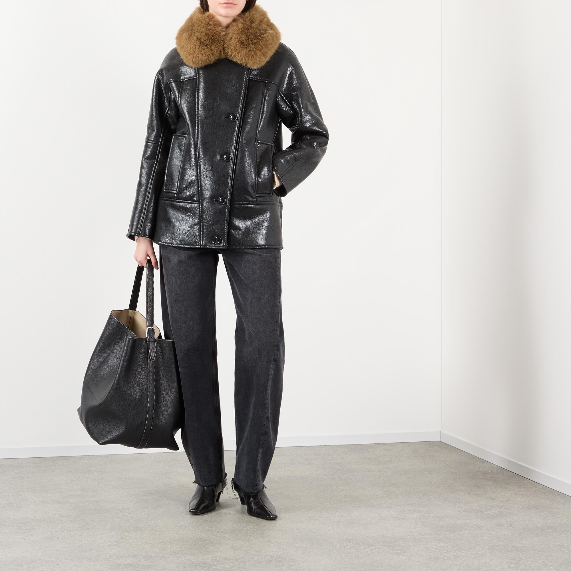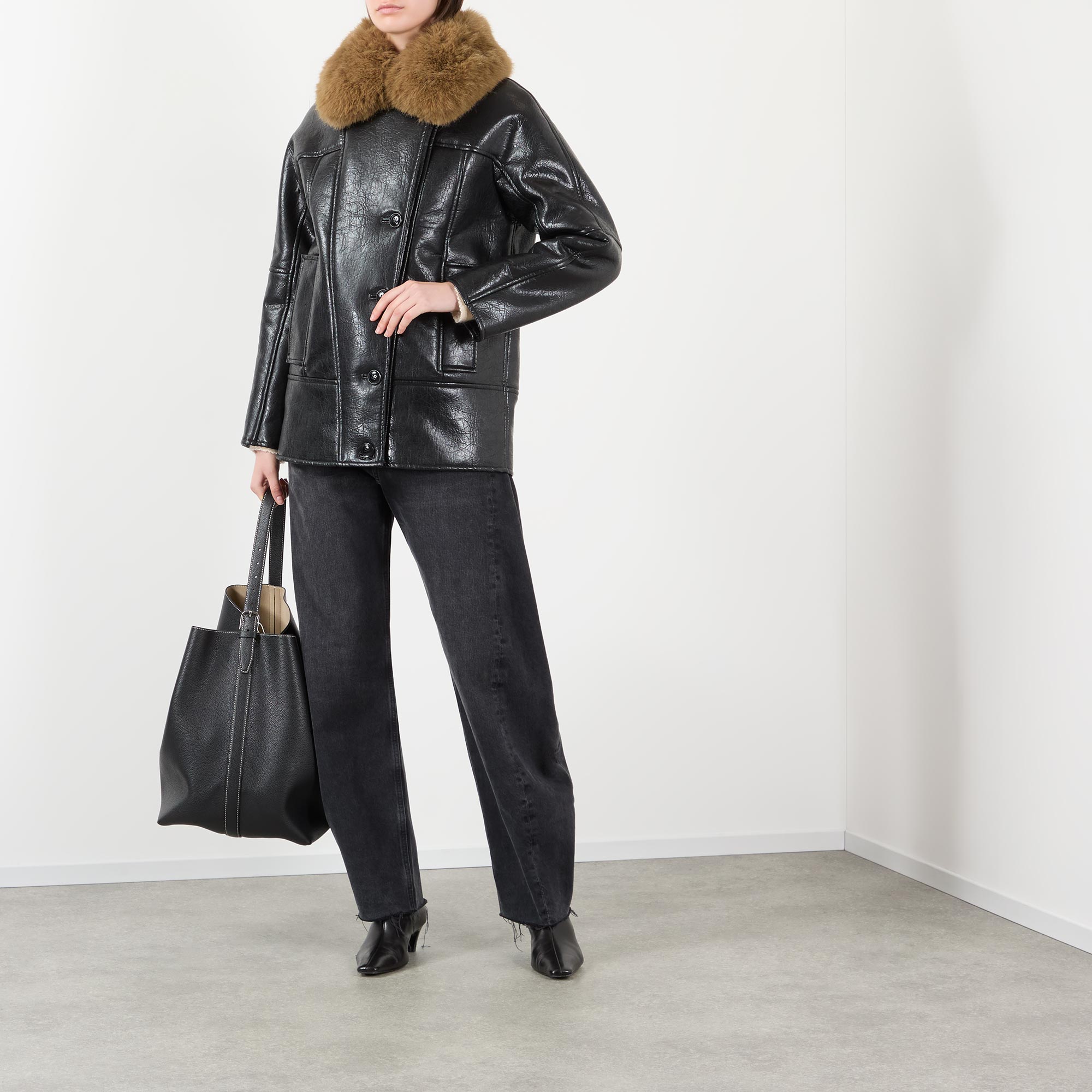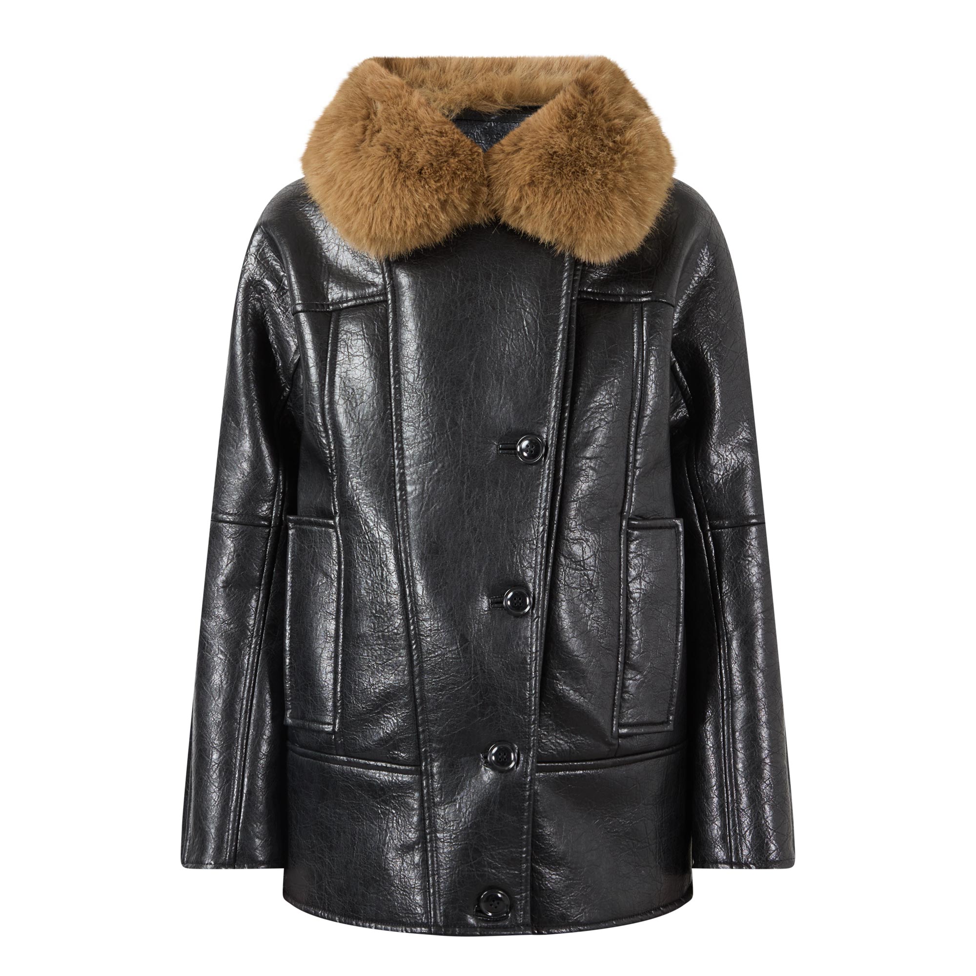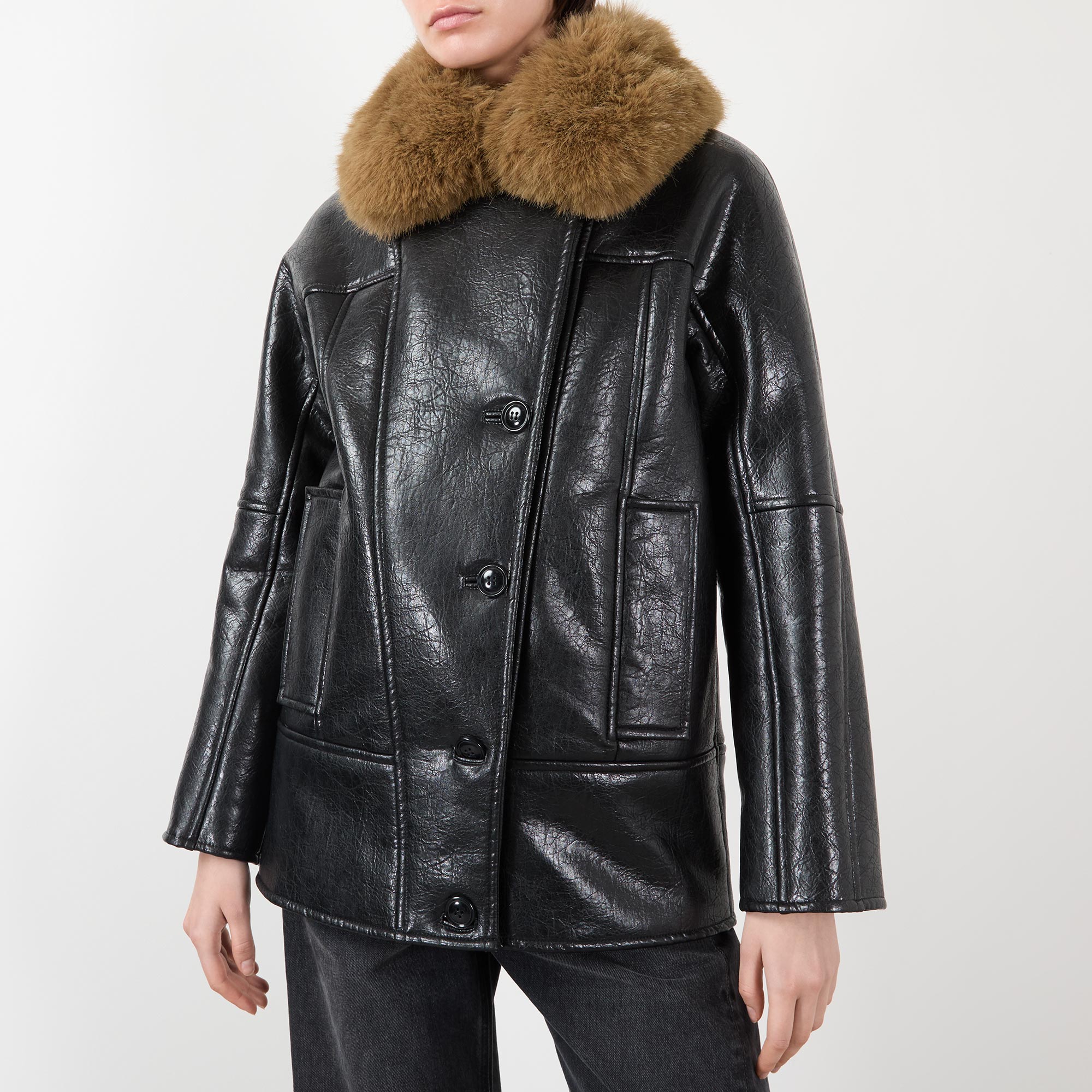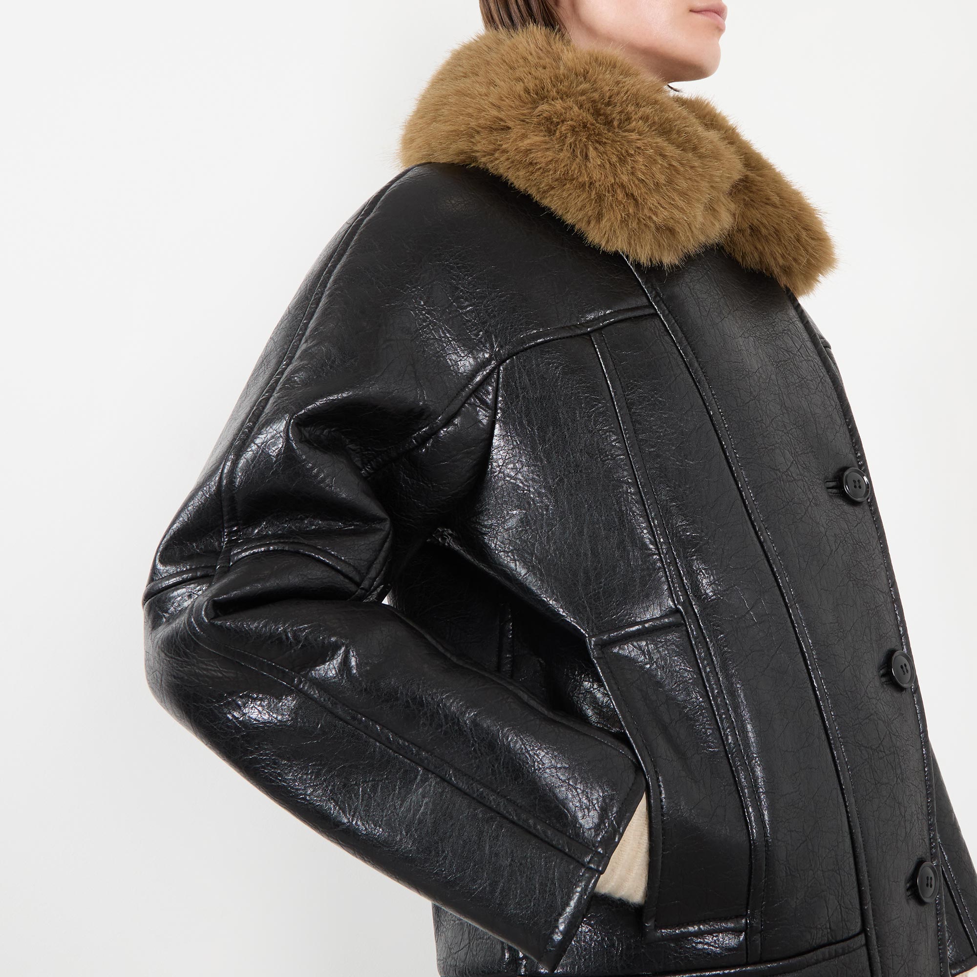 - Long sleeves, faux shearling collar, diagonal button fastenings, two side in-seam pockets, straight fit, grained leather finish