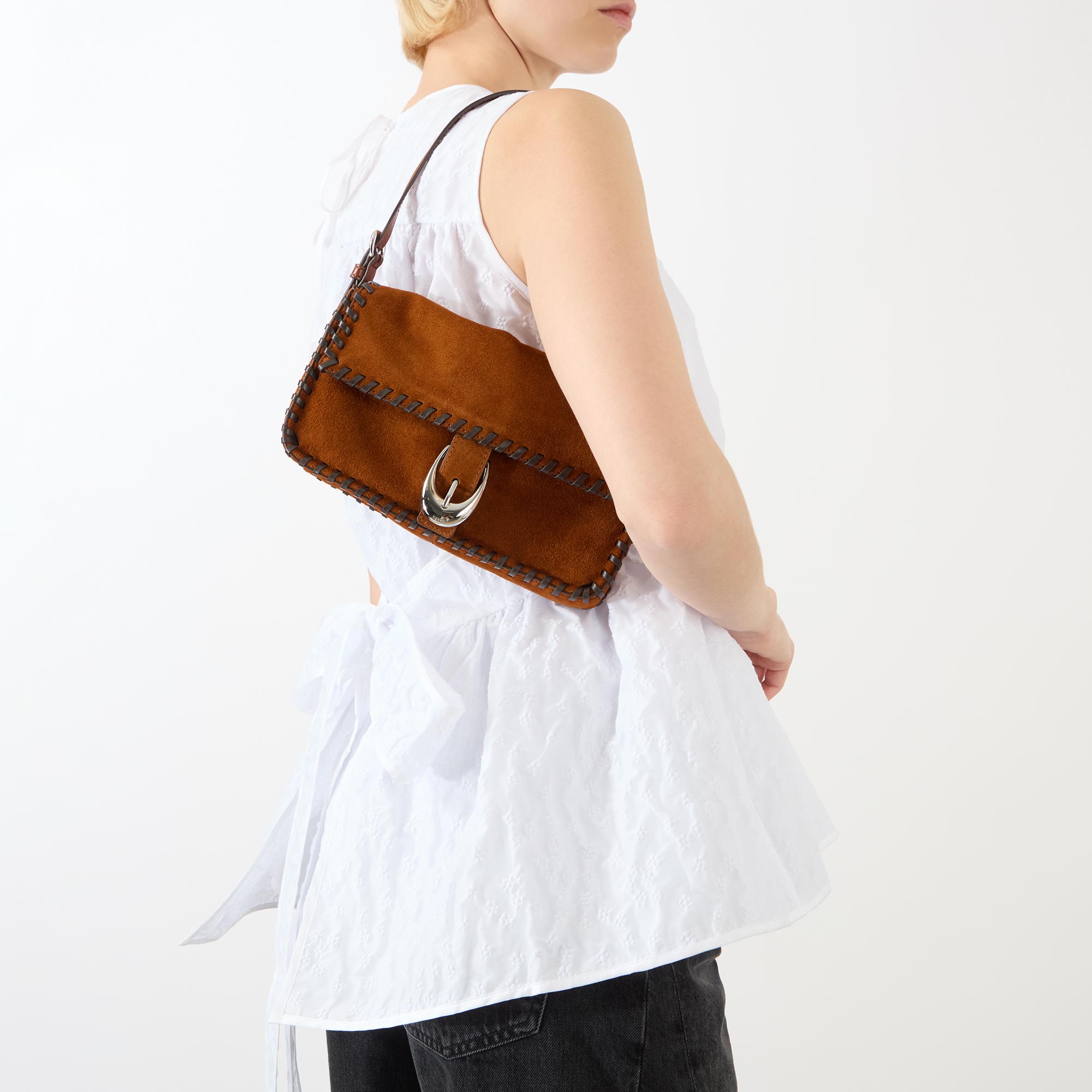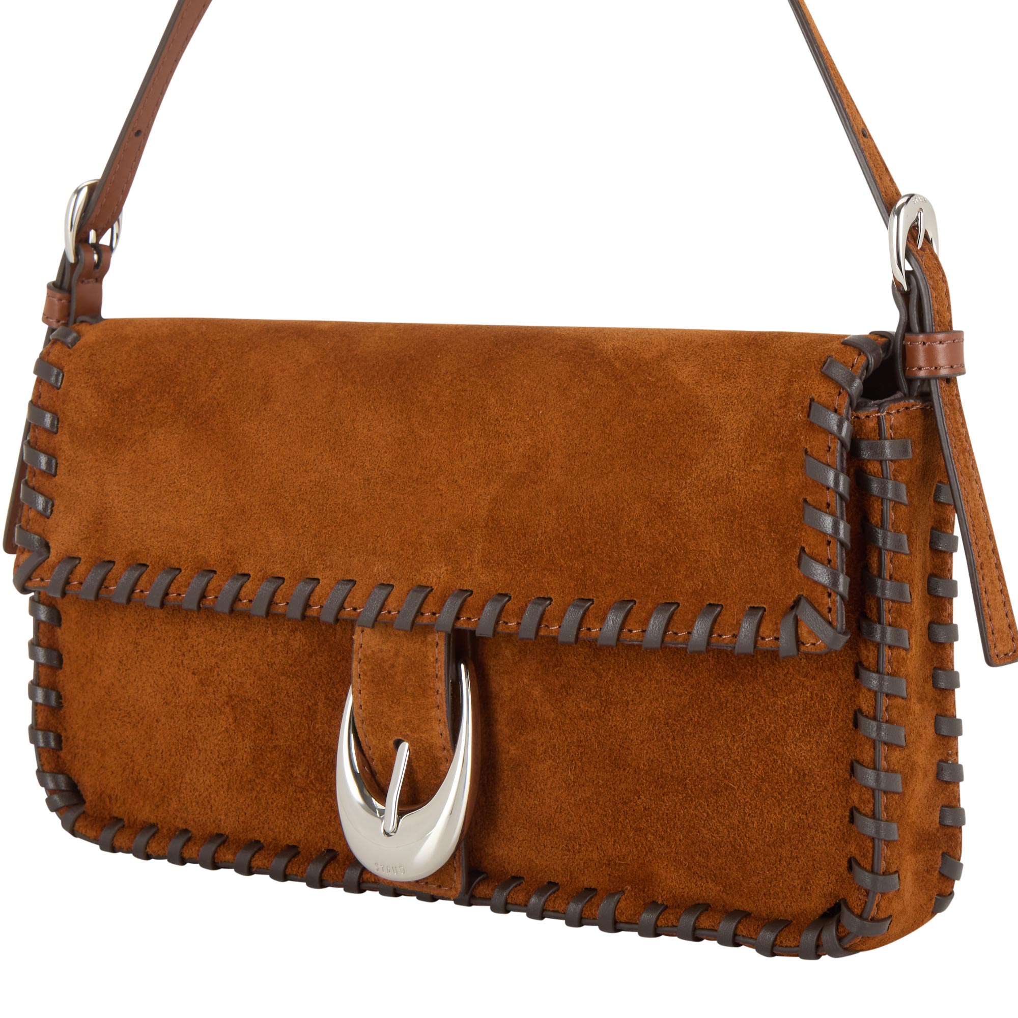 - Adjustable shoulder strap, foldover flap closure with adjustable buckle fastening, silver-tone hardware, rear debossed logo detail, contrast whipstitch detailing, tonal stitching, smooth suede finish