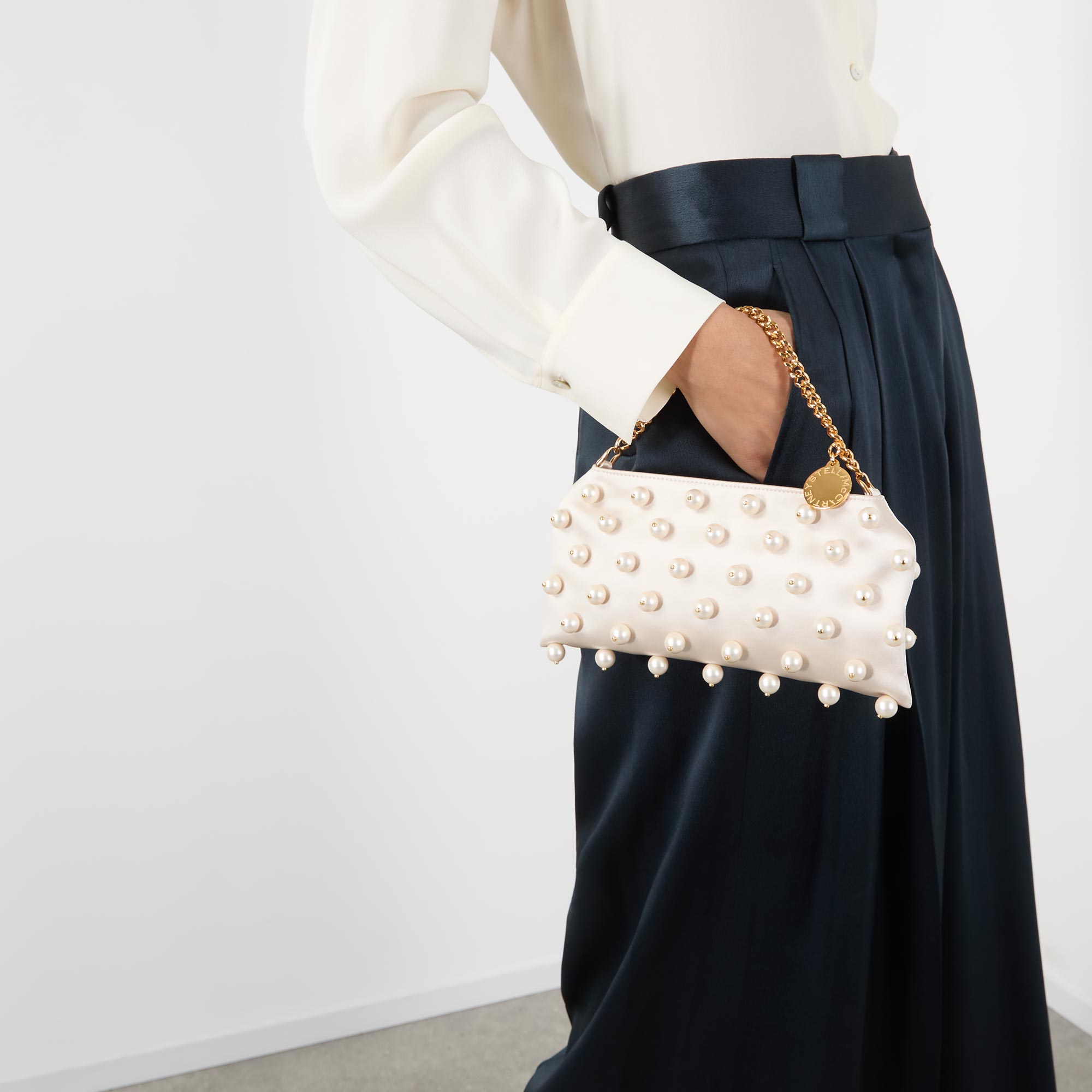 - Top zip fastening, carry handle, detachable chain strap, gold-tone hardware, satin fabric, pearl stud detailing, branded disc detail