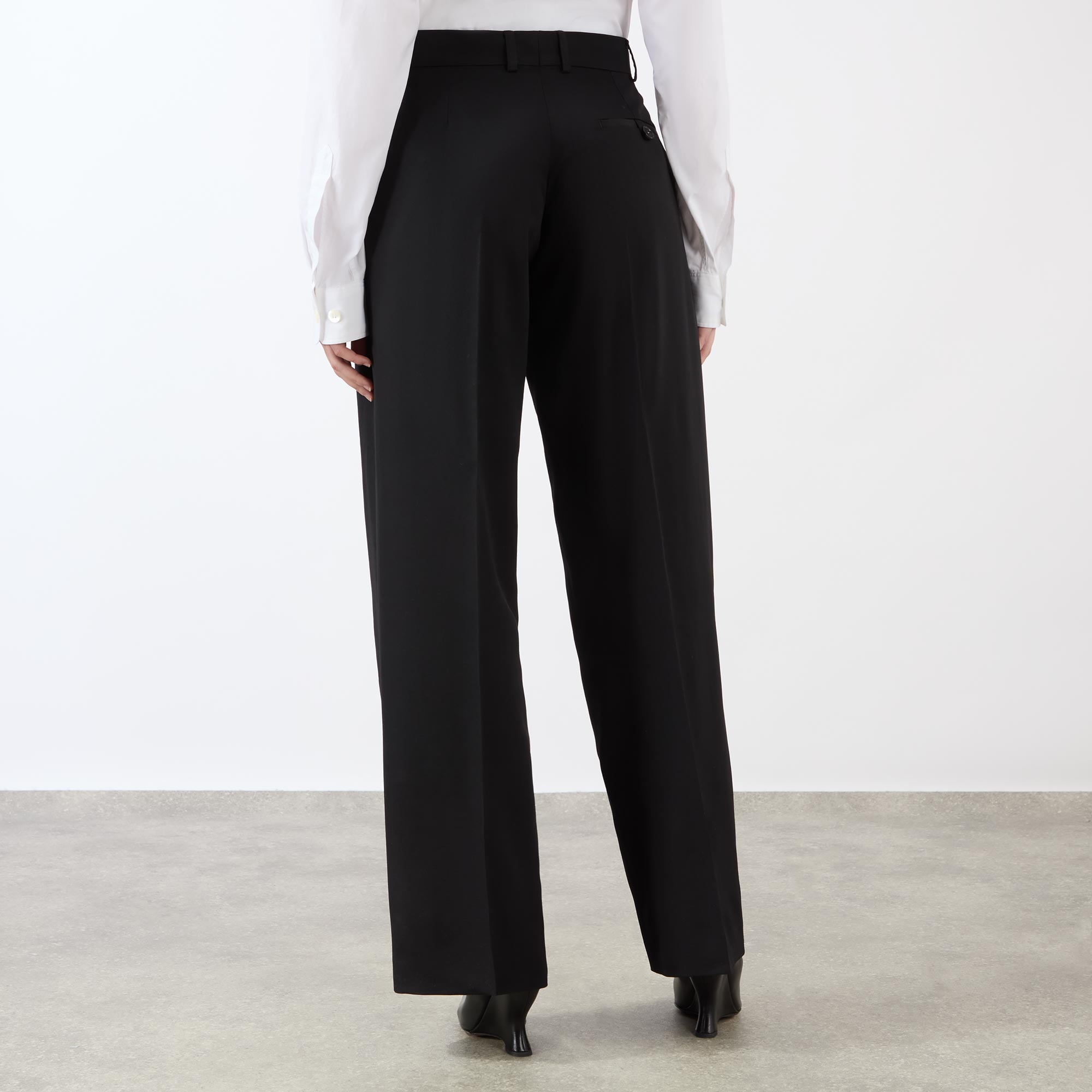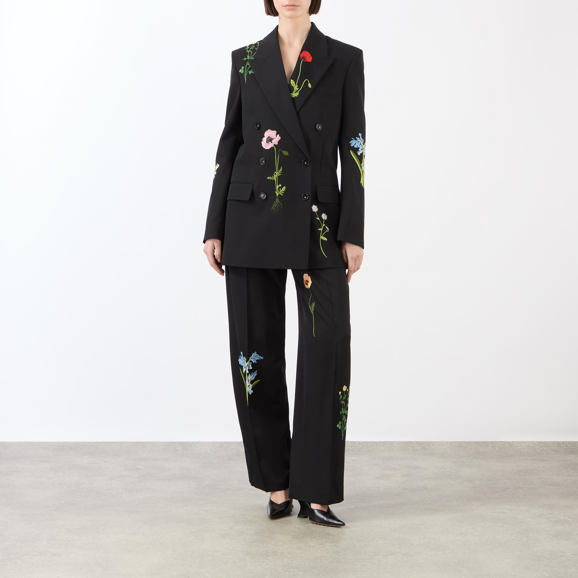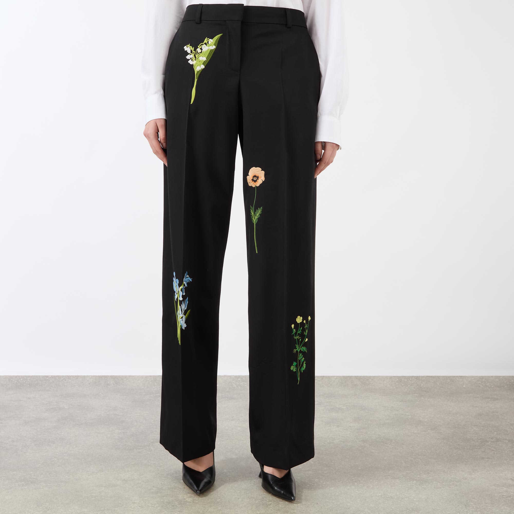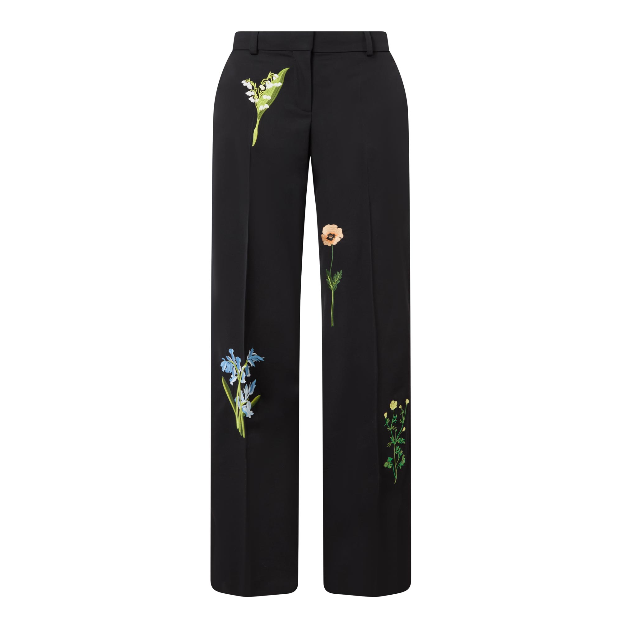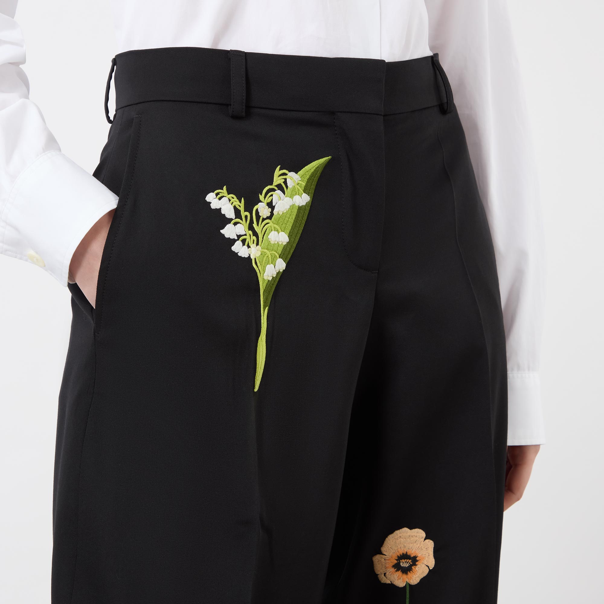 • Concealed hook and eye with fly zip fastening, belt loops, side entry pockets, rear pockets, pressed creases, straight-cut legs, floral embroidery