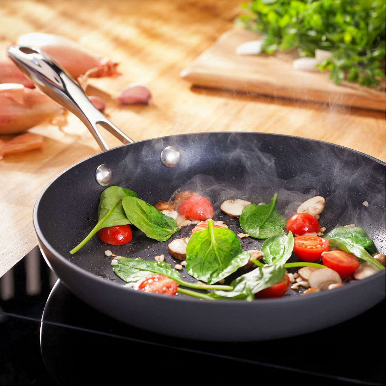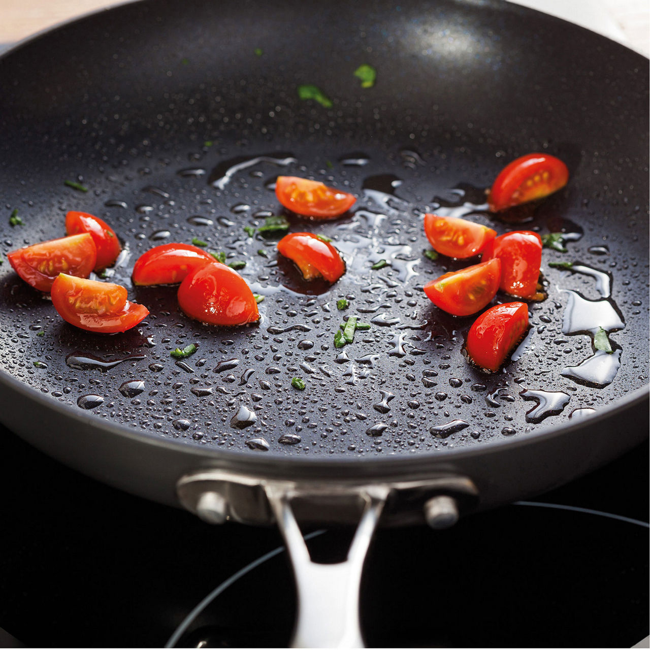 - Non-stick, suitable for all hobs including induction, hard anodised finish