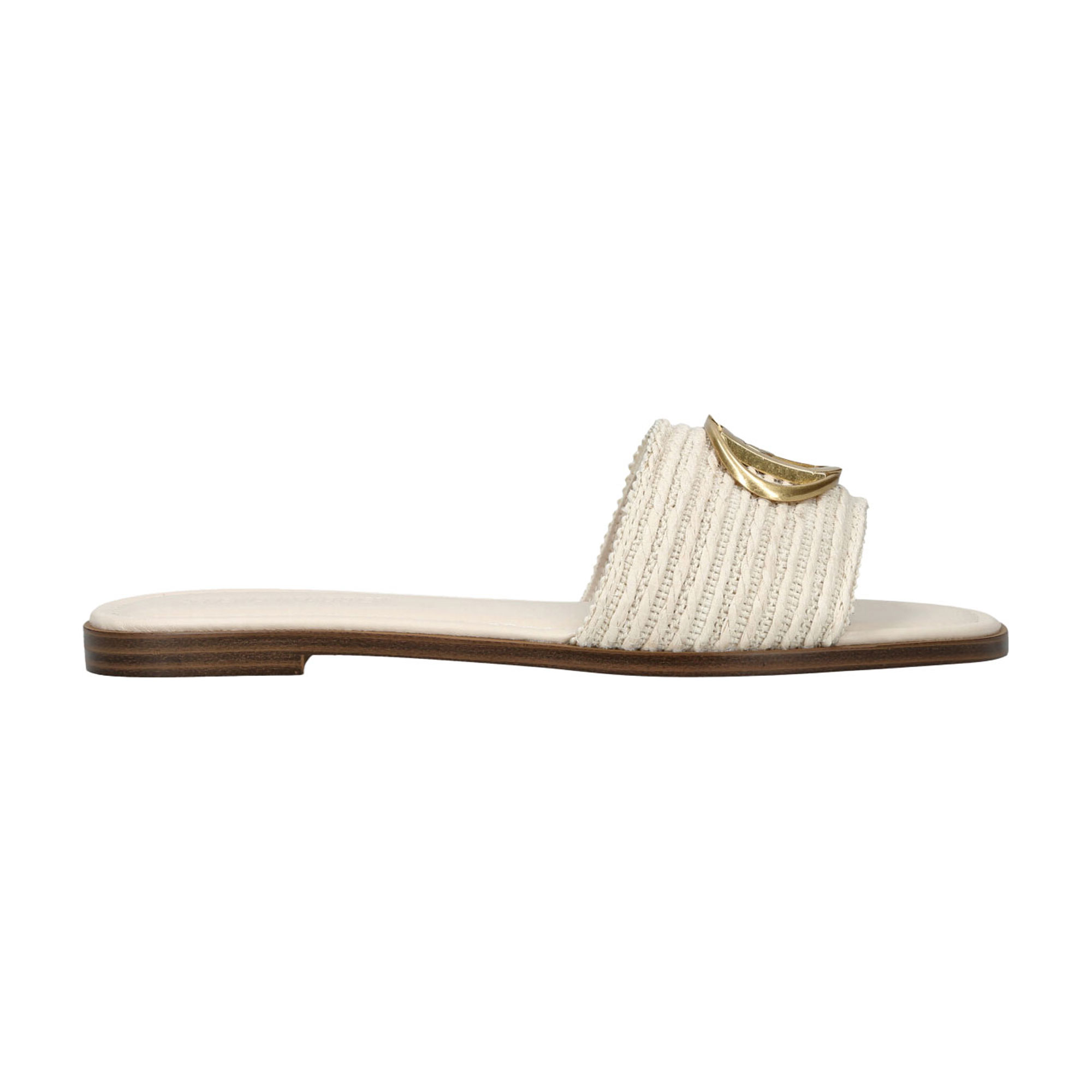 - Synthetic material, textured upper, gold-tone logo embellishment, flat sole