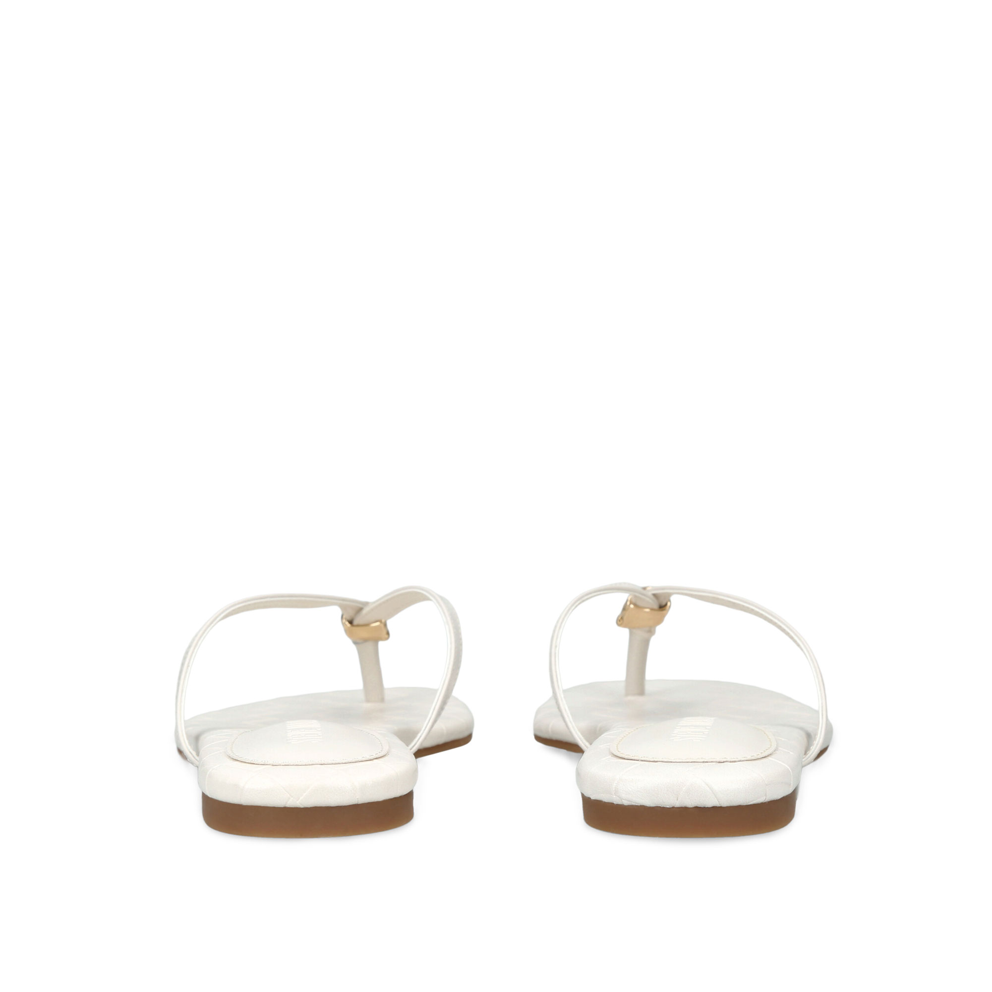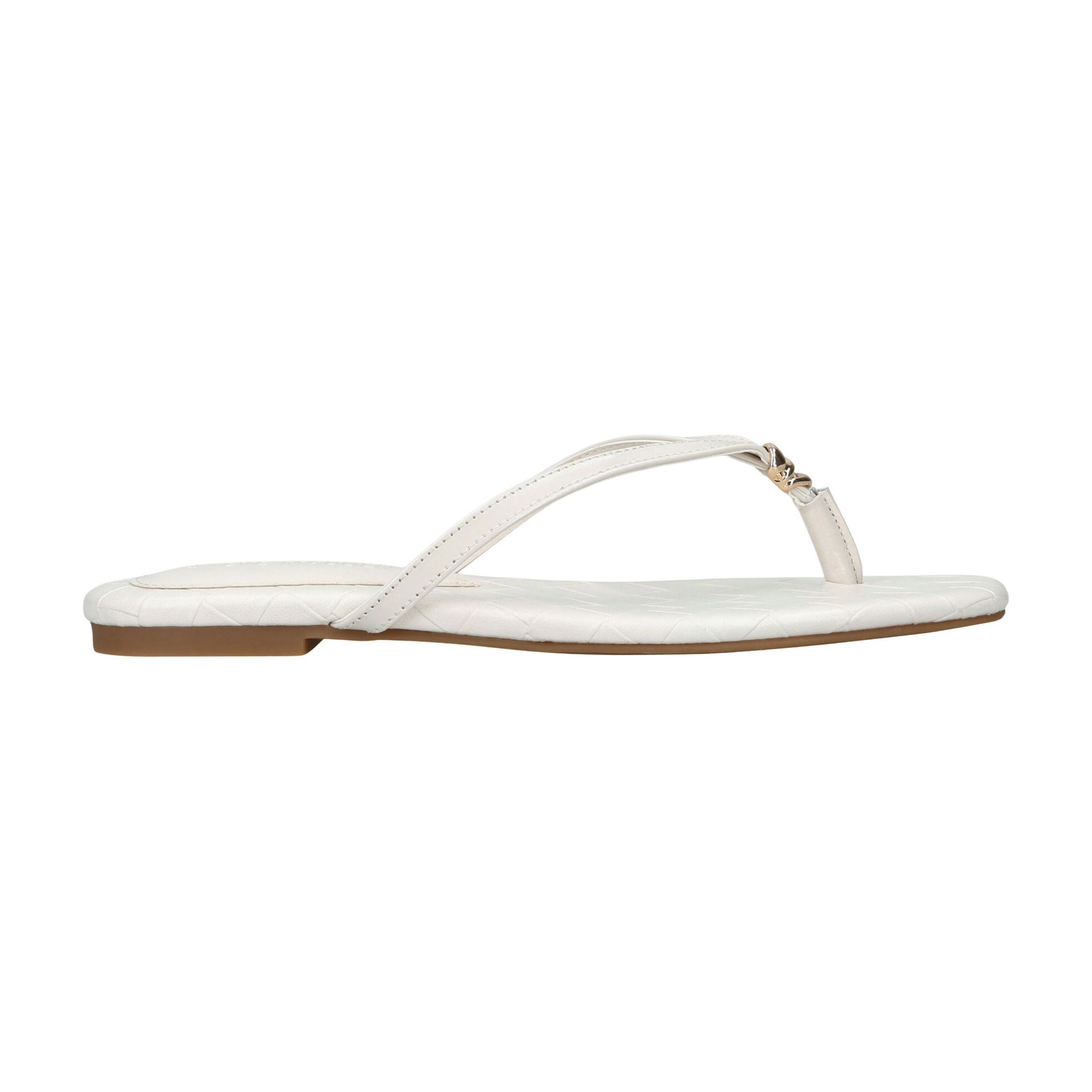 - Smooth leather, thong strap, stitching details, small metallic accent