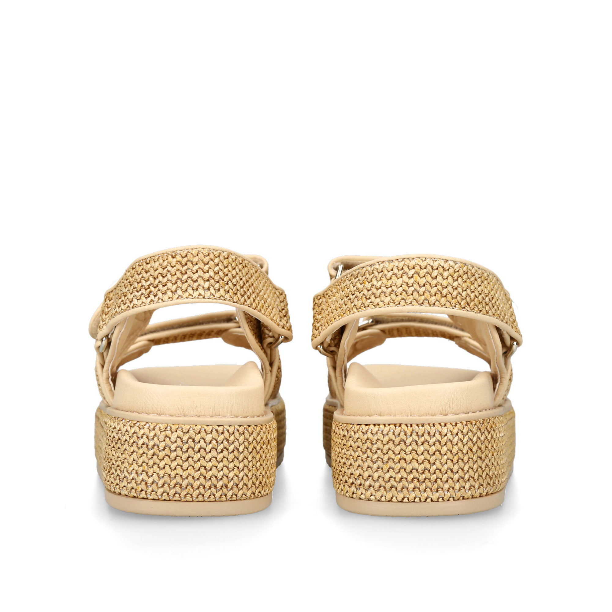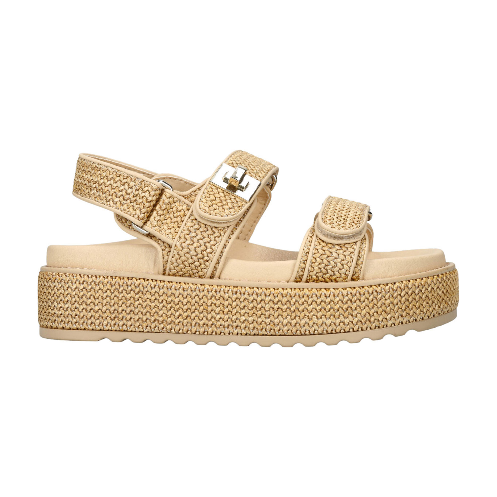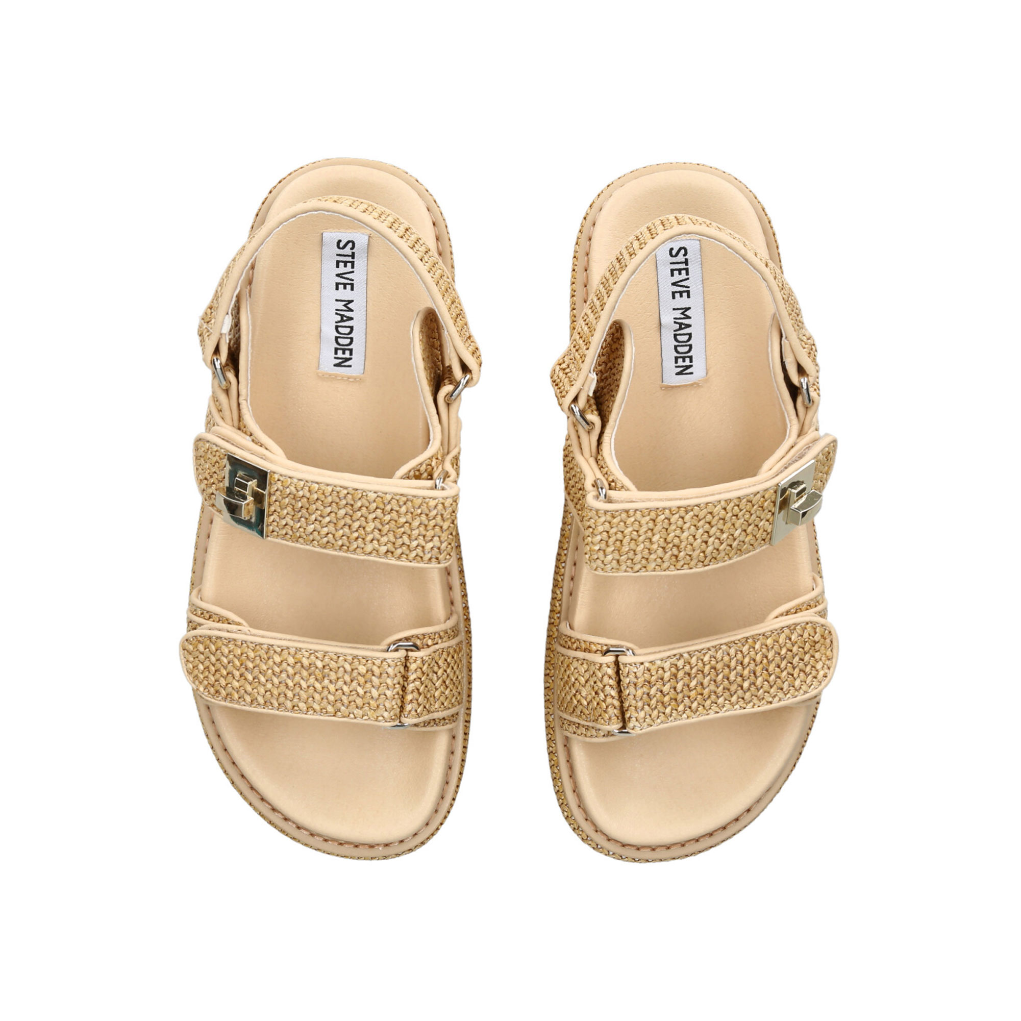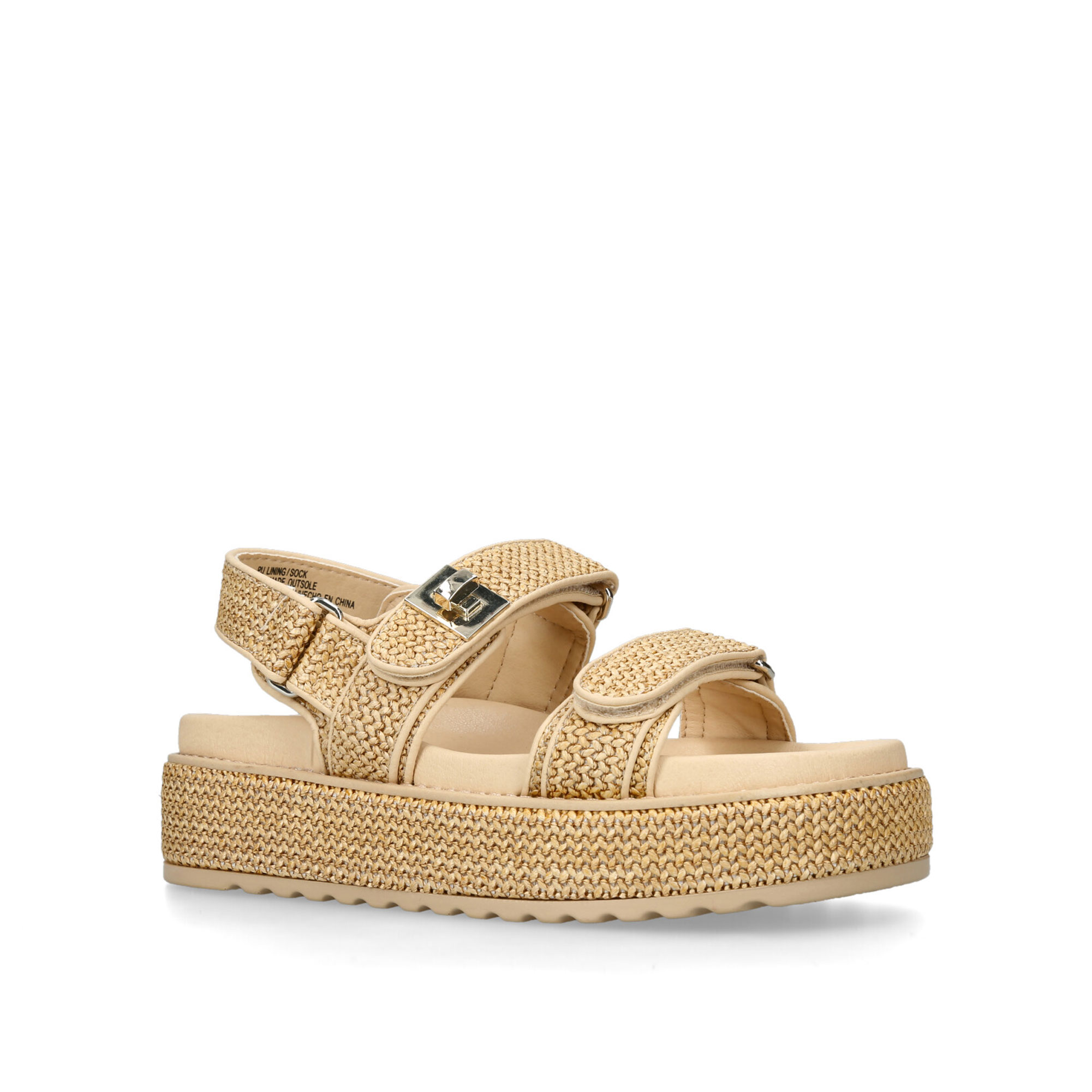 - Textured finish, adjustable straps, gold-tone buckle detail, flat sole