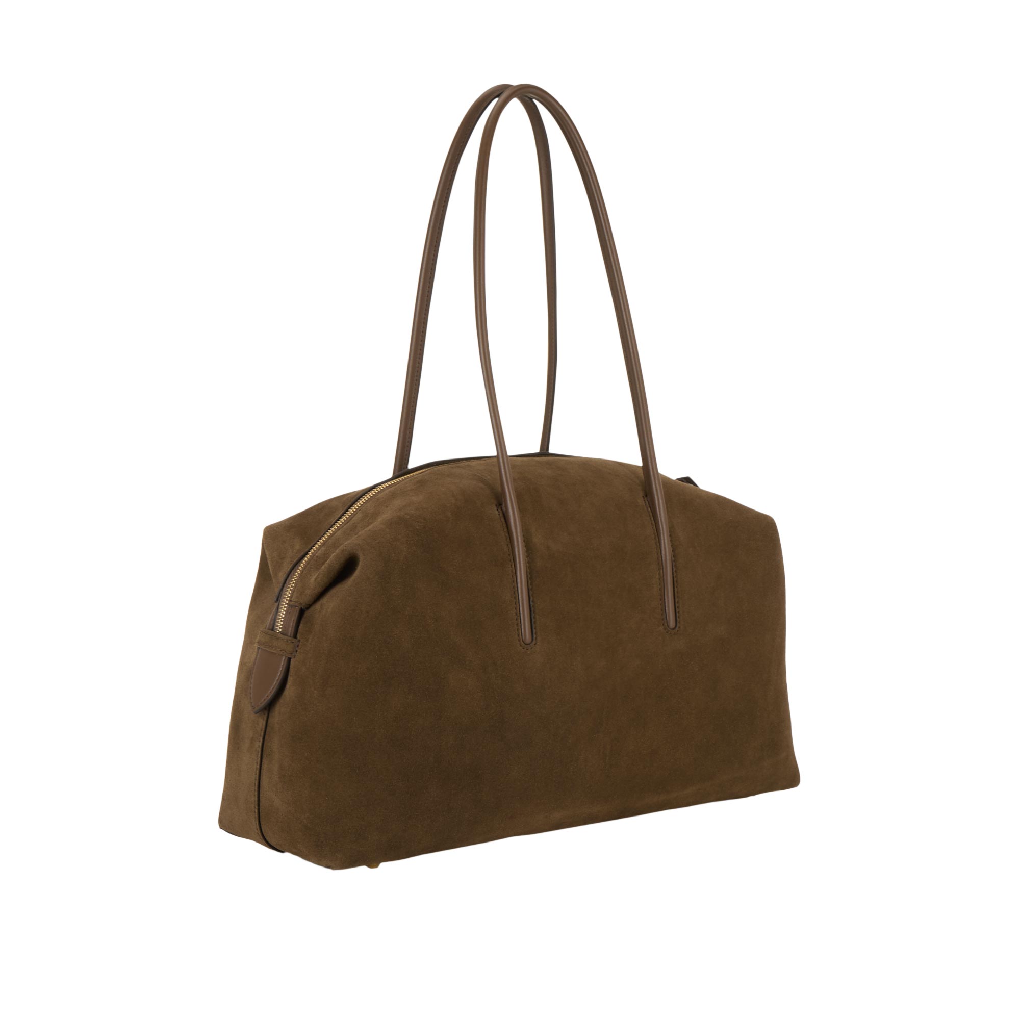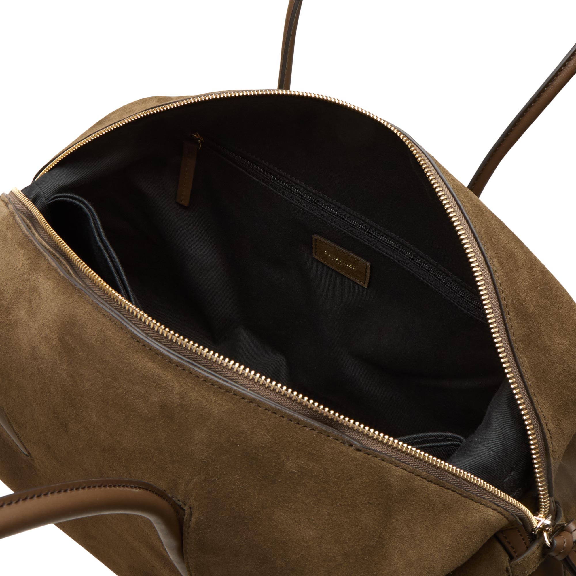 - Tubular carry handles, top zip fastening, side tabs with snap button fastenings, leather loop detailing, foil embossed logo, gold-tone hardware, suede finish