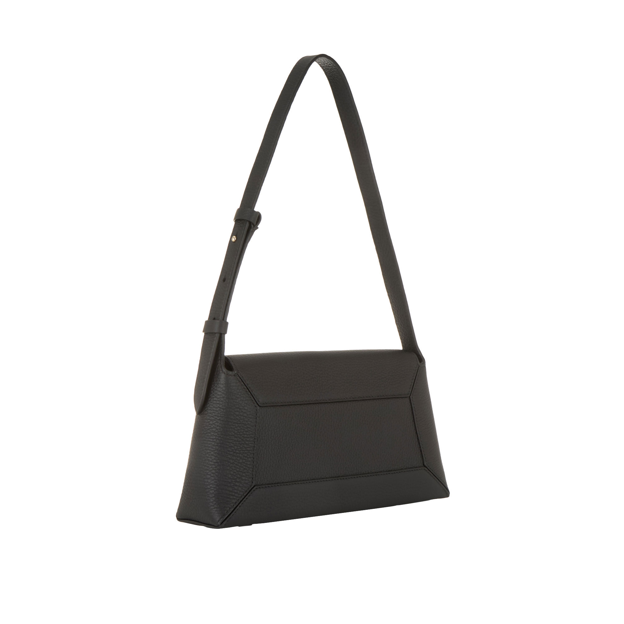 - Flap fastening with magnetic button closures, interior zip fastening, grained finish, logo lettering, gold-tone hardware, adjustable shoulder strap, signature Music bar embellishment