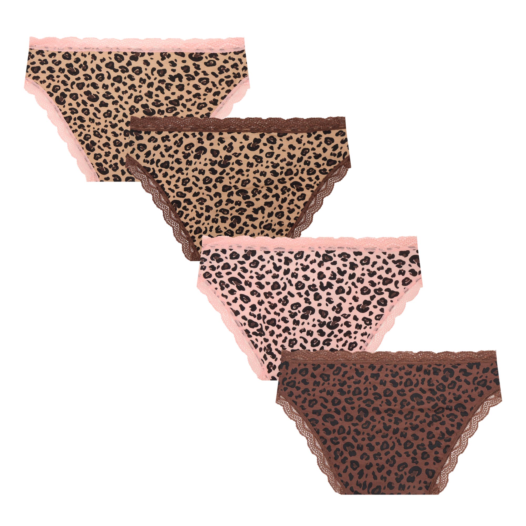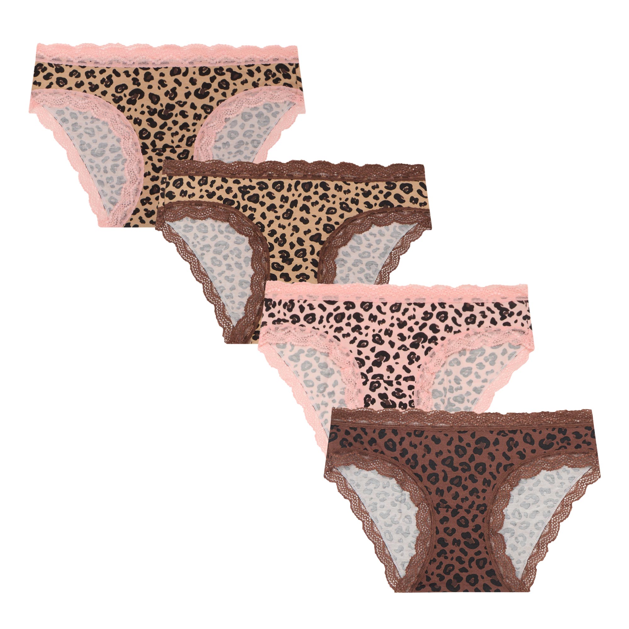 - Pack of four, assorted colours, animal print, lace trims, moderate coverage