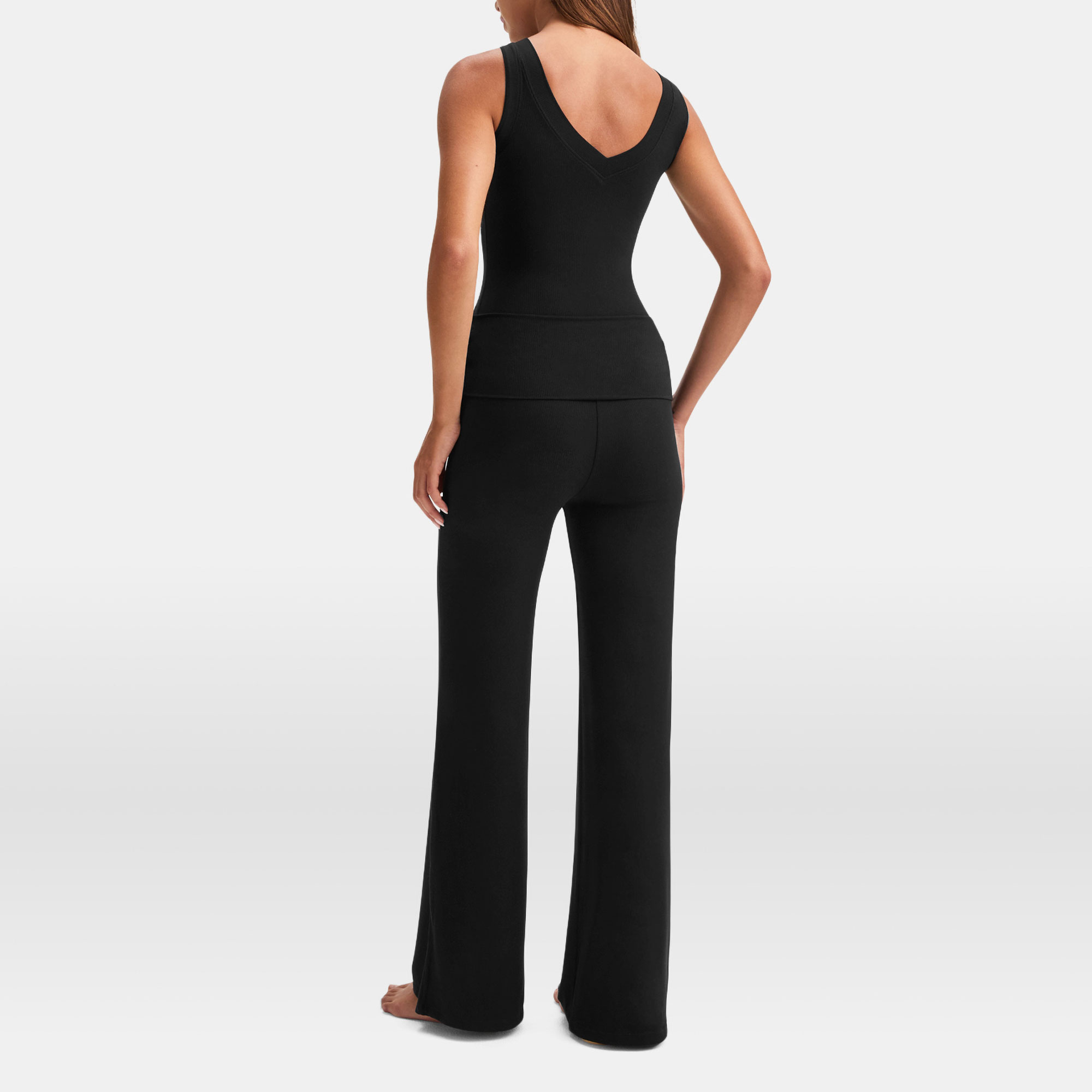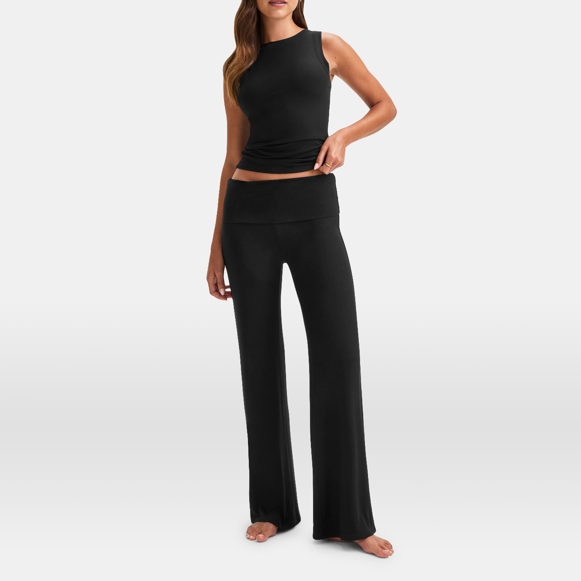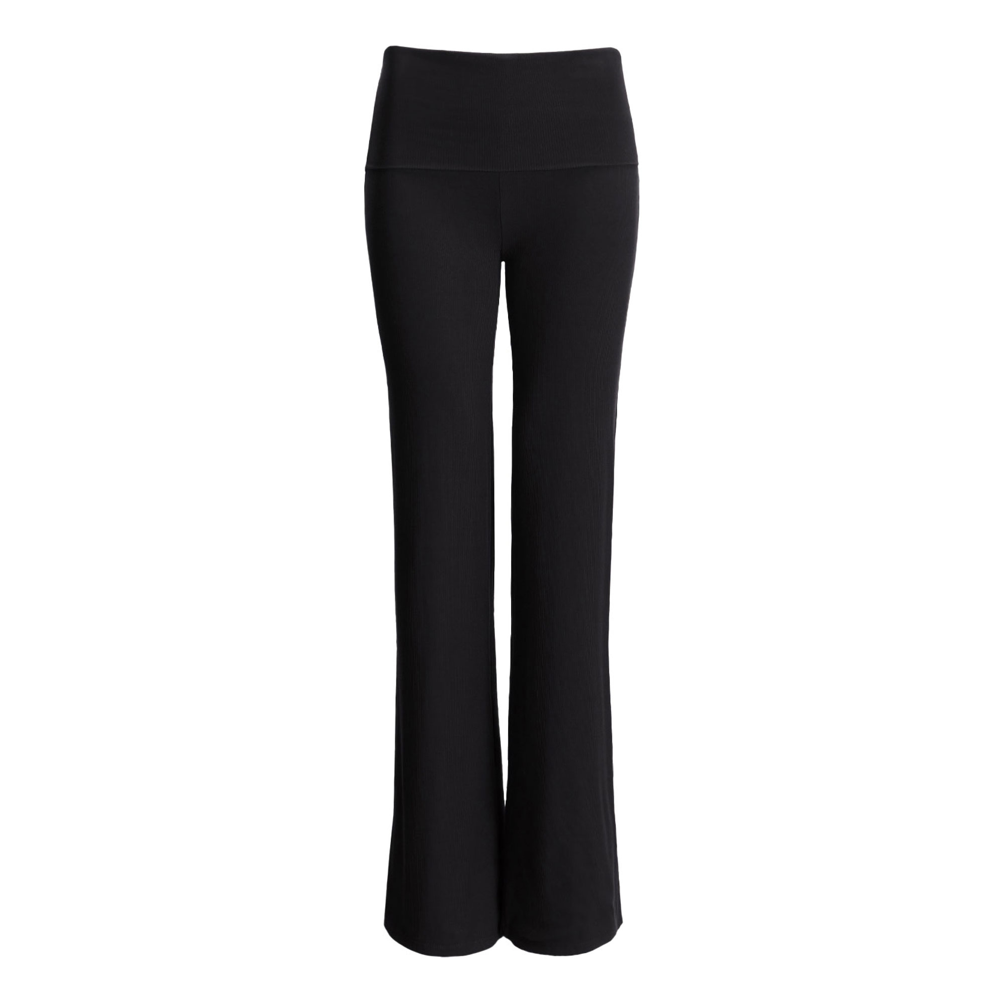 - Double-layer ribbed fabric, flick flare trouser detail, foldable multi-way waist, elasticated waist