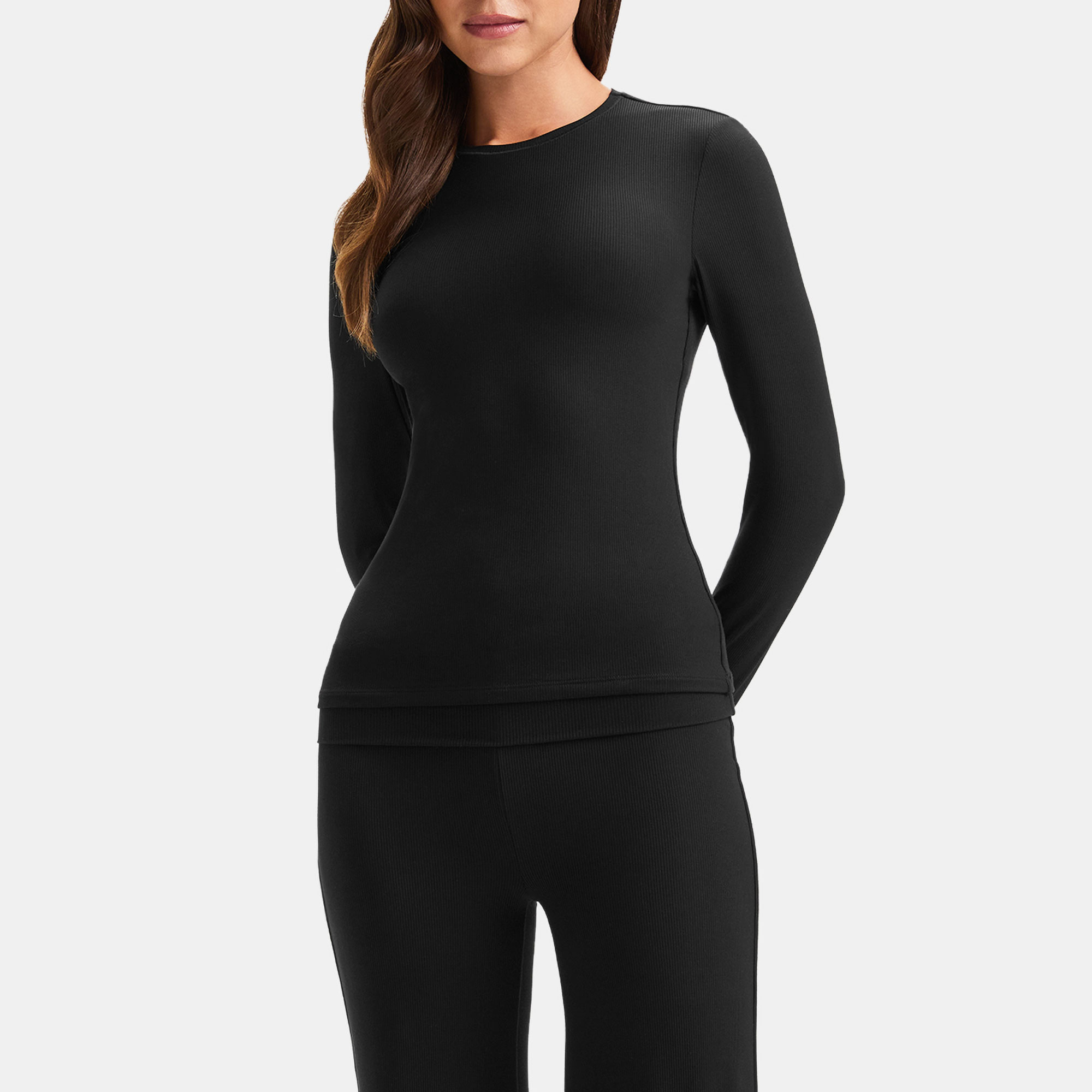 - Ribbed finish, round neck, long sleeves, straight hemline, sculpting and smoothing double-layer fabric
