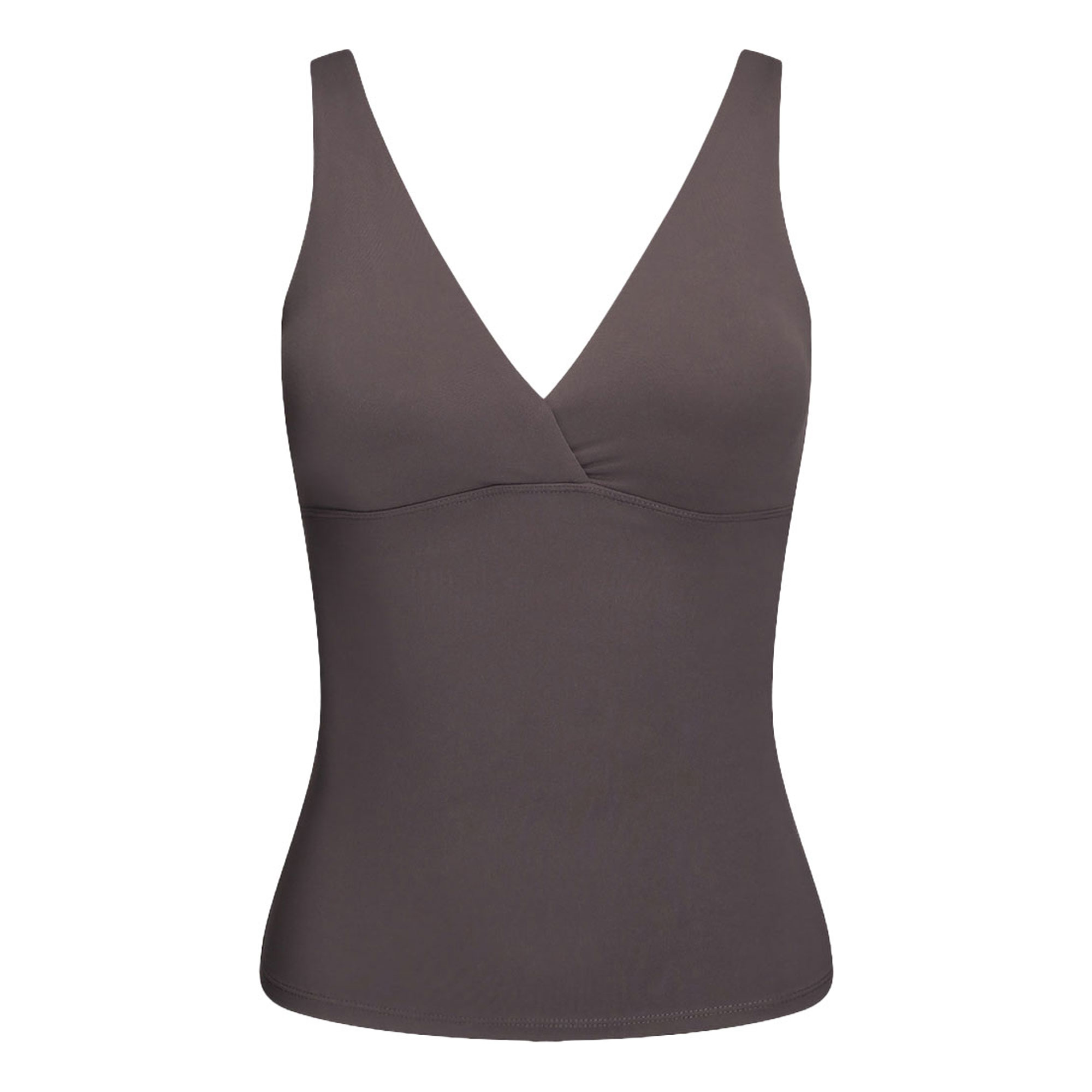 • Wrap front, sleeveless, double layered, embroidered logo, removable pads, internal bra shelf