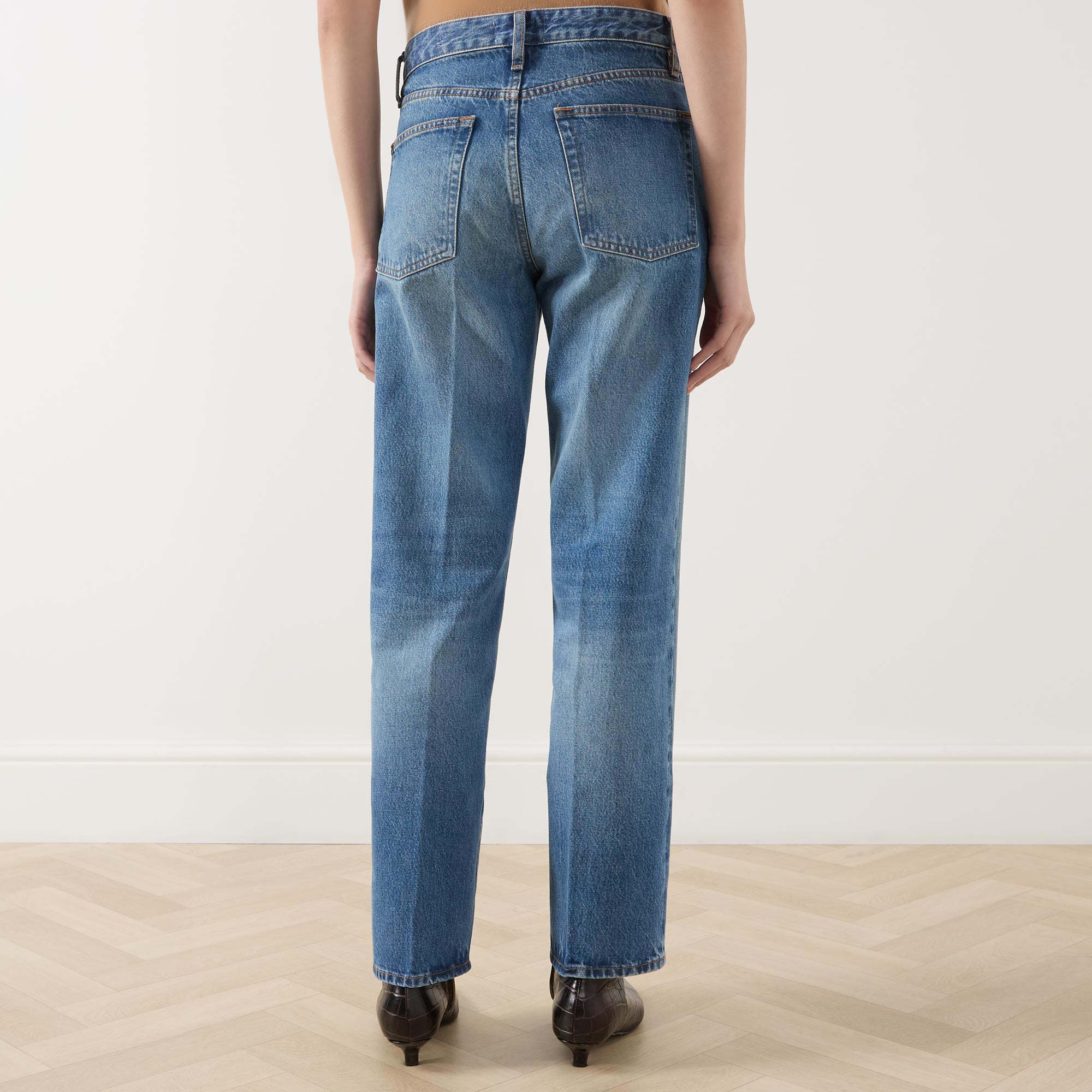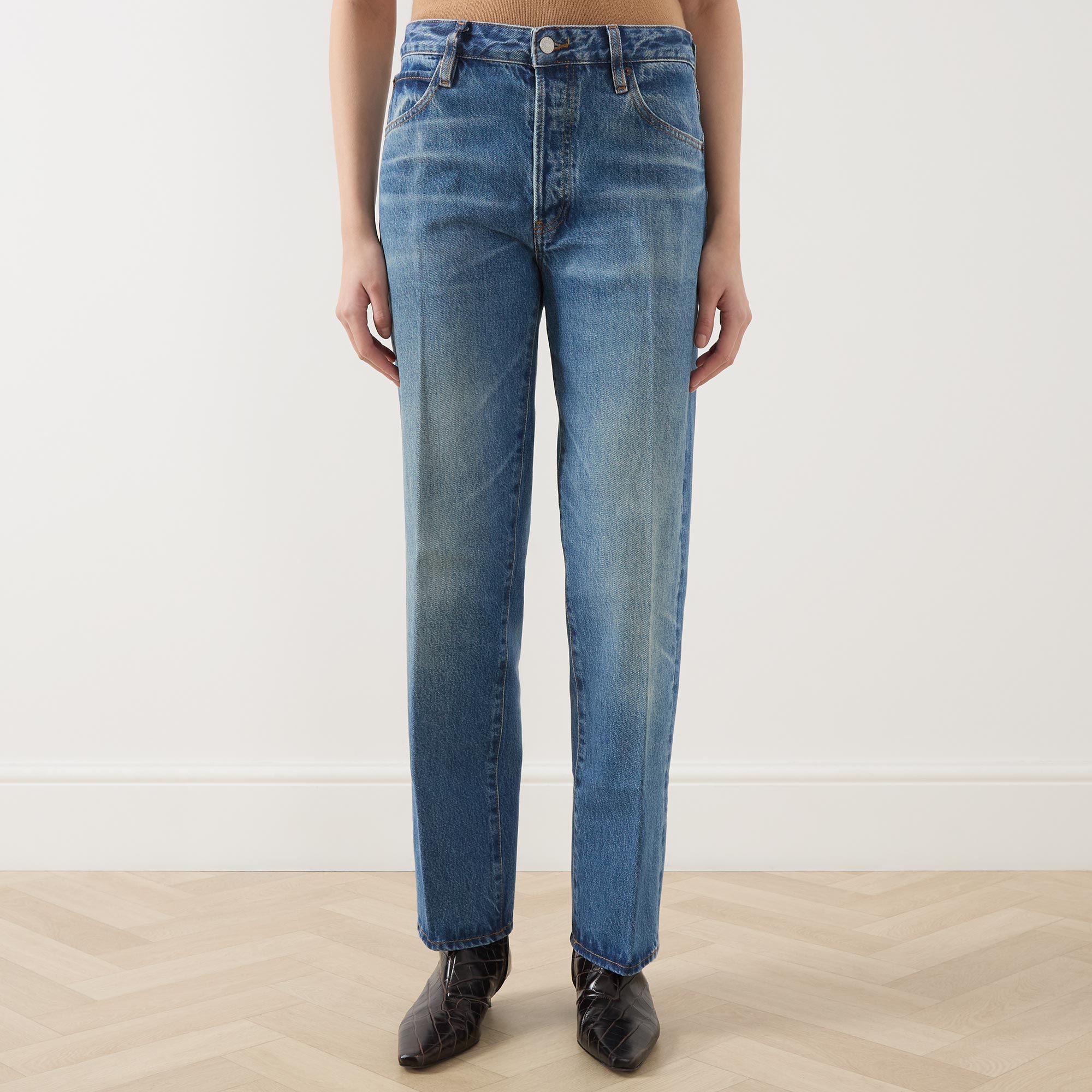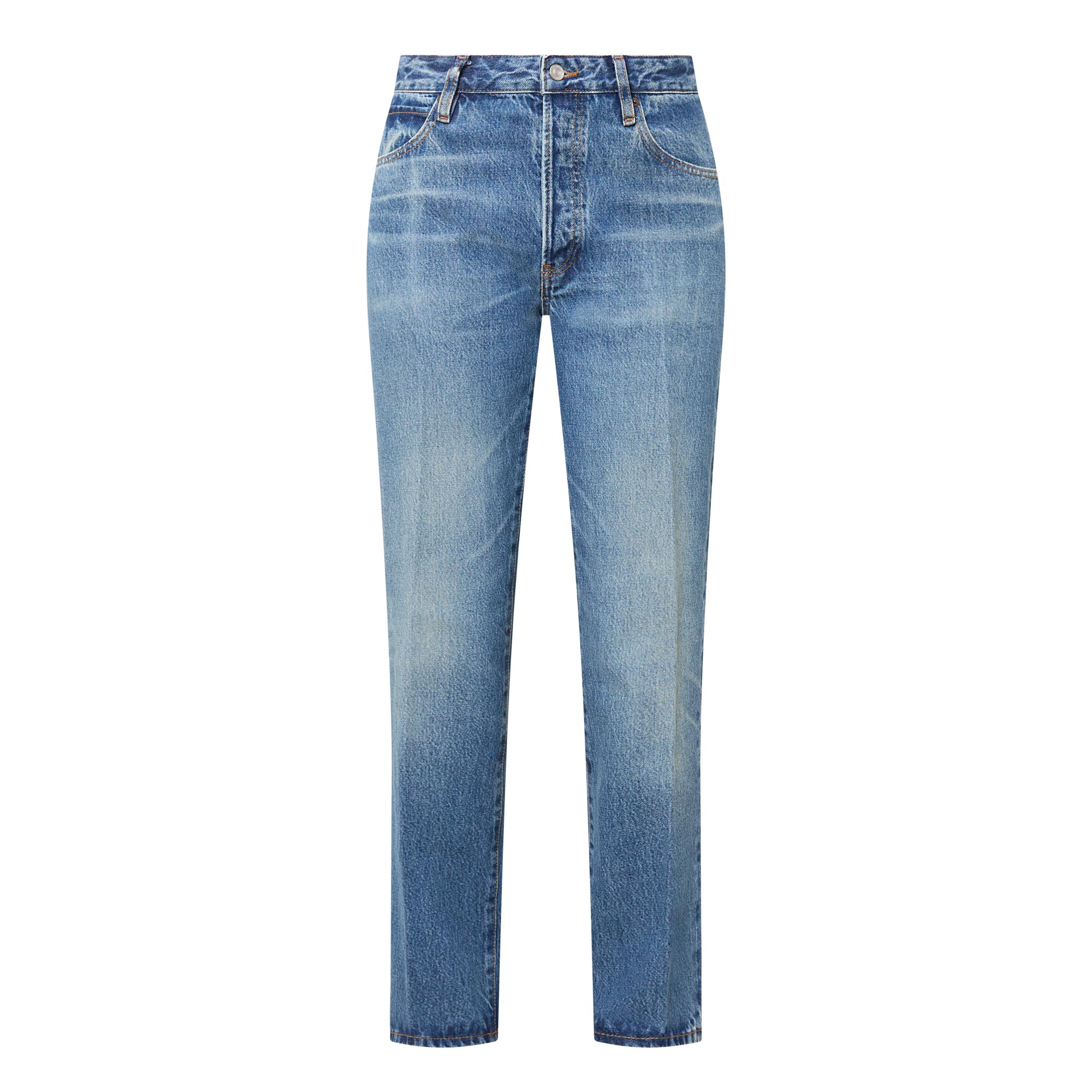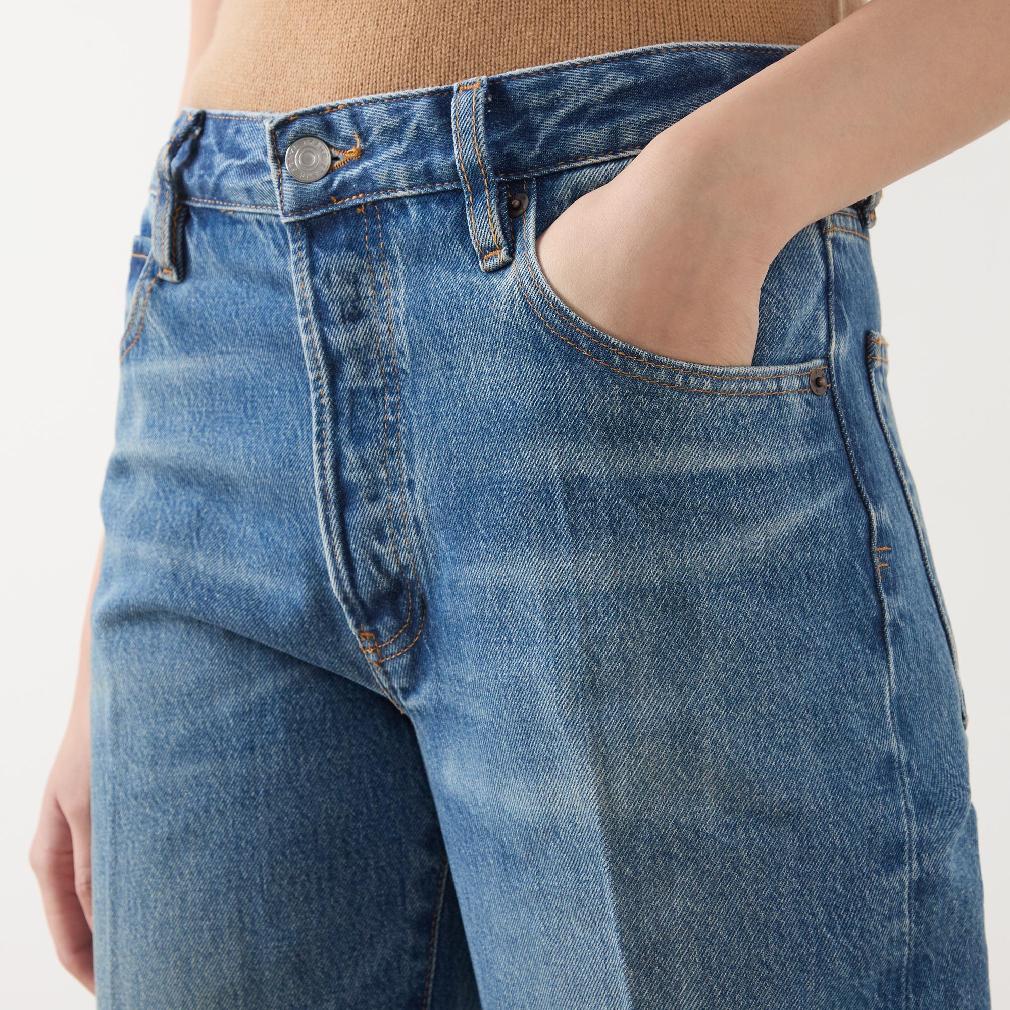 - Mid rise, straight leg, full length, belt loops, concealed fly and button fastening, five-pocket styling, clean hems, pressed creases, tobacco stitching, rigid denim, mid wash finish