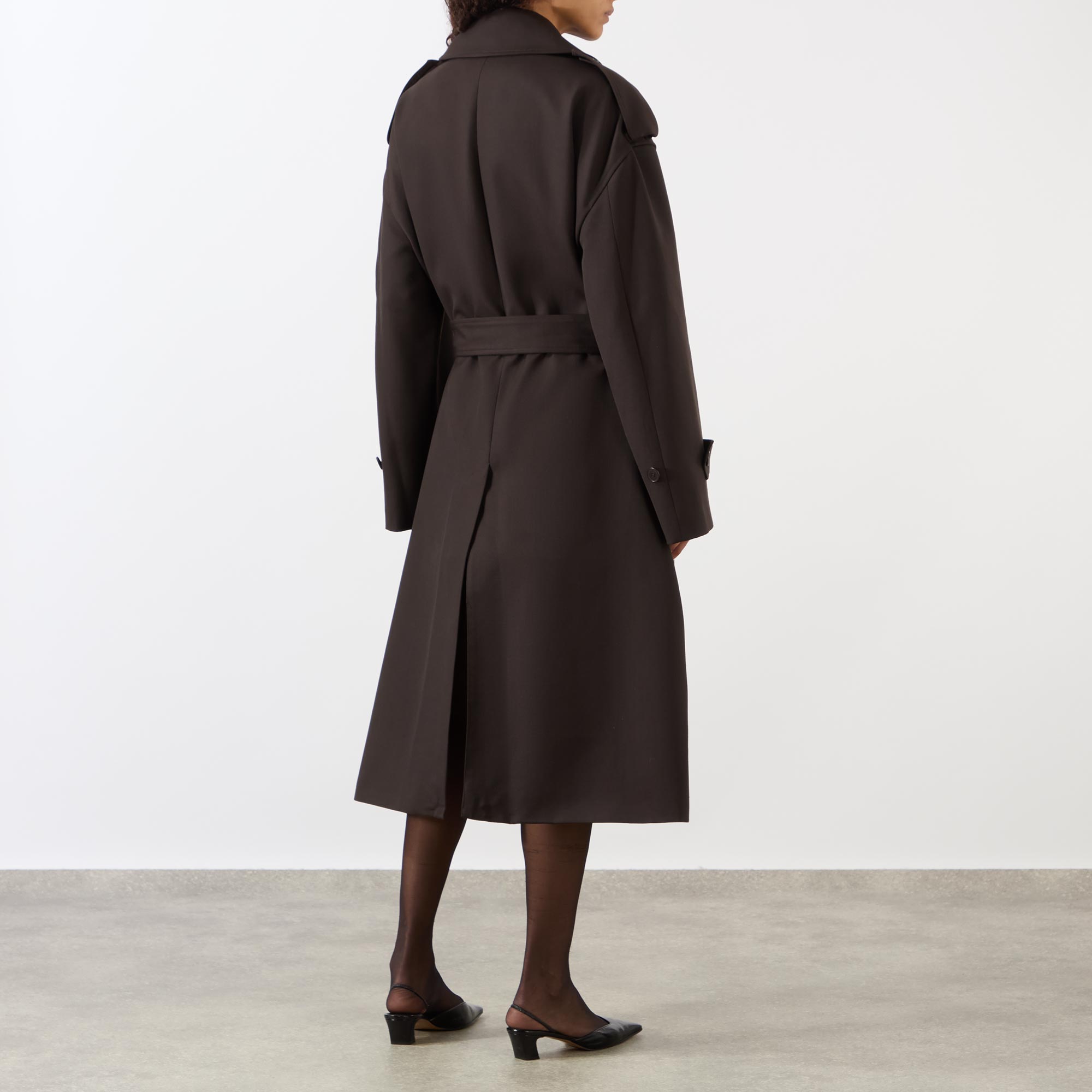 - Relaxed fit, notched lapels, storm flap, shoulder epaulettes, belt loops, detachable fabric belt, interior slip pocket, belted cuffs, front welt pockets, back vent hem