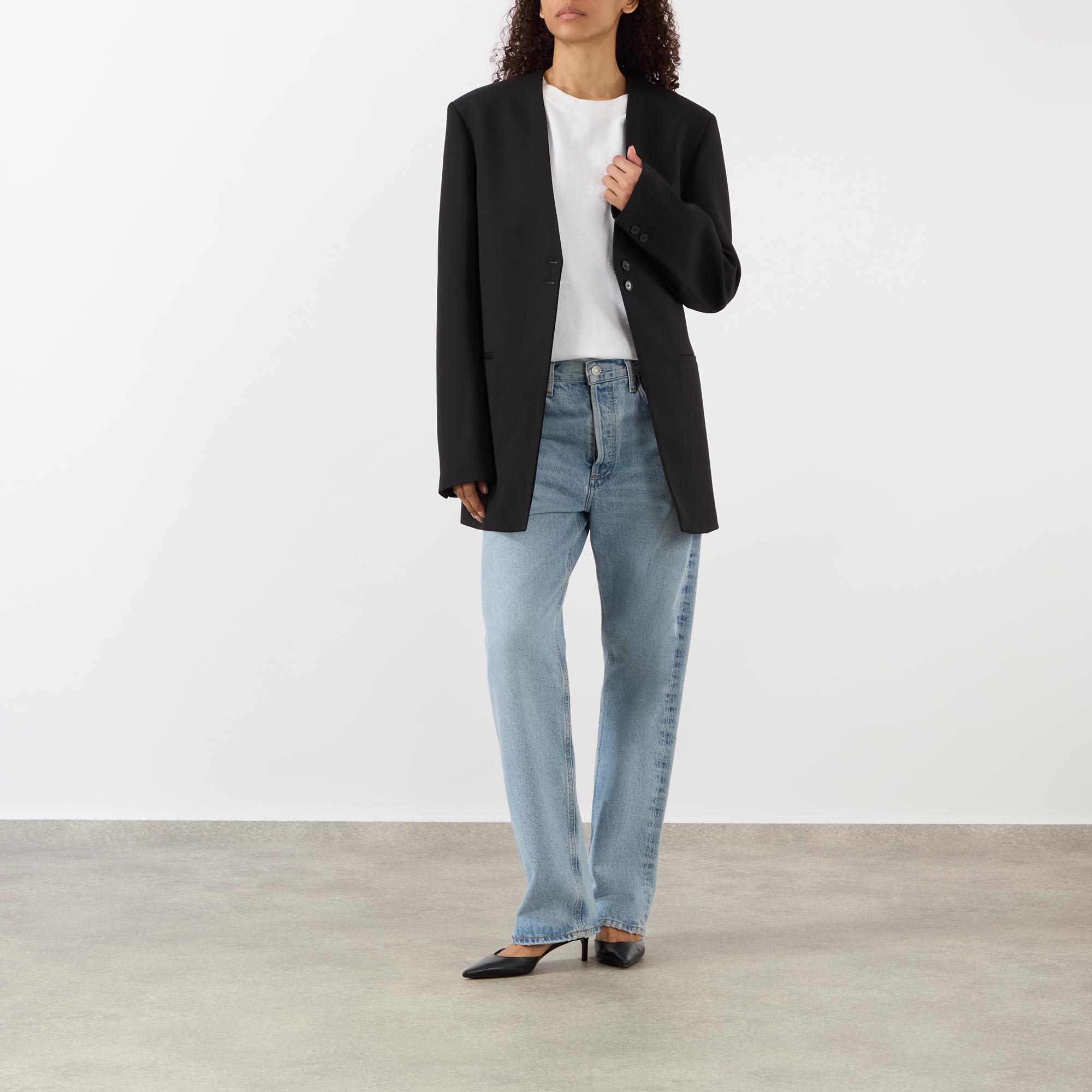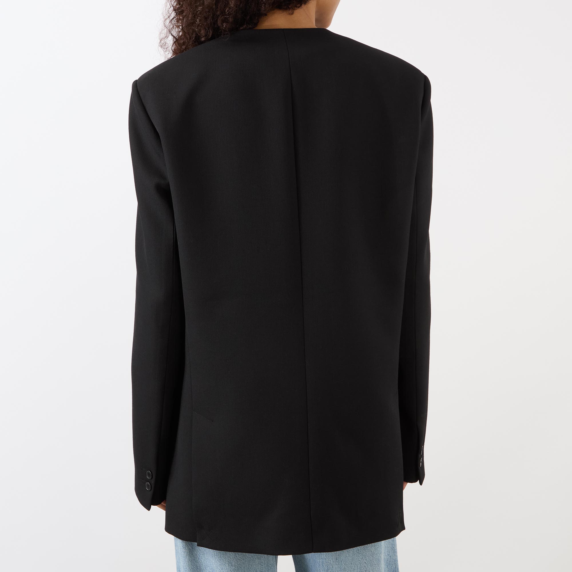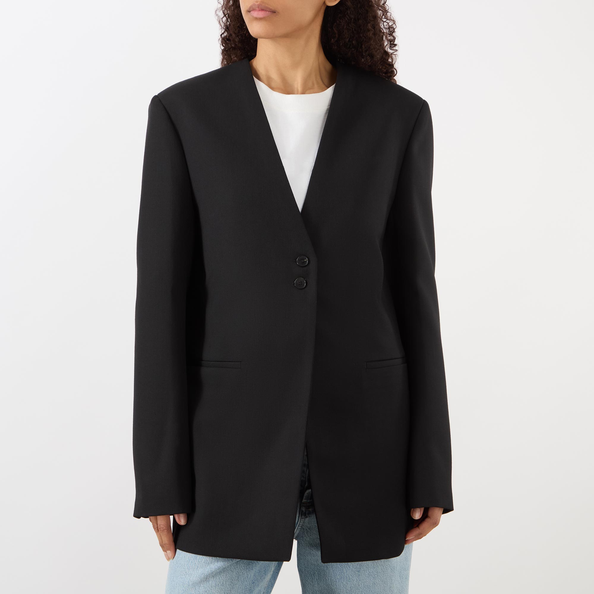 - Single-breasted, collarless, button fastenings, padded shoulders, buttoned cuffs, relaxed fit, front welt pockets, lined