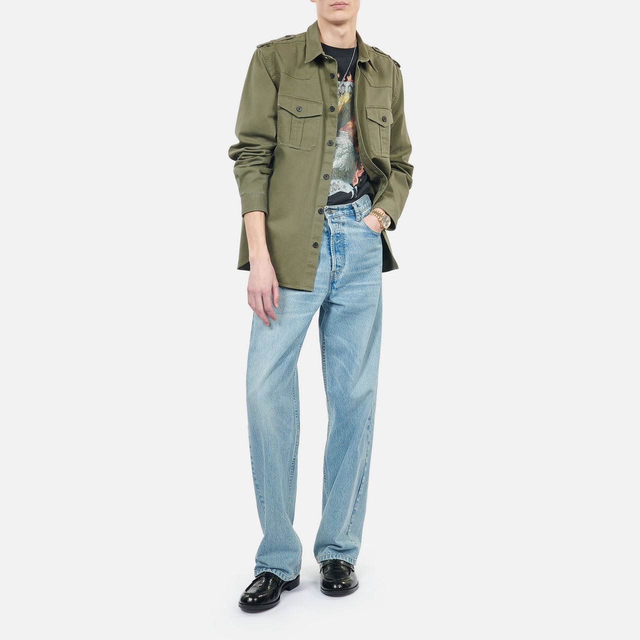 - Straight cut, classic collar, shoulder tabs, long sleeves, buttoned cuffs, flap patch pocket, black horn buttons