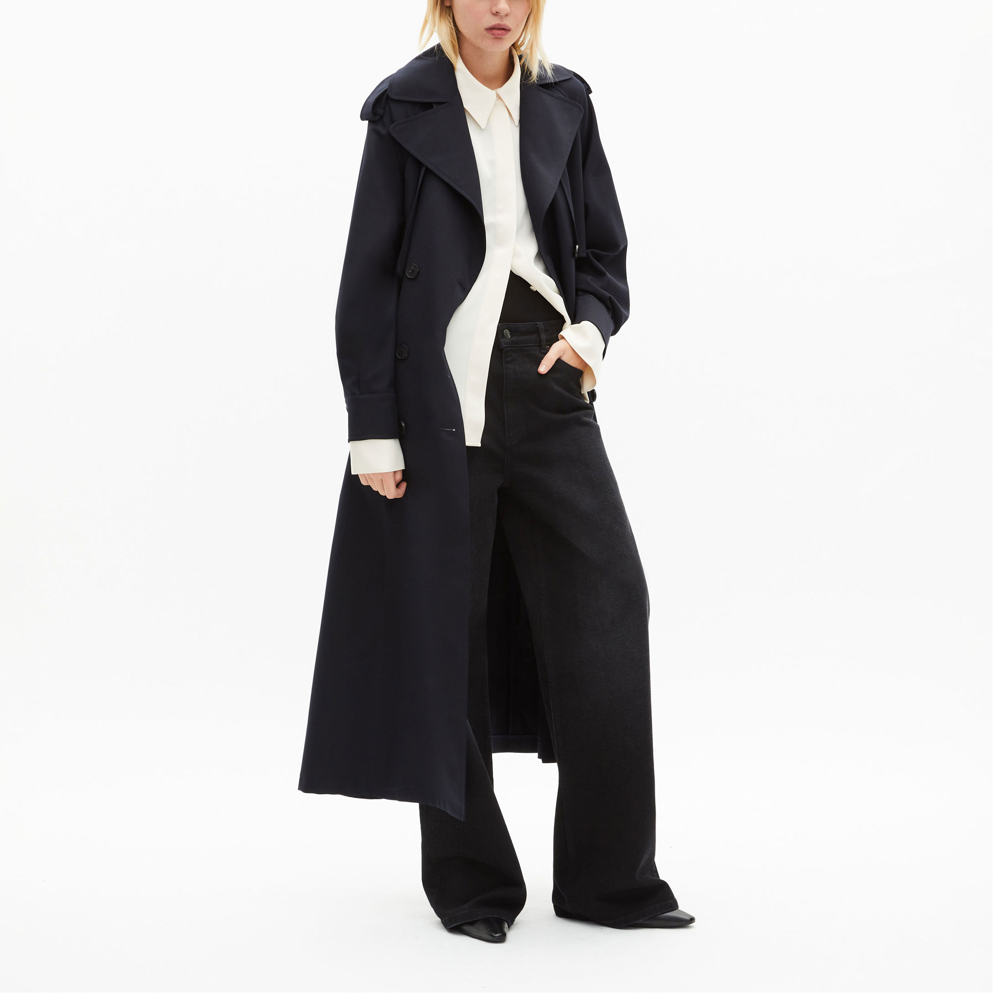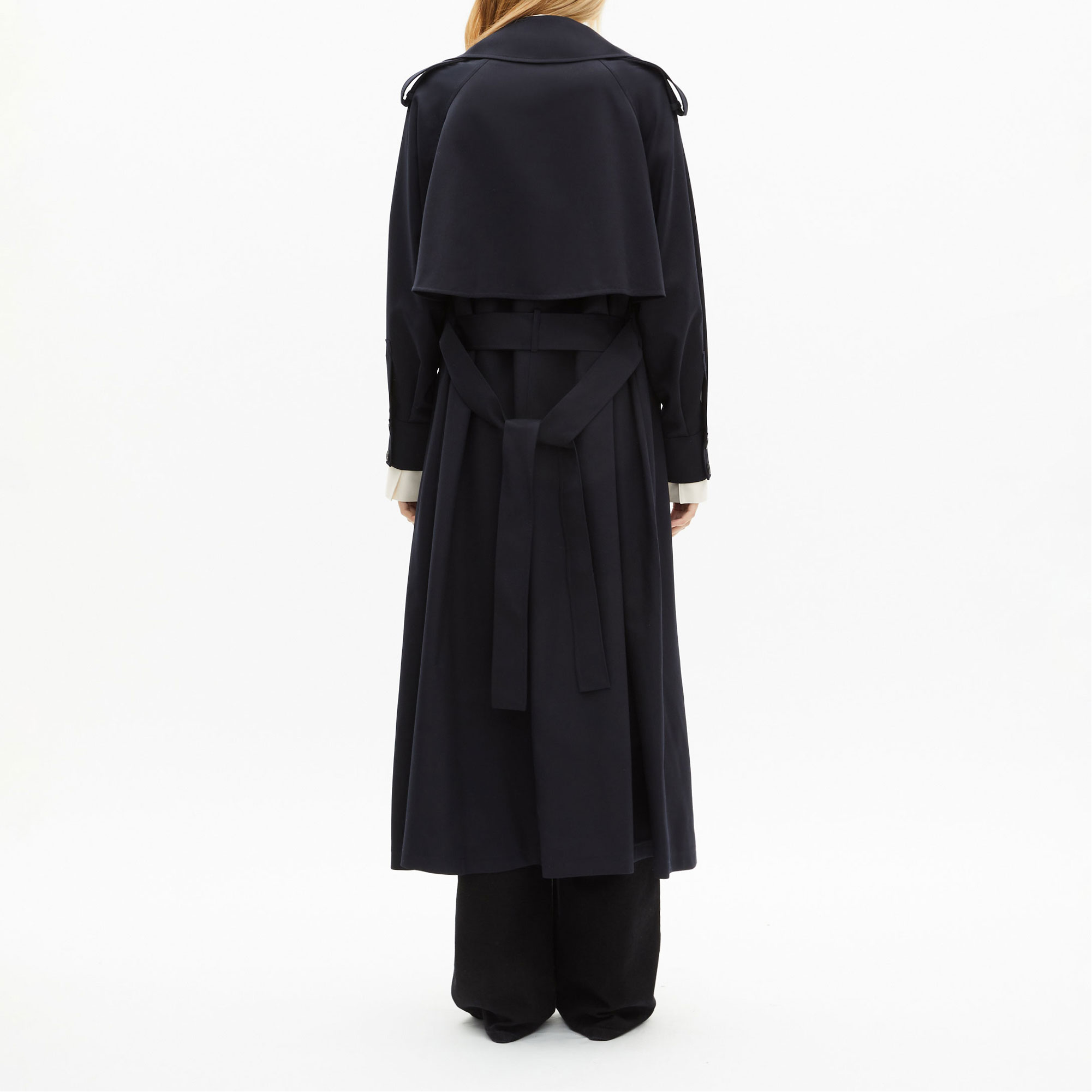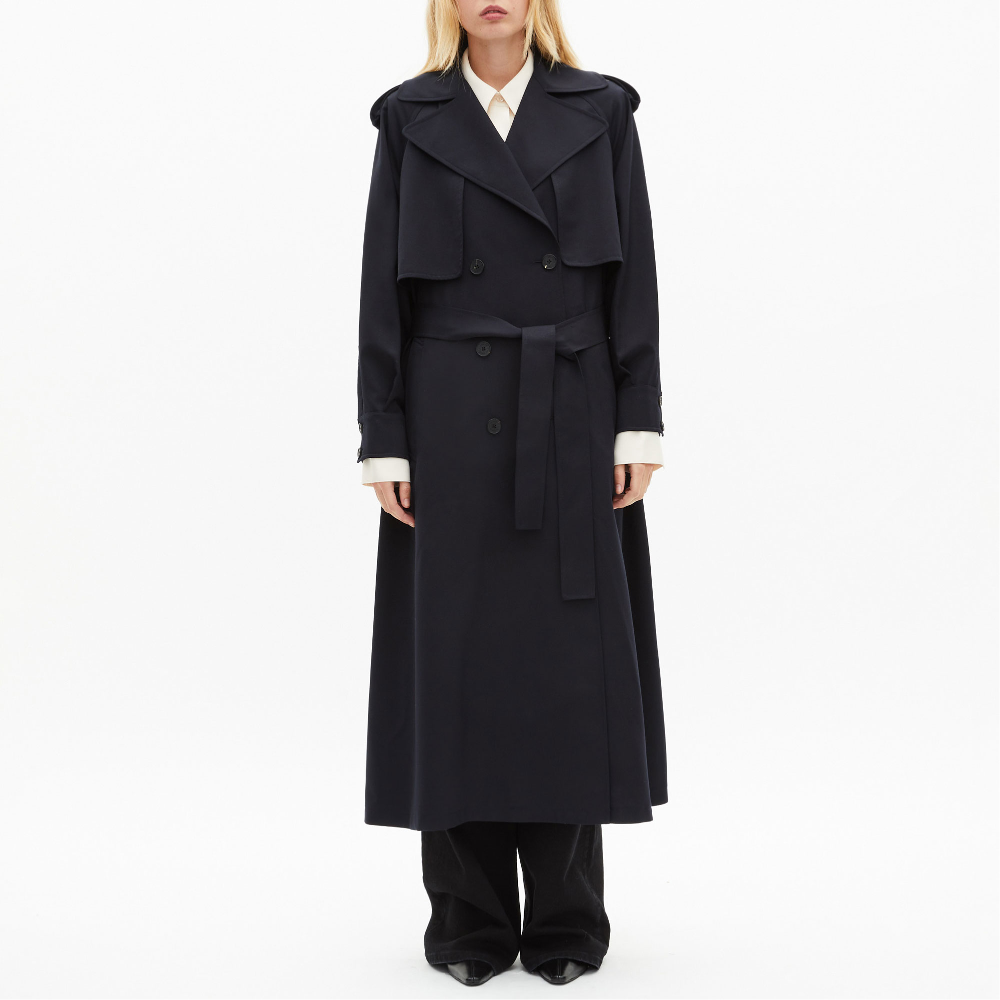 - Trench style, fluid cut, notched collar, double-breasted button fastening, belted waist