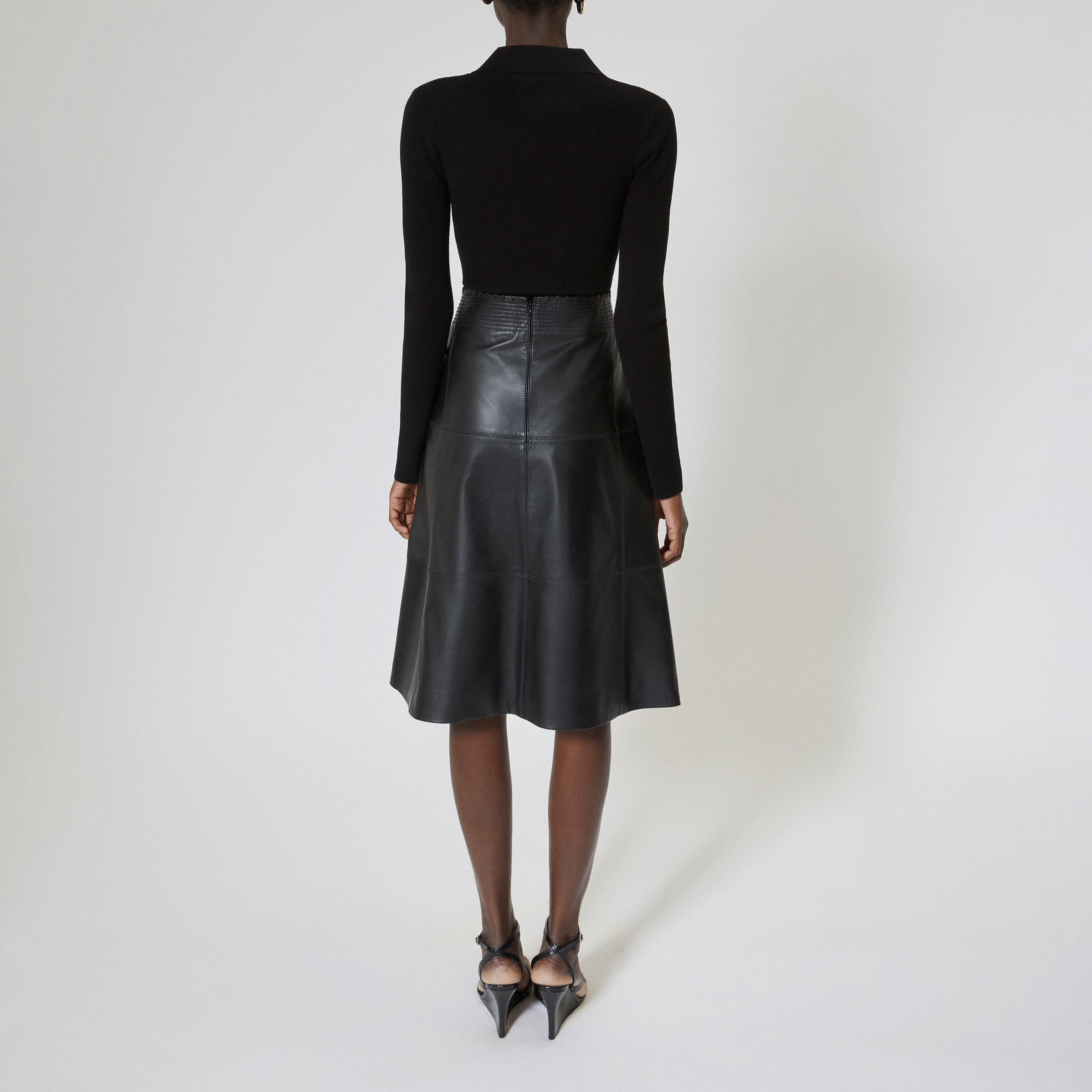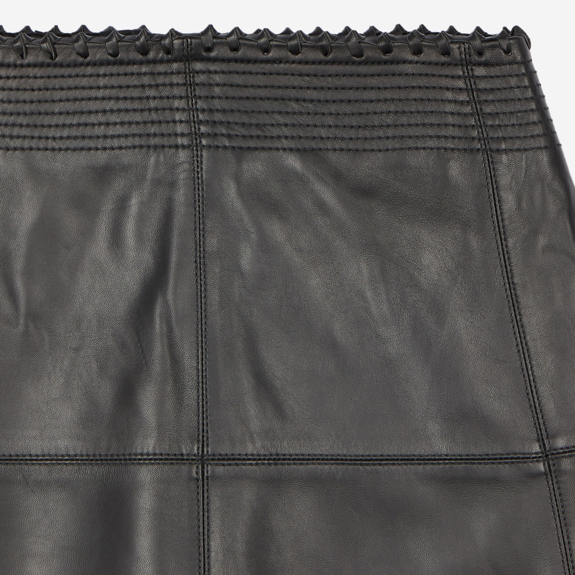 - Flared cut, stitching details, edges with leather lacing details, invisible zip and staple