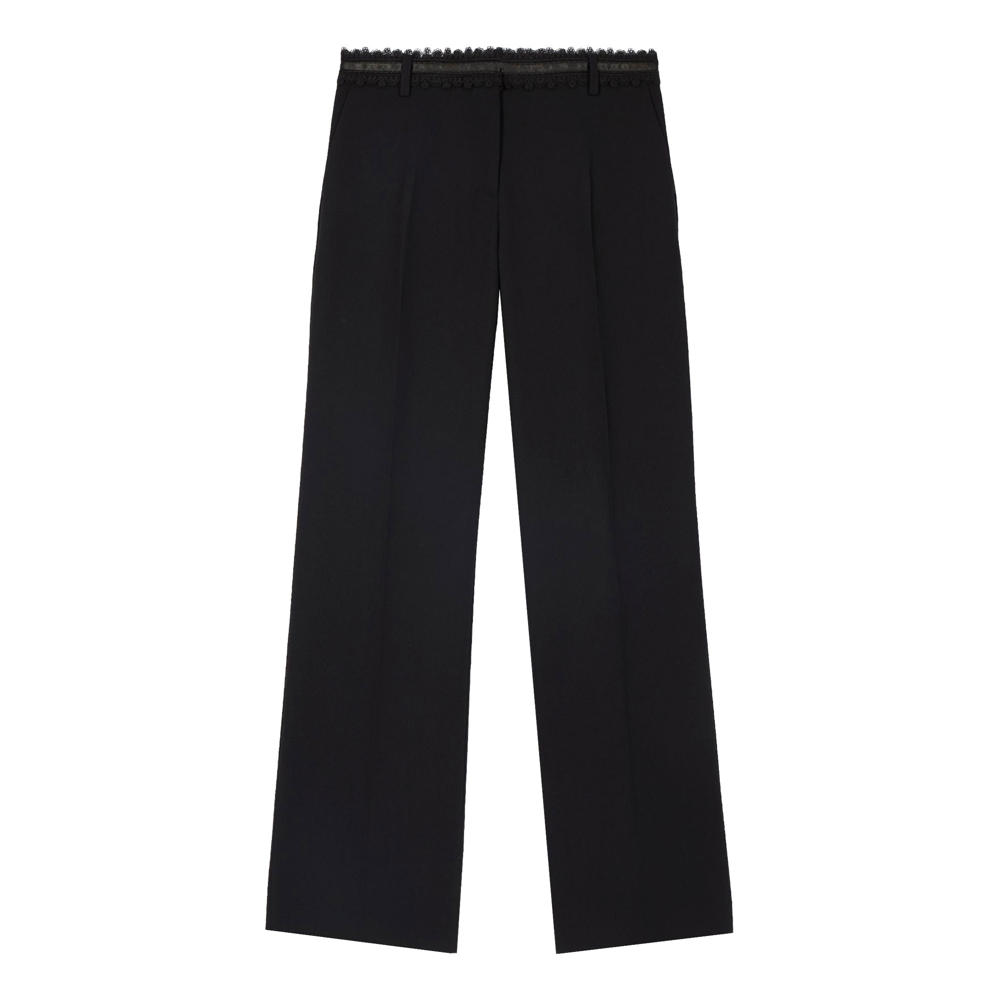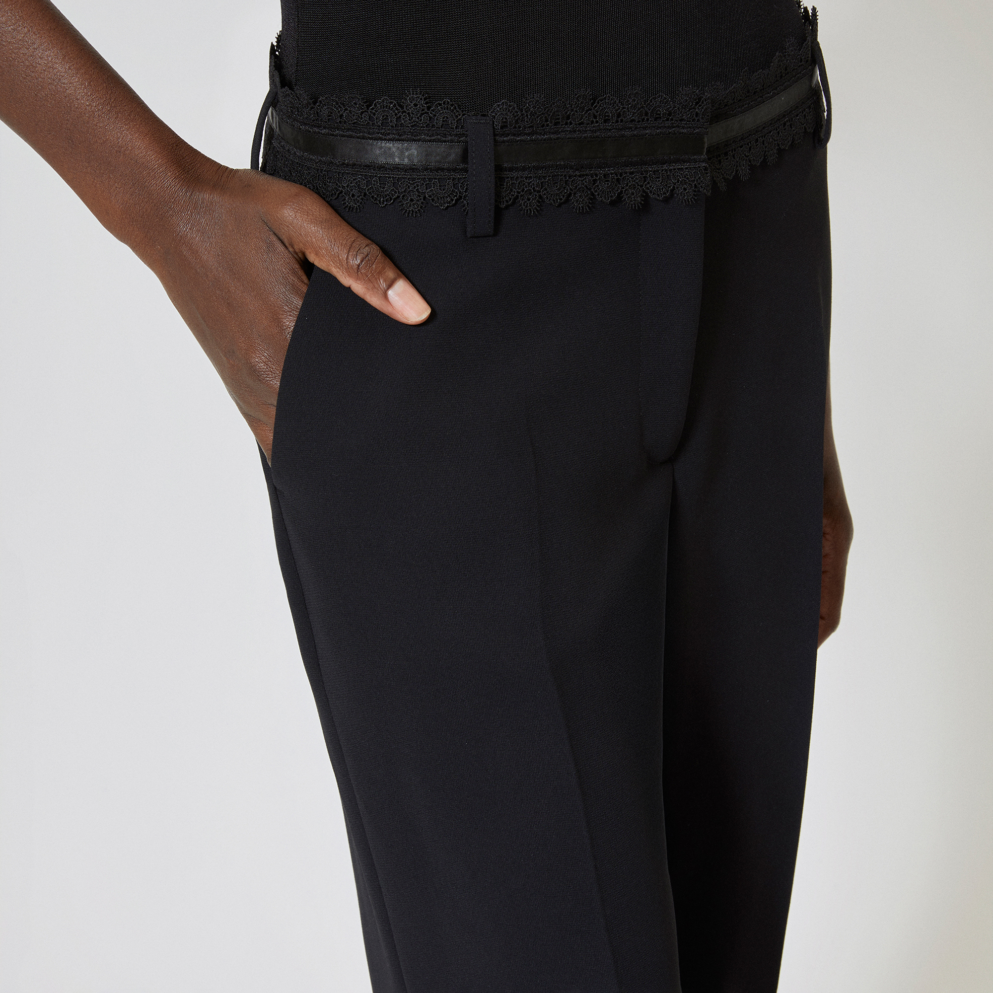 - Wide leg, medium waistband with belt loops, zip closure with reminder button and staple, mounted waistband with lace detail, italian side pockets, welt back pockets