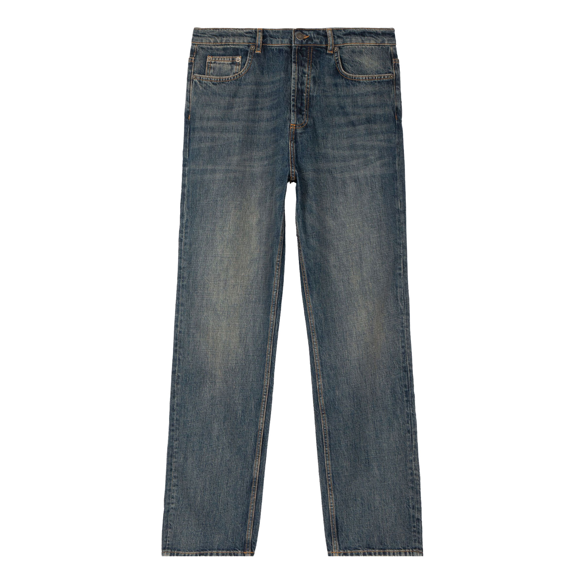 - Straight leg, mid-rise with belt loops, button closure, five pockets