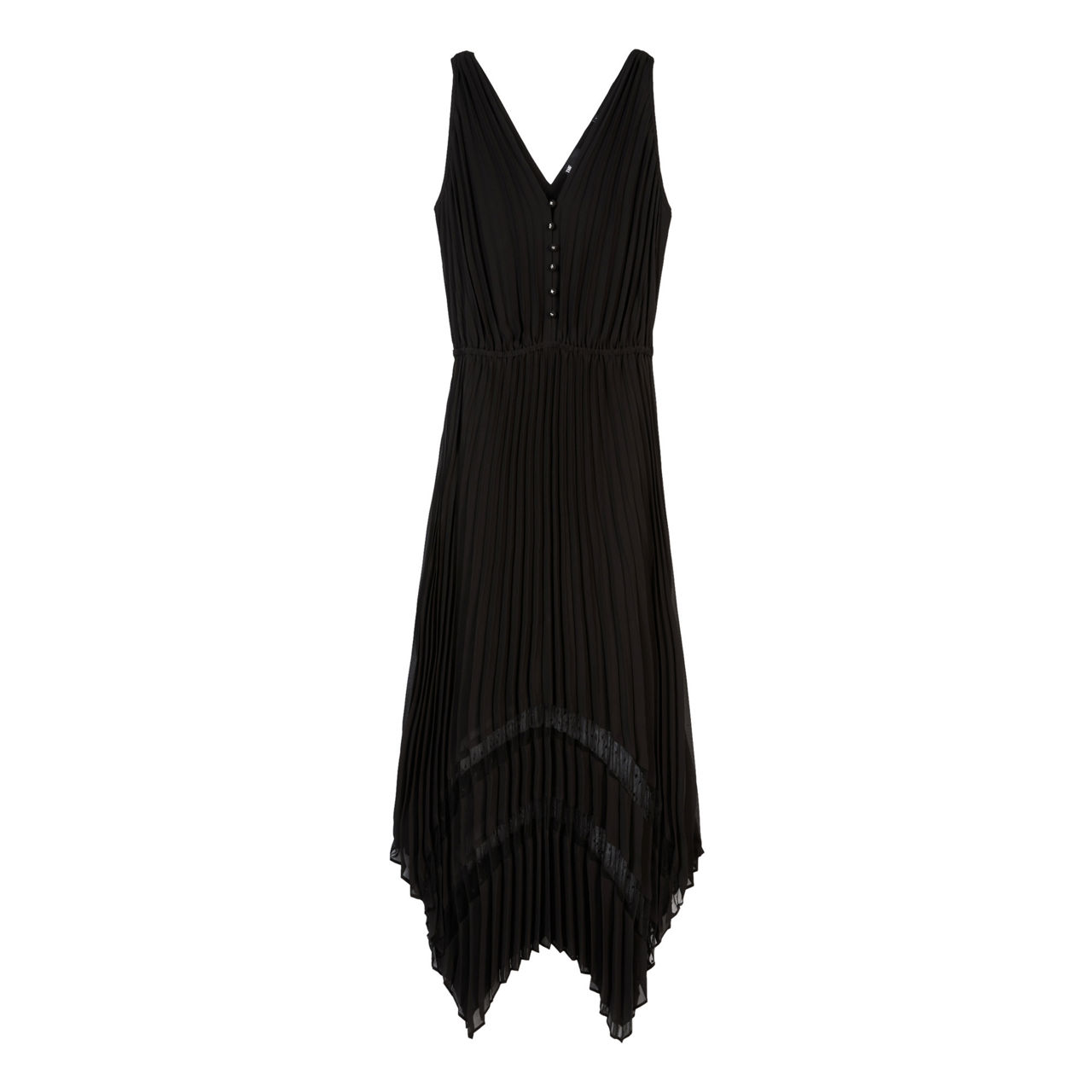 - Pleated, V-neckline with partial button placket, sleeveless, elasticated waistband, asymmetrical hemline with sheer plumetis detailing, lined, midi length