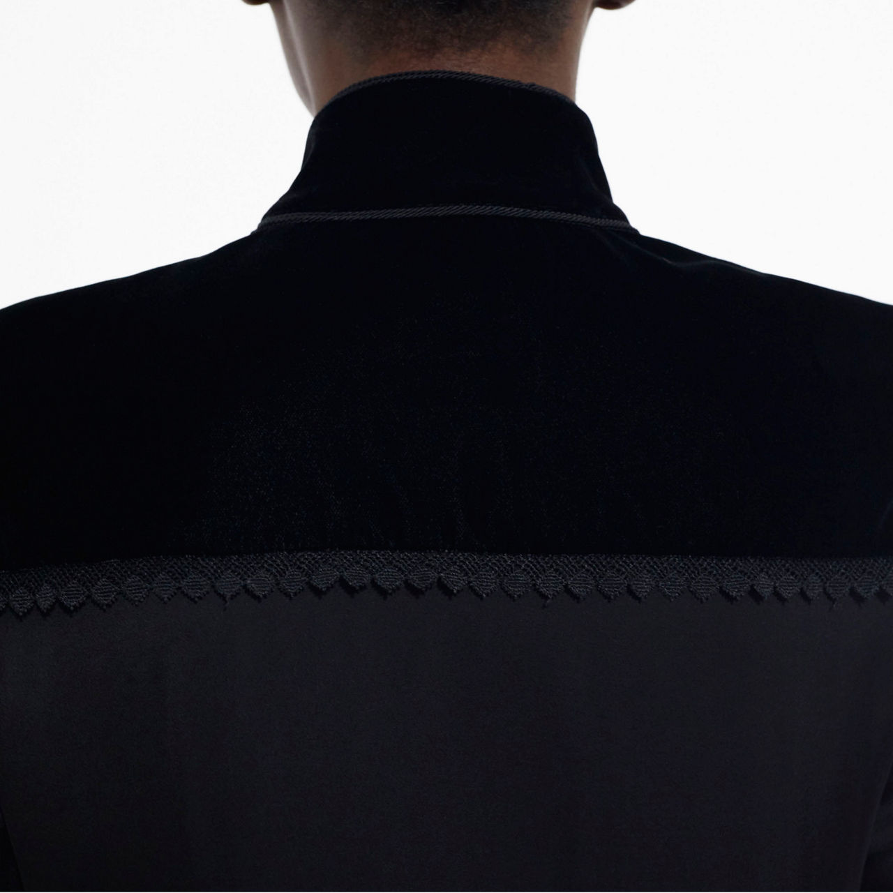 • Relaxed fit, stand collar, button placket, lace detail at shoulders.