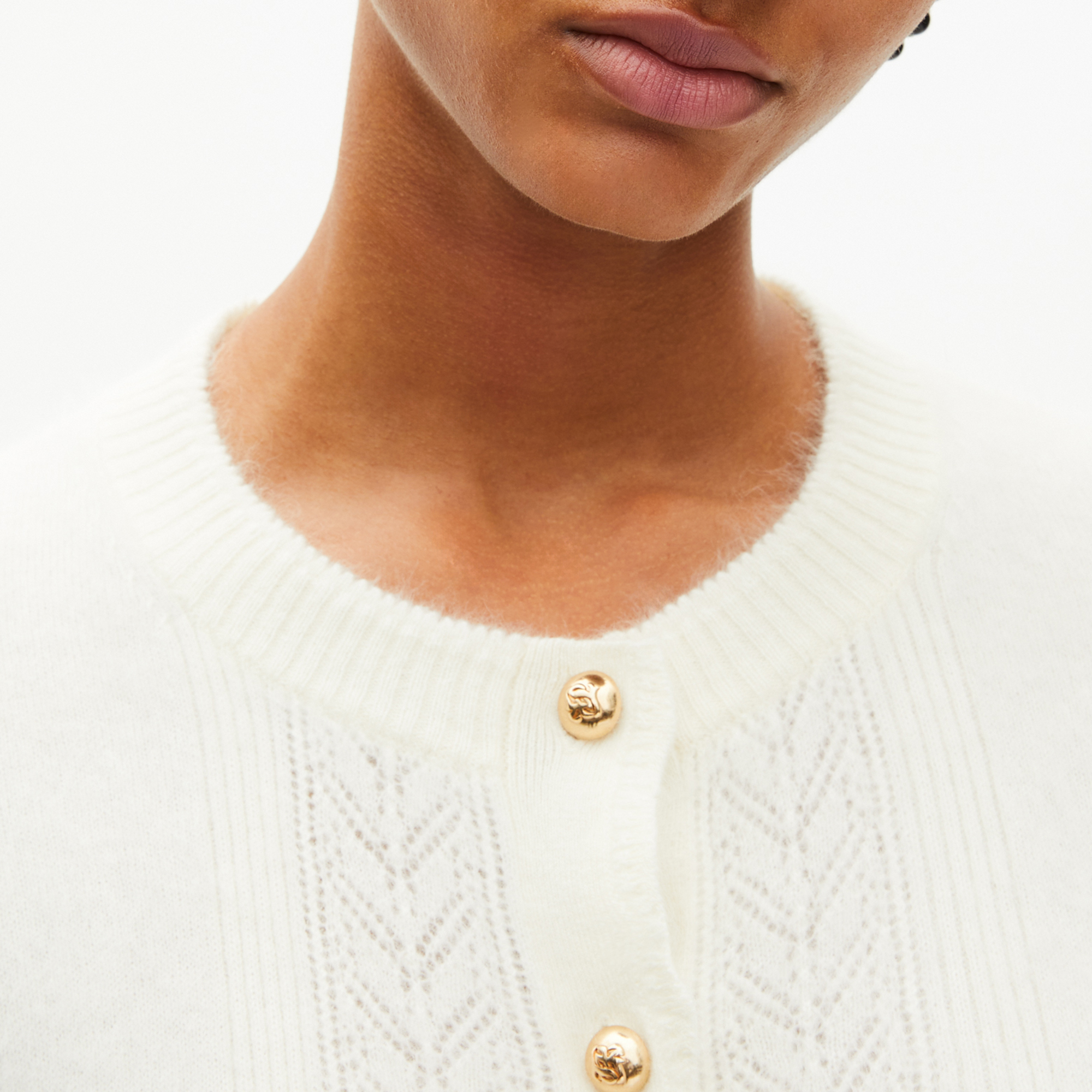 - Round neckline, ribbed trims, gold button fastening, scalloped button placket, straight cut, knit construction, super-soft finish