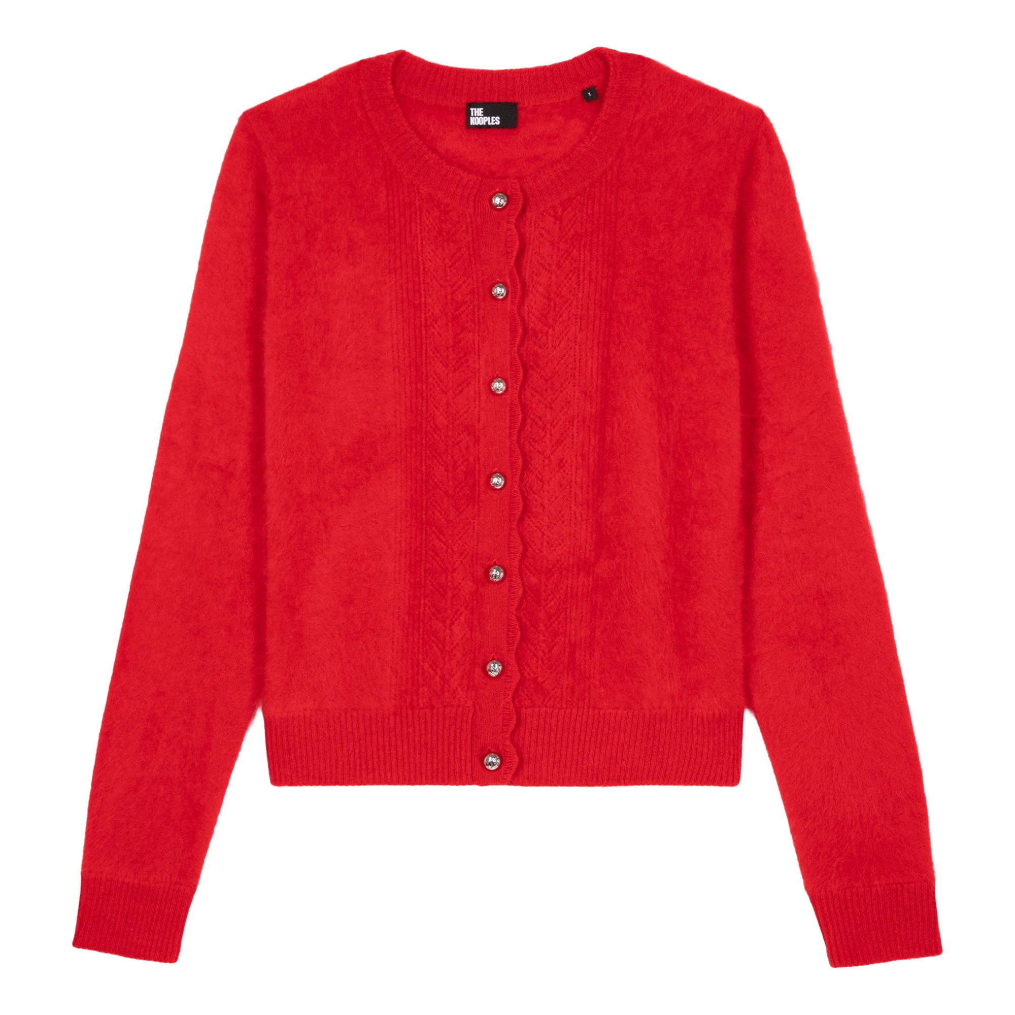 - Round neckline, ribbed trims, gold button fastening, scalloped button placket, straight cut, knit construction, super-soft finish