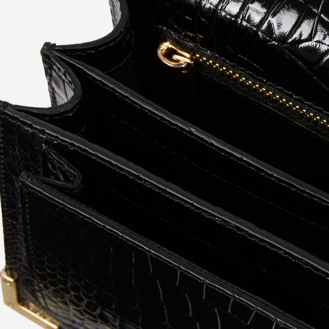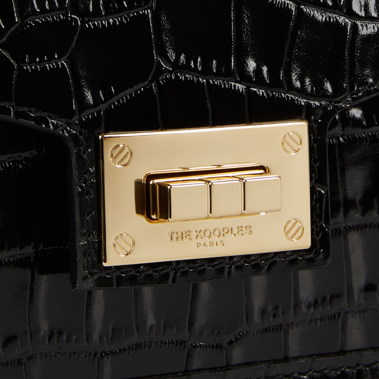 - Twist lock closure with branded clasp, croc-effect leather finish, top handle, gold-tone hardware, fold-over flap, external rear patch pocket, removable leather shoulder strap
