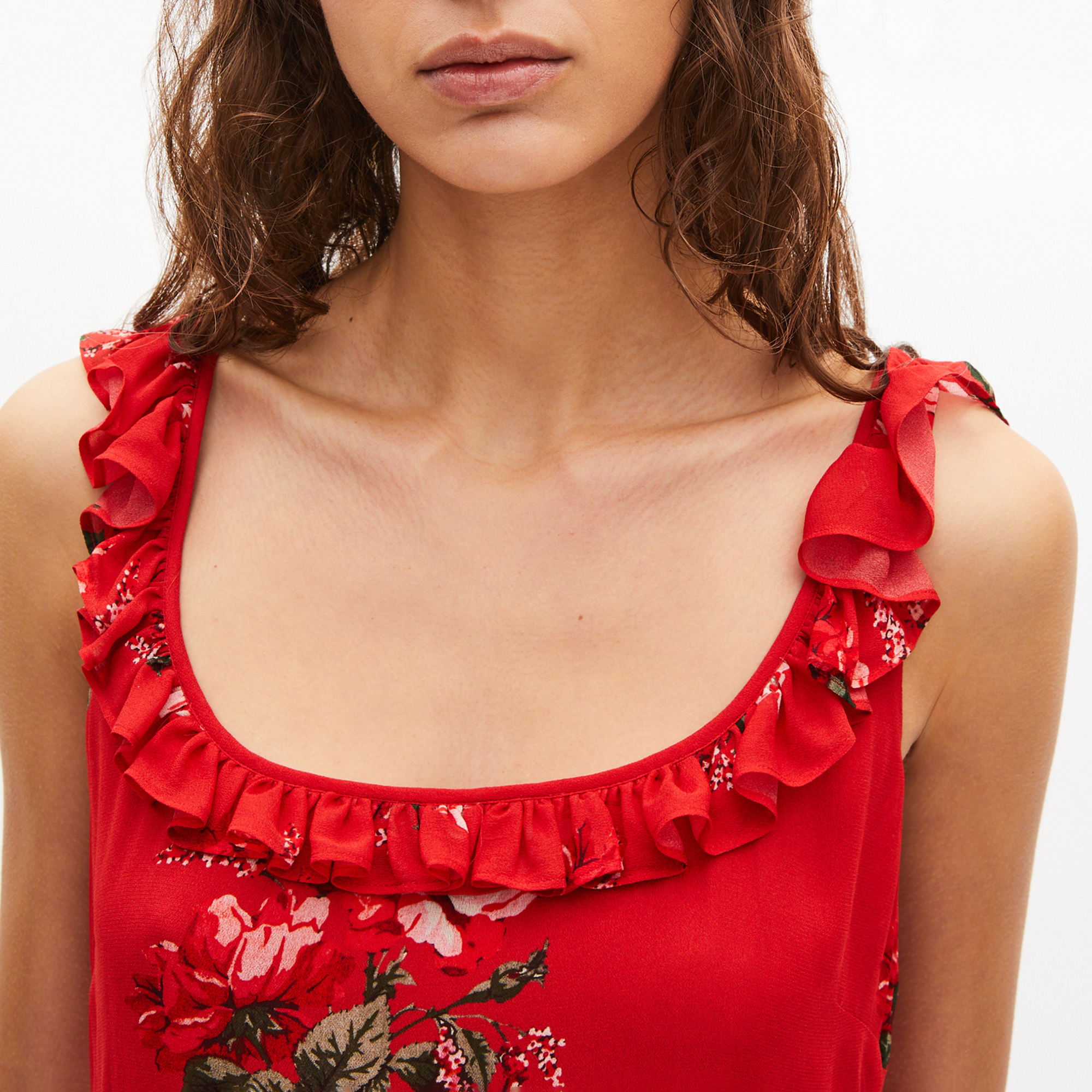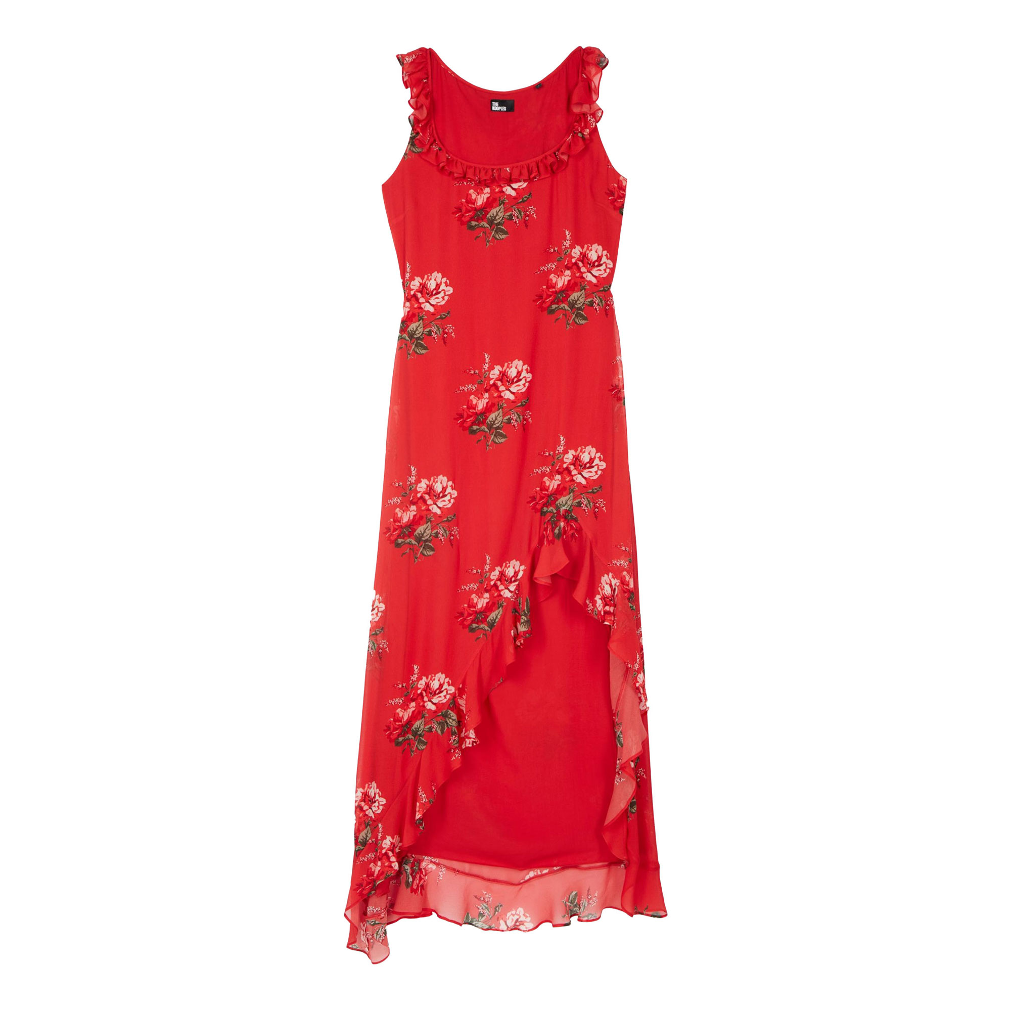 - Flower print, fitted cut, square neckline, straps with ruffles, euffled asymmetrical bottom, invisible zip closure