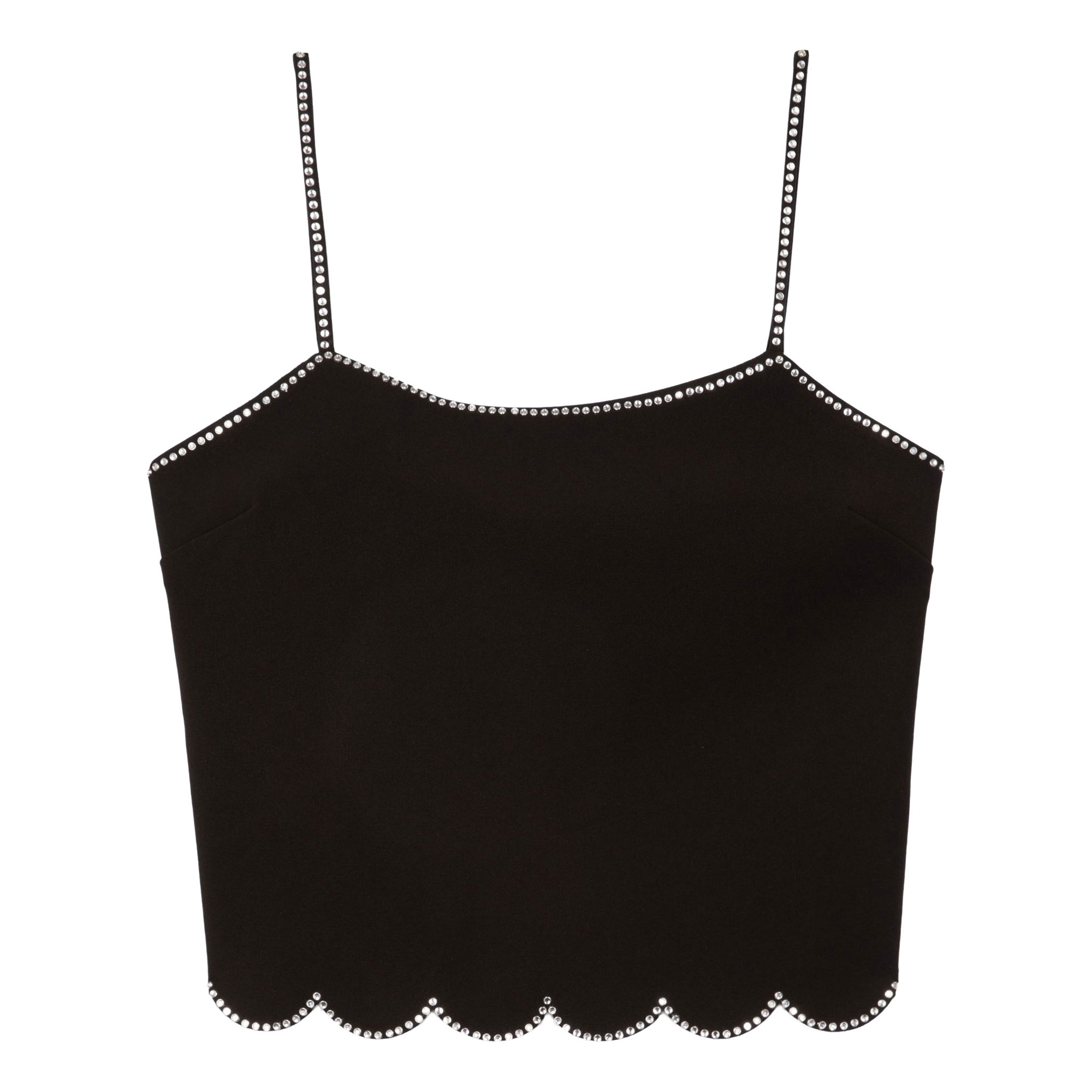 - Straight neckline, narrow straps, scalloped hem, cropped length, rhinestone detailing throughout