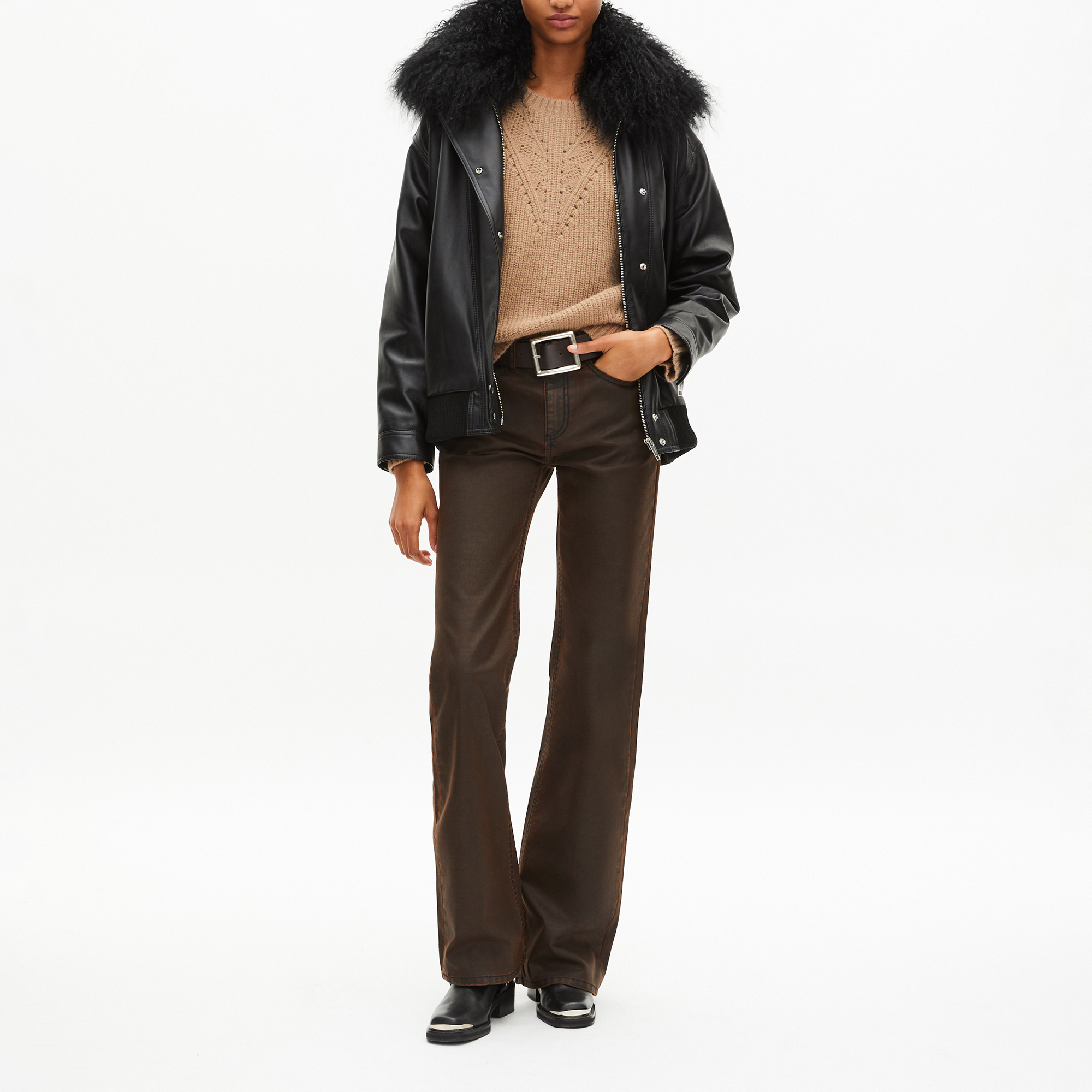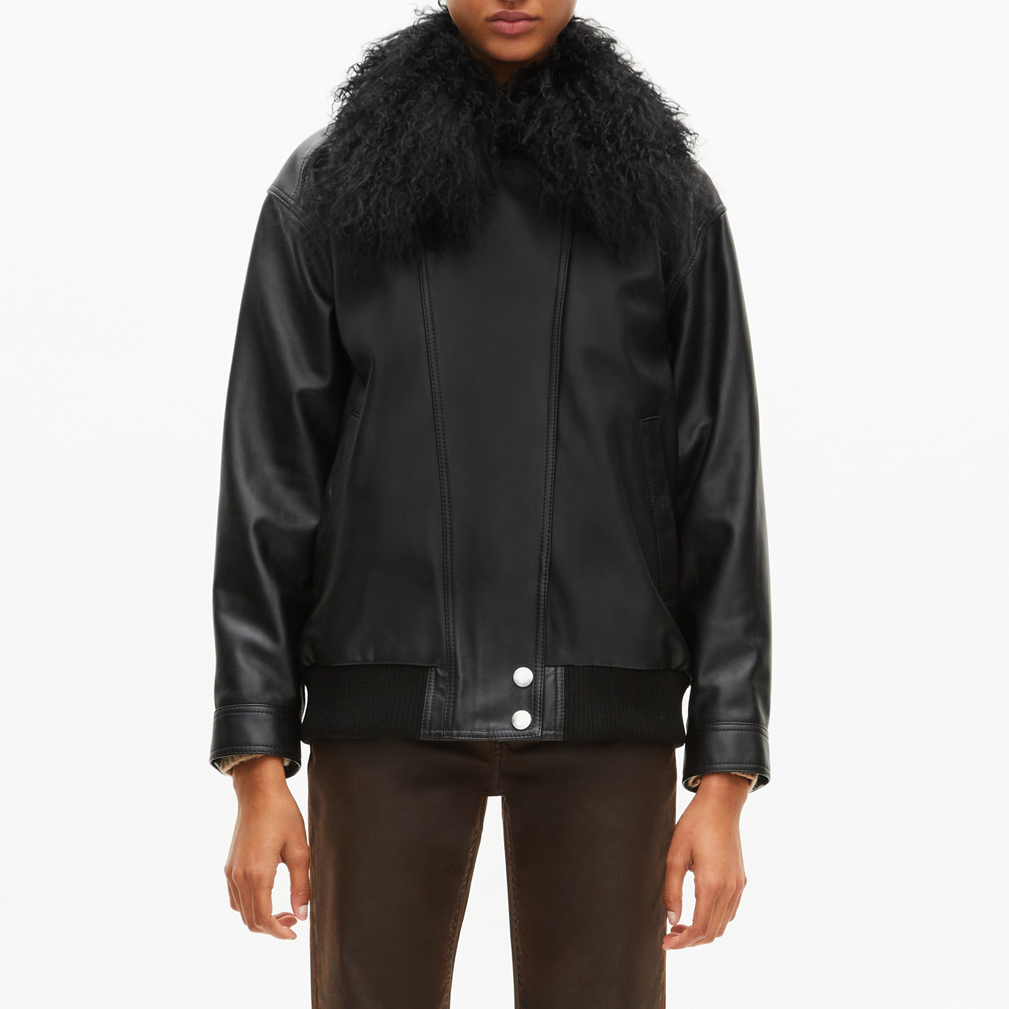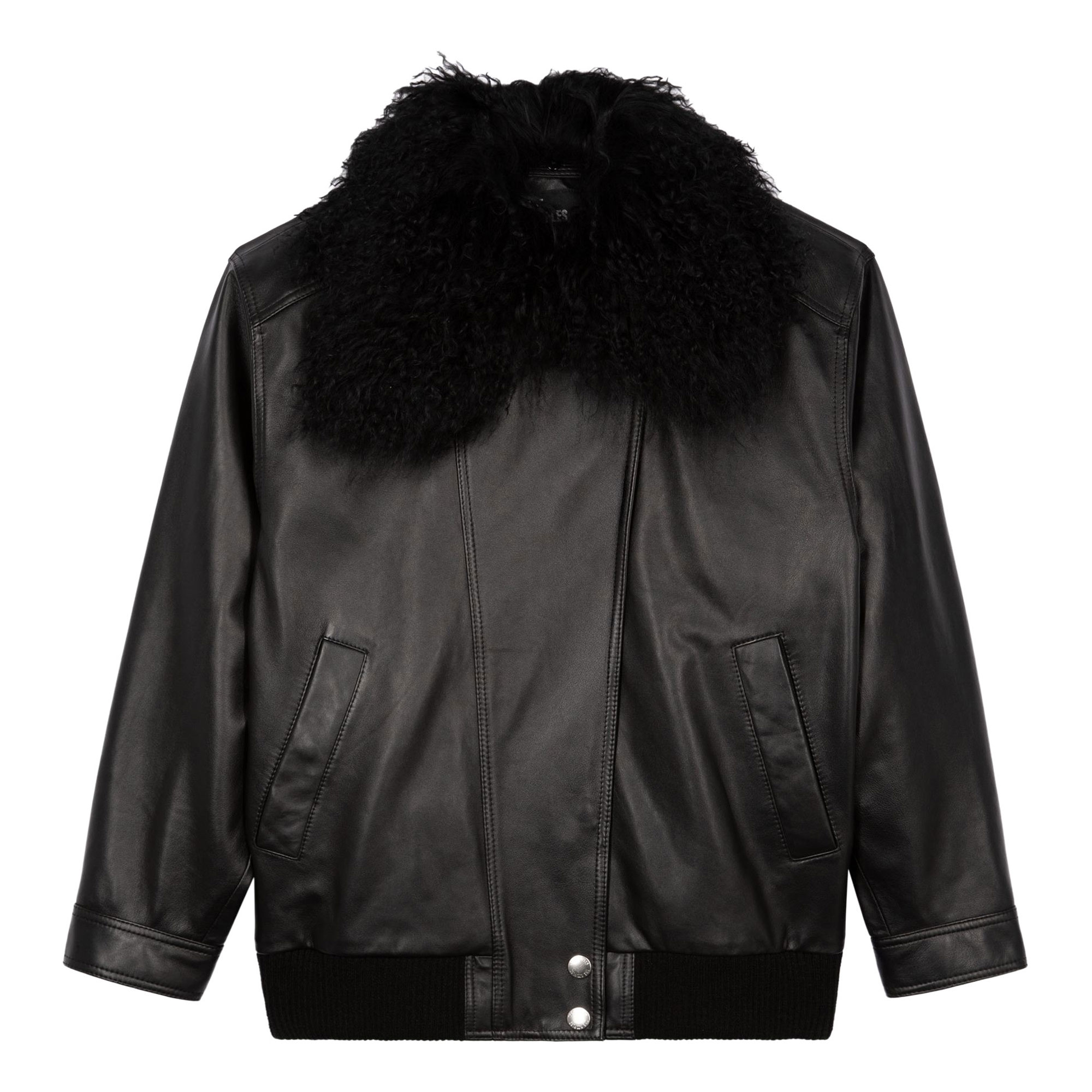 - Removable fur-effect collar, zip and snap fastening, long sleeves with snap cuffs, welt side pockets, ribbed trims, sheepskin leather finish
