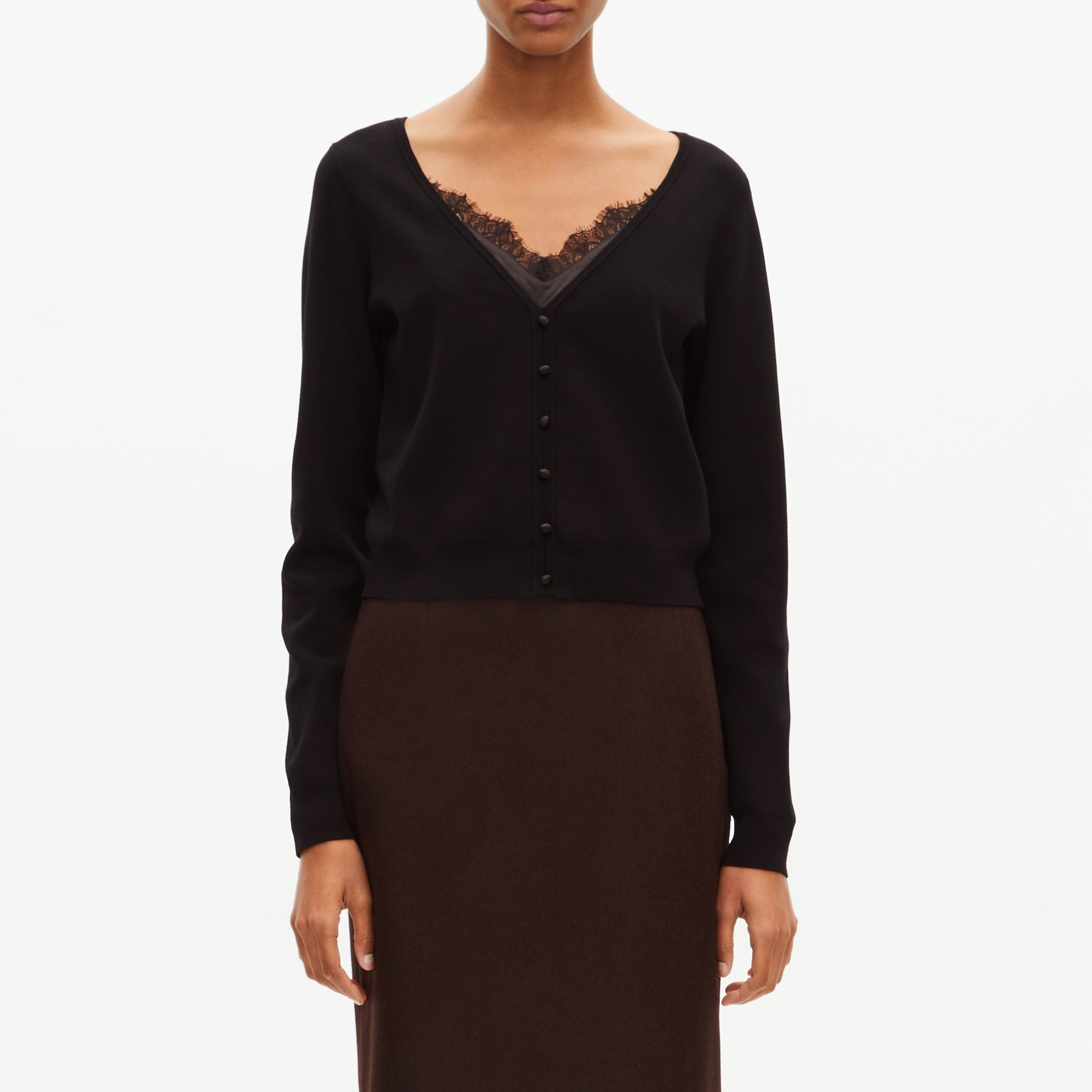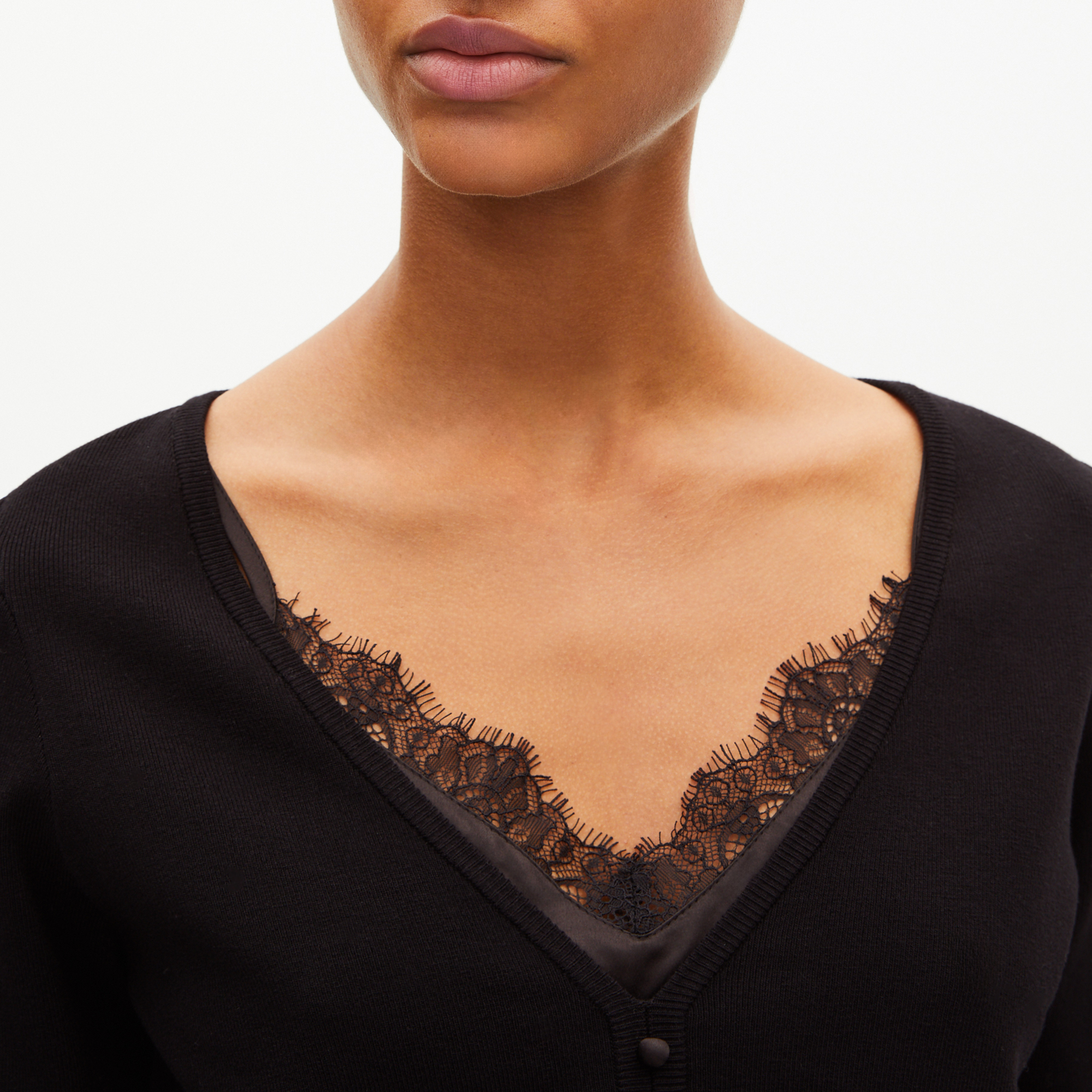 - Trompe L’Oeil satin camisole effect, lace detailing, short straight cut