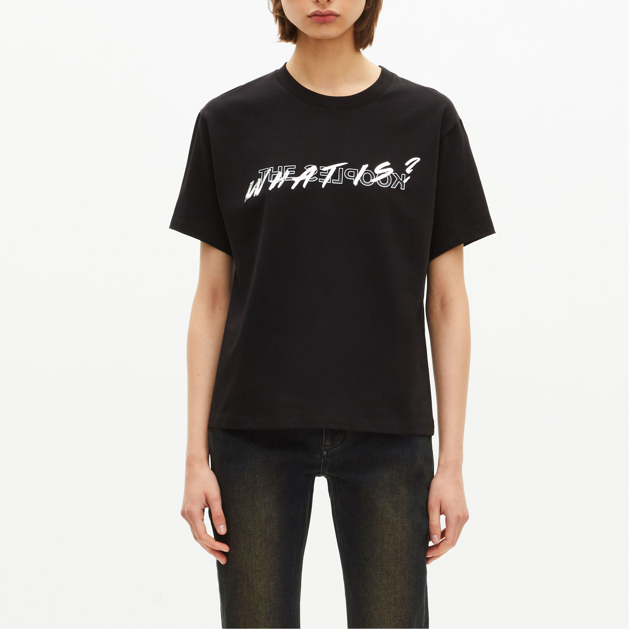 - Round neck, short sleeves, 'What Is' screen printed metallic effect
