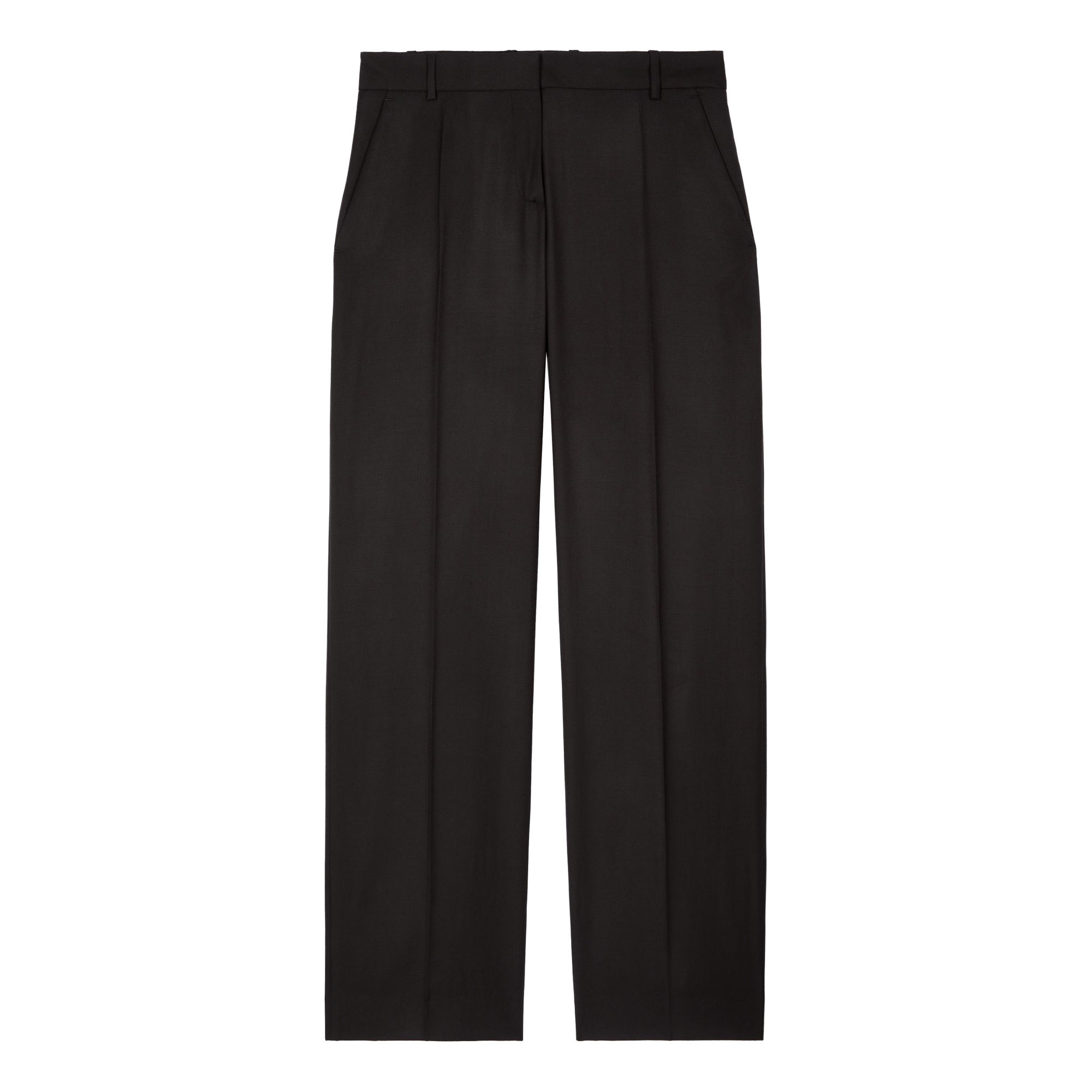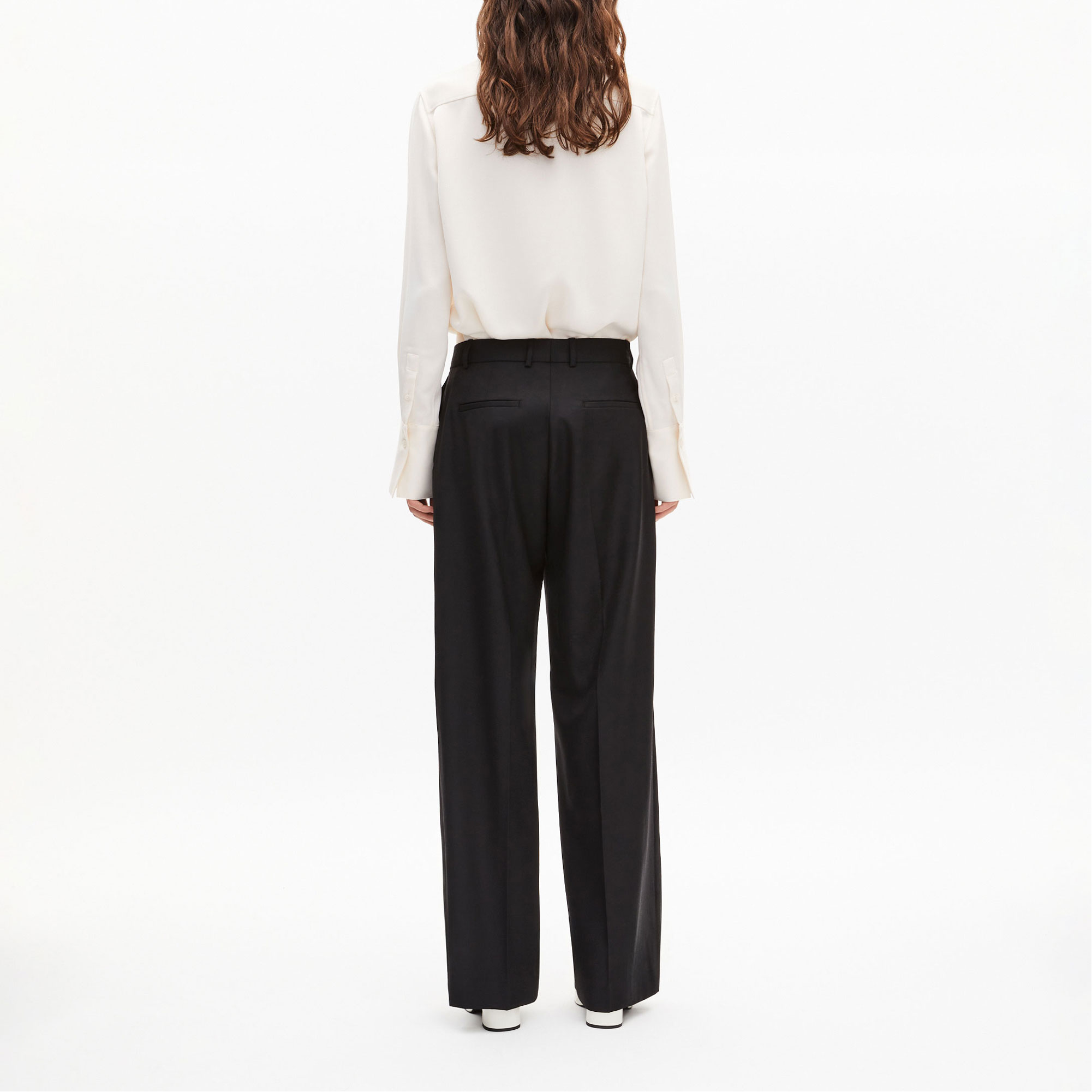 - High rise, wide leg, belt loops, zip closure with reminder button and clip, Italian side pockets, welt back pockets
