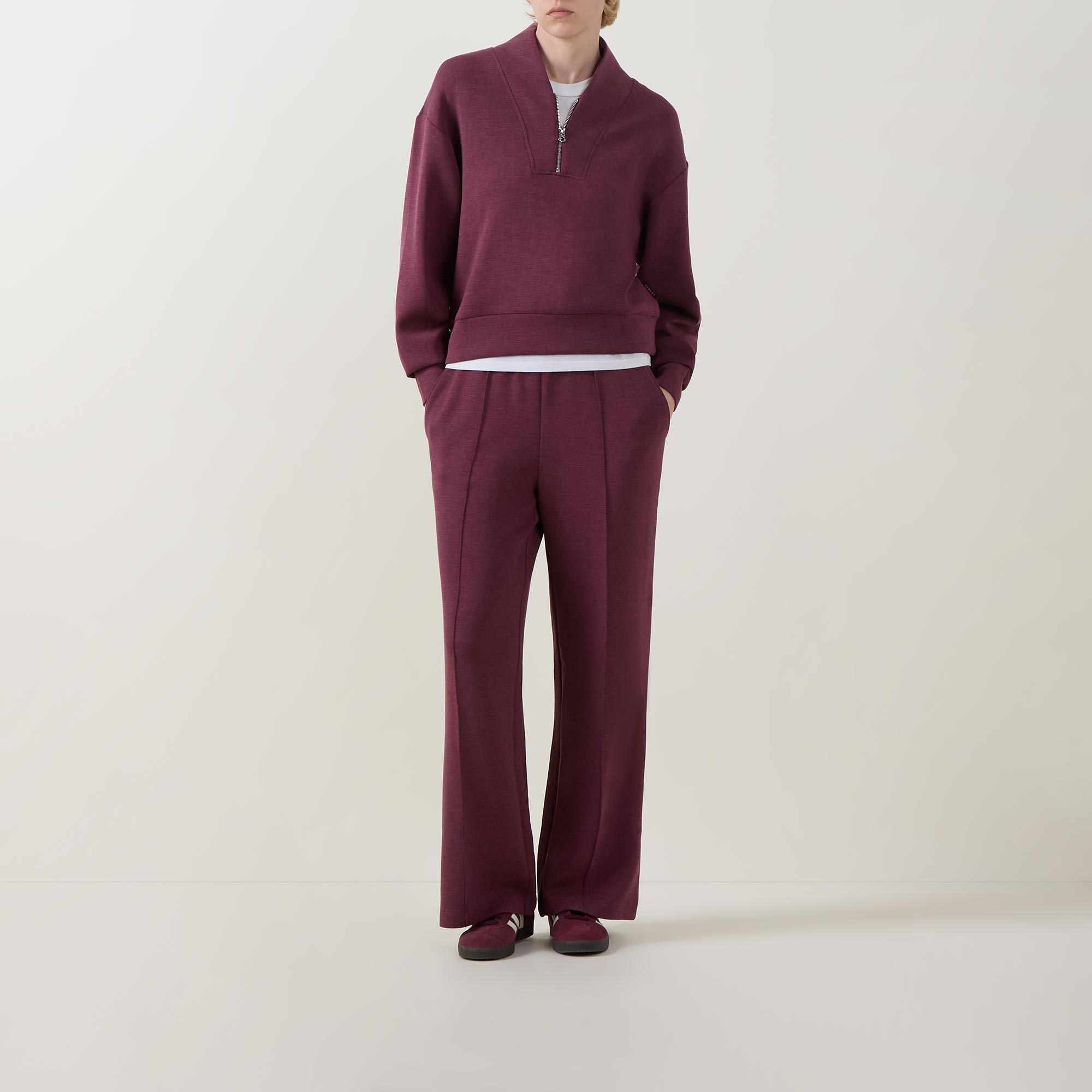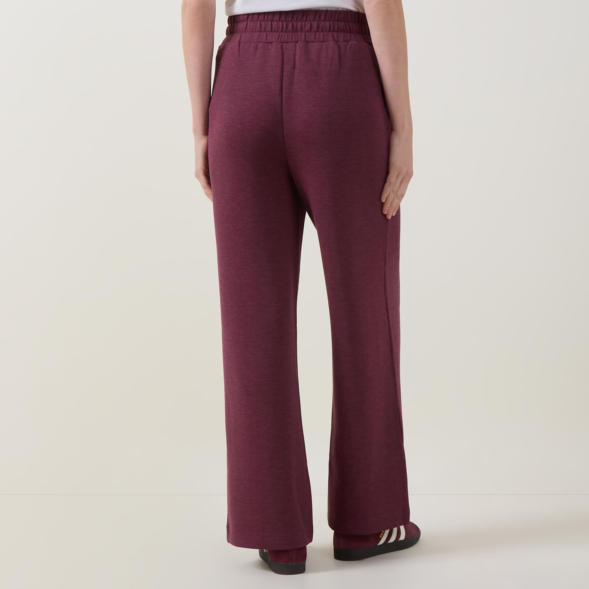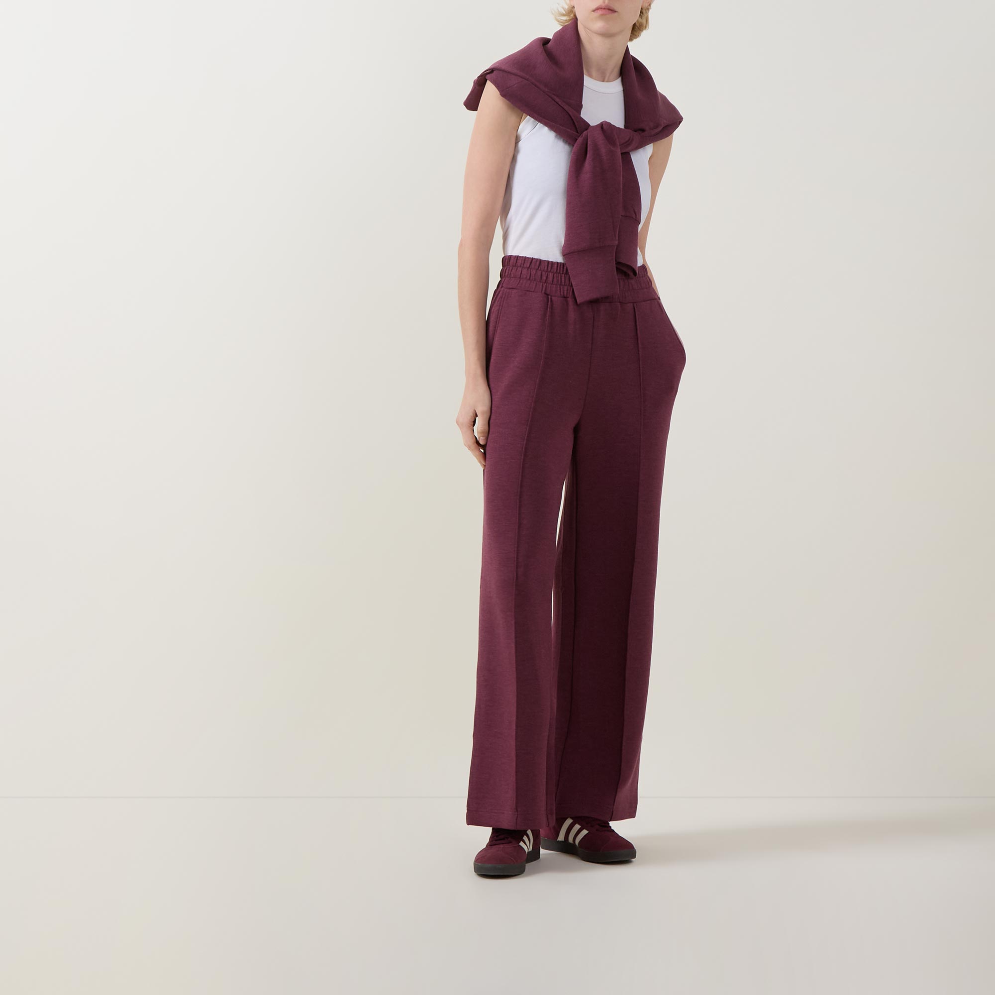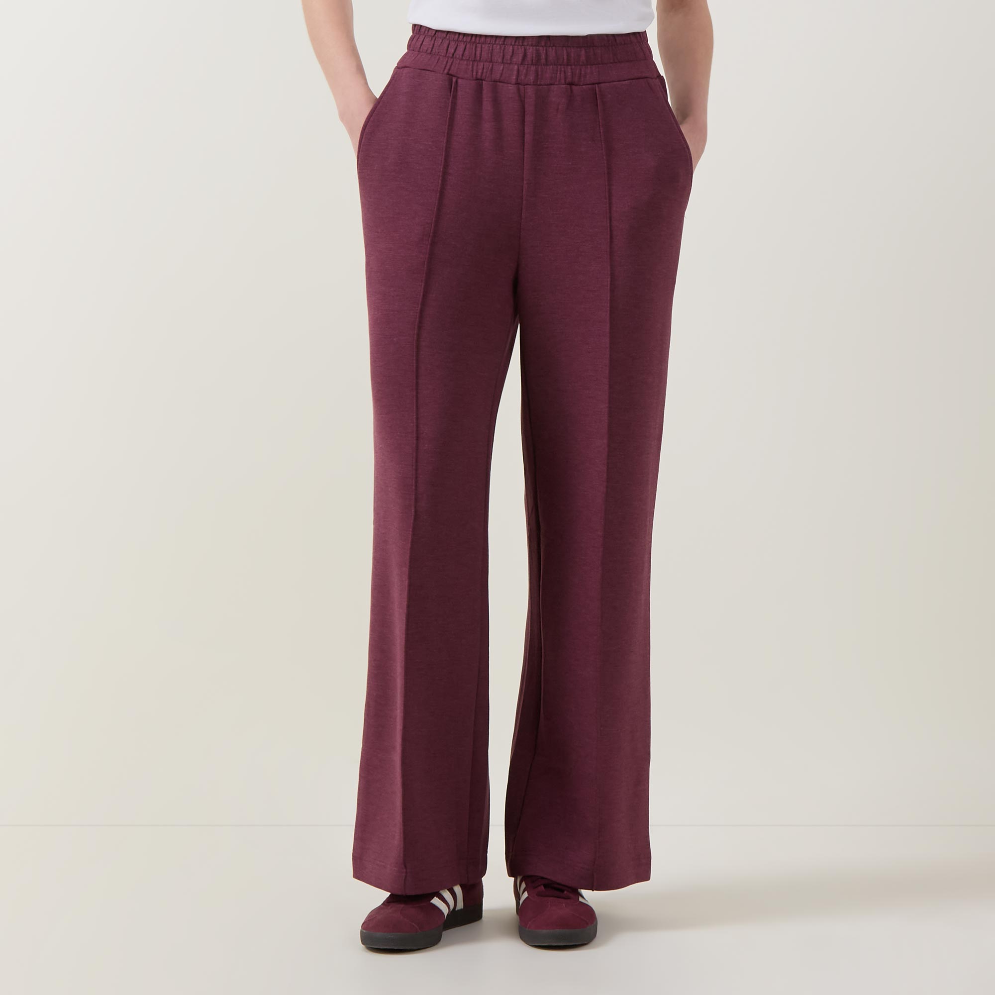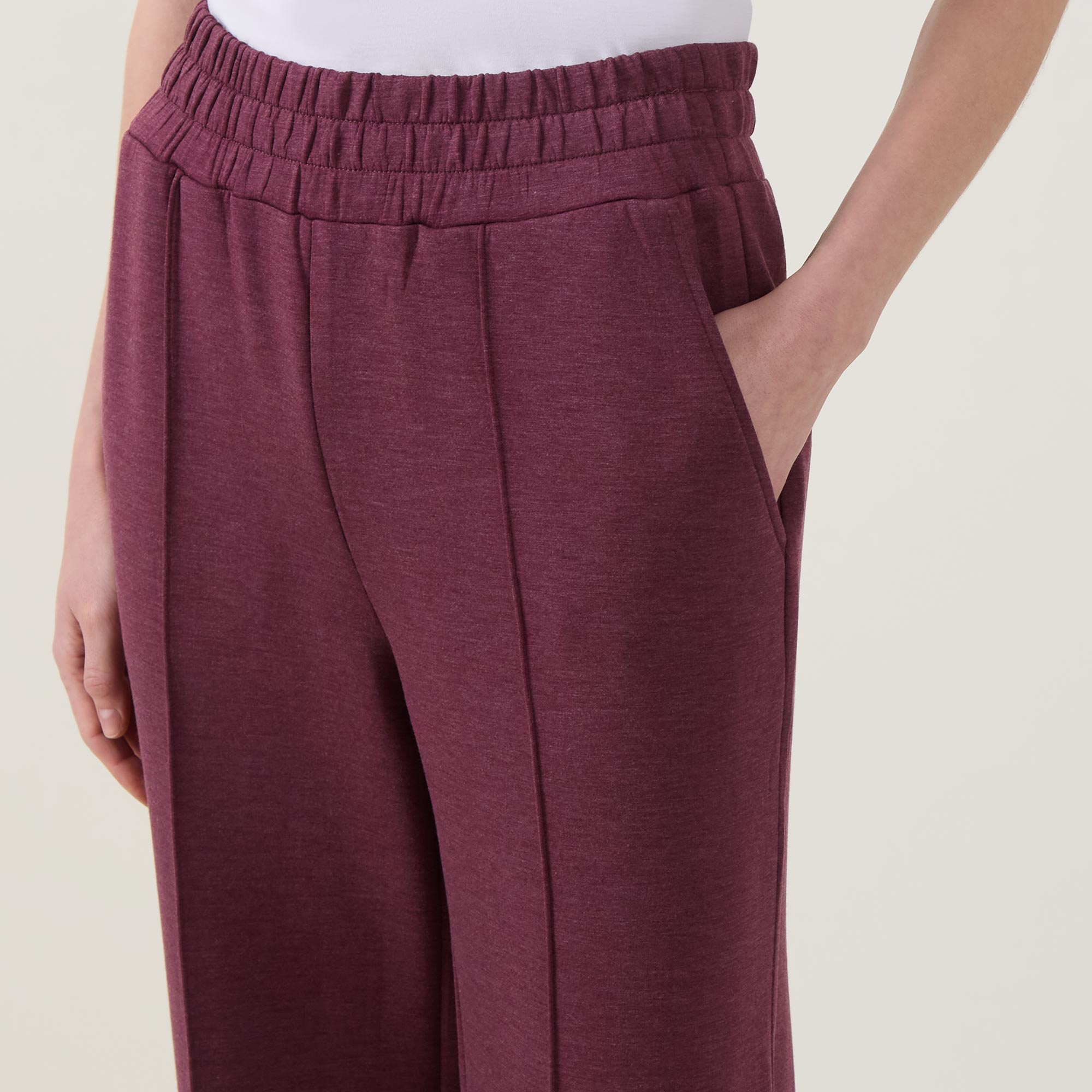 • High rise, wide leg, elasticated waistband, internal drawstring fastening, side pockets, exposed seams, clean hems, DoubleSoft® fabric