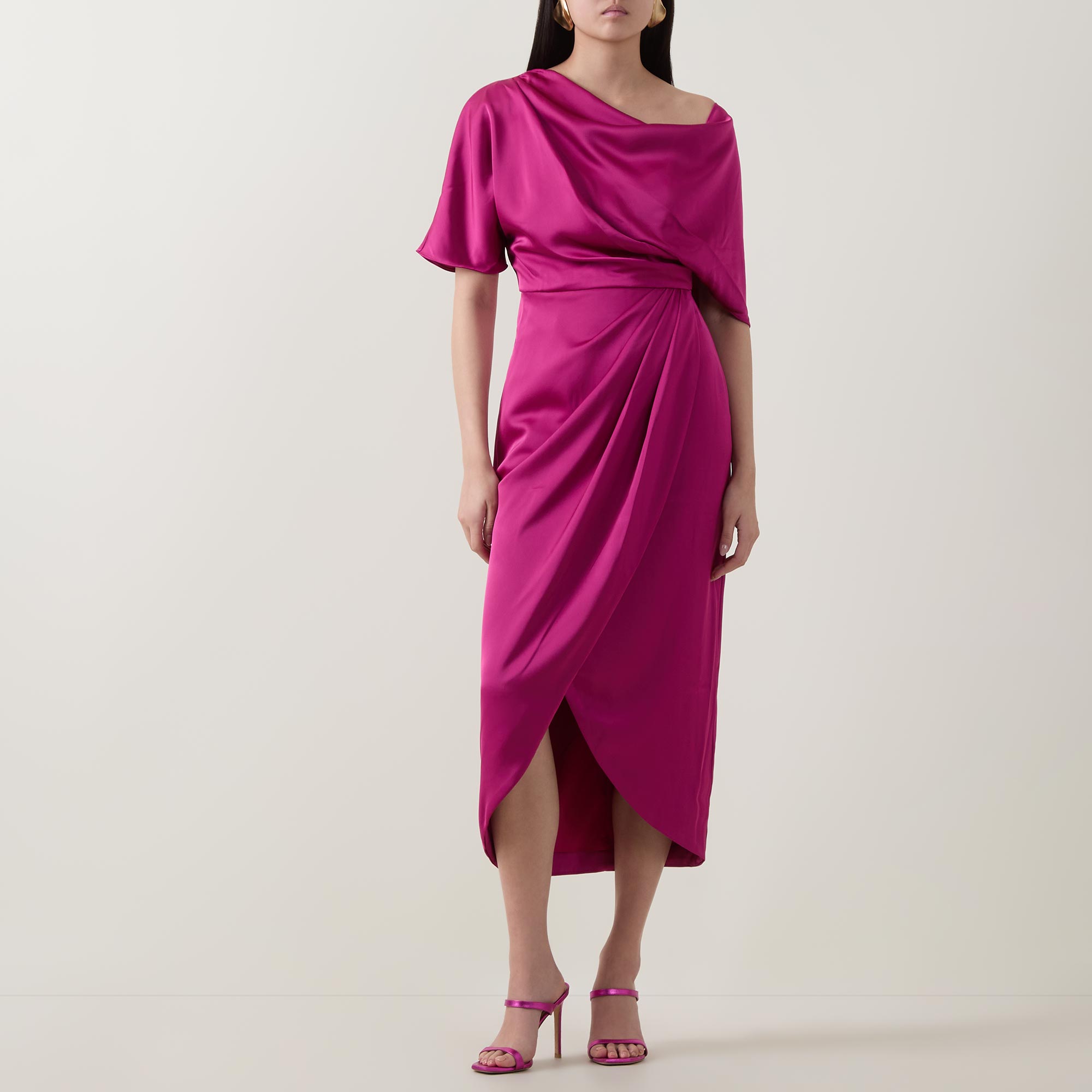 - One-shoulder style, midi length, asymmetric draped details, short sleeves, faux wrap skirt