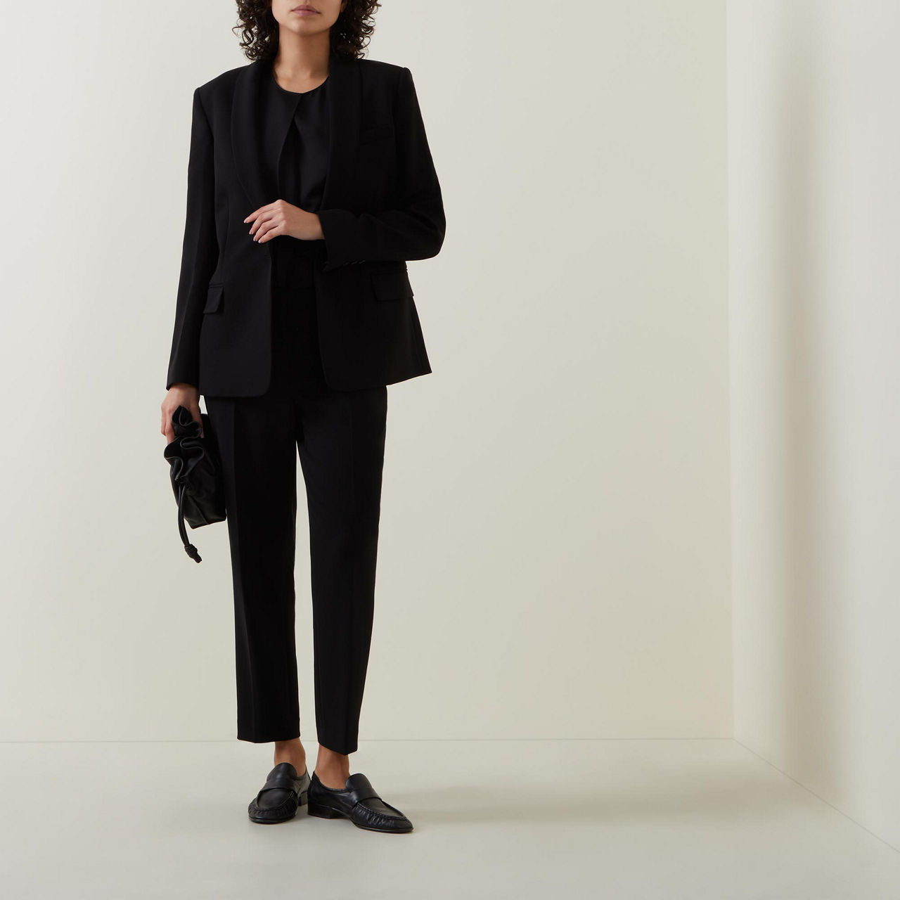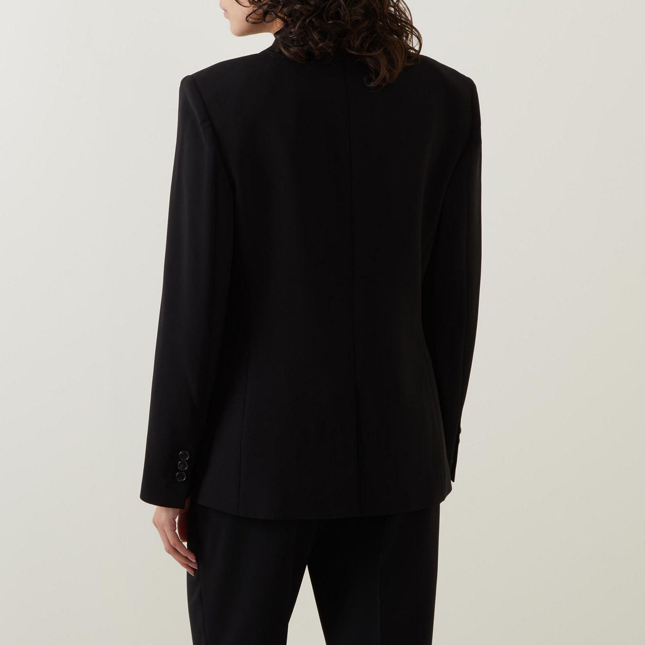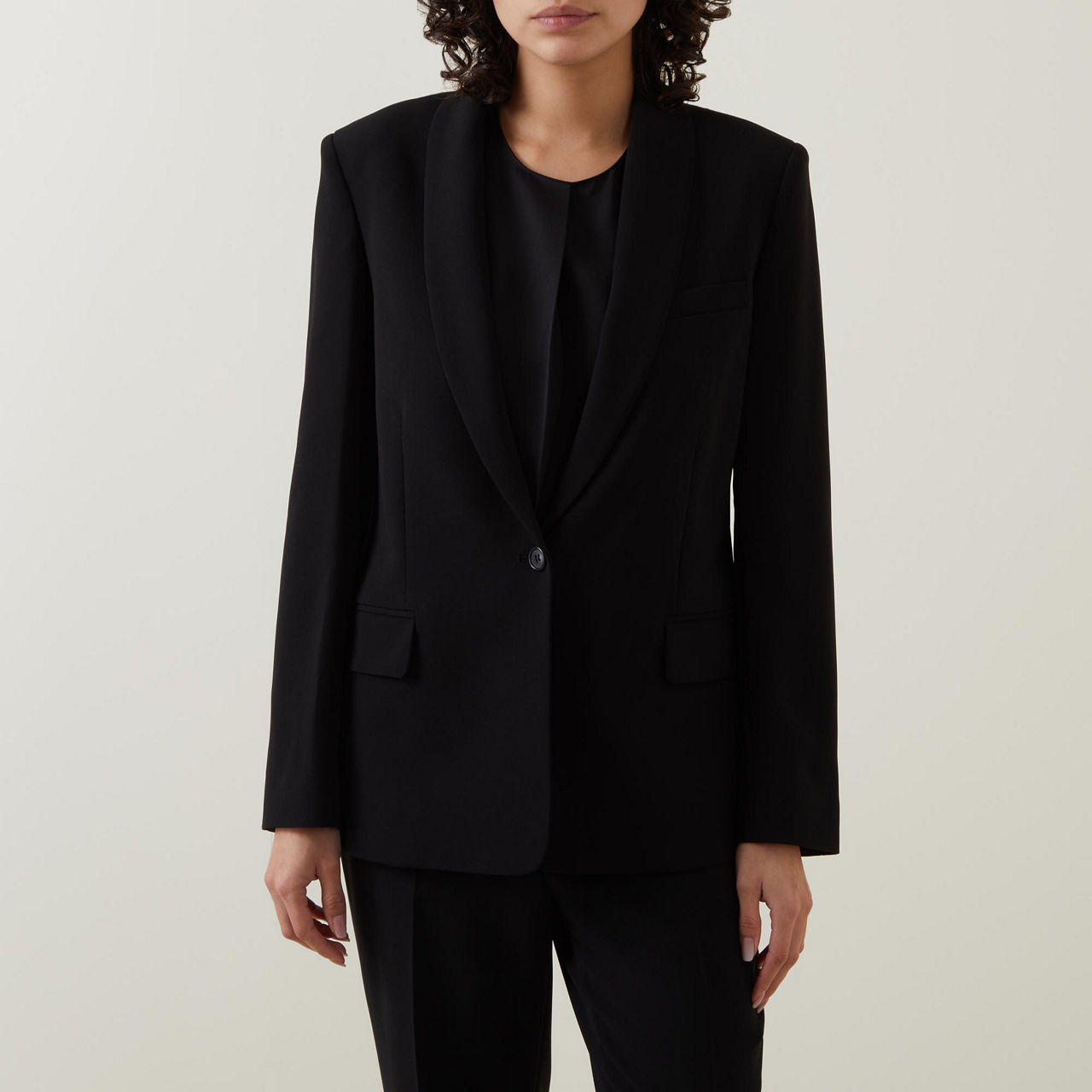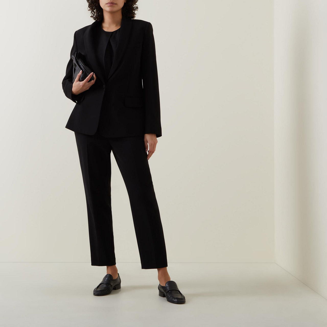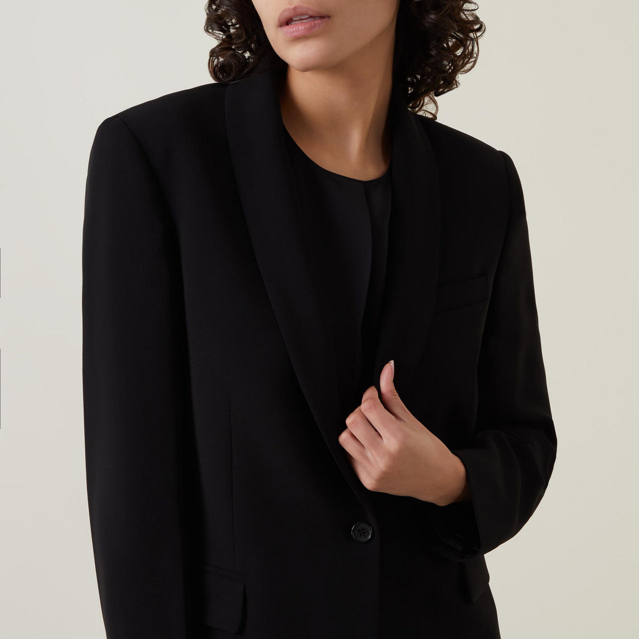 • Single-breasted front, long sleeves, shawl lapel, button fastening, chest pocket, two flap pockets, buttoned cuffs, smooth fabric