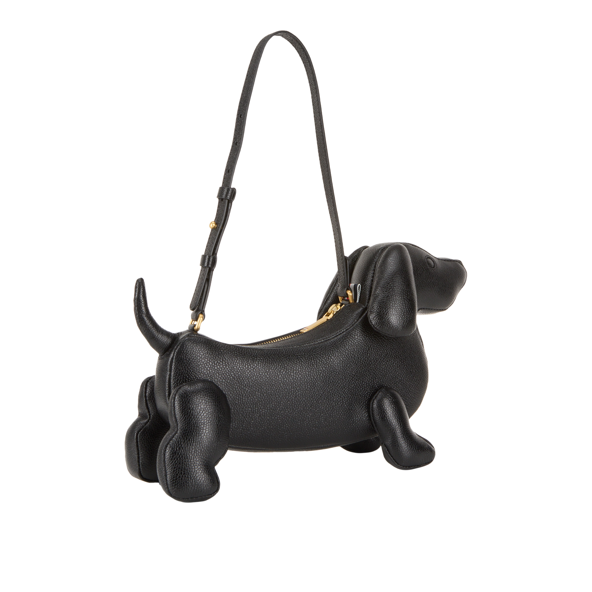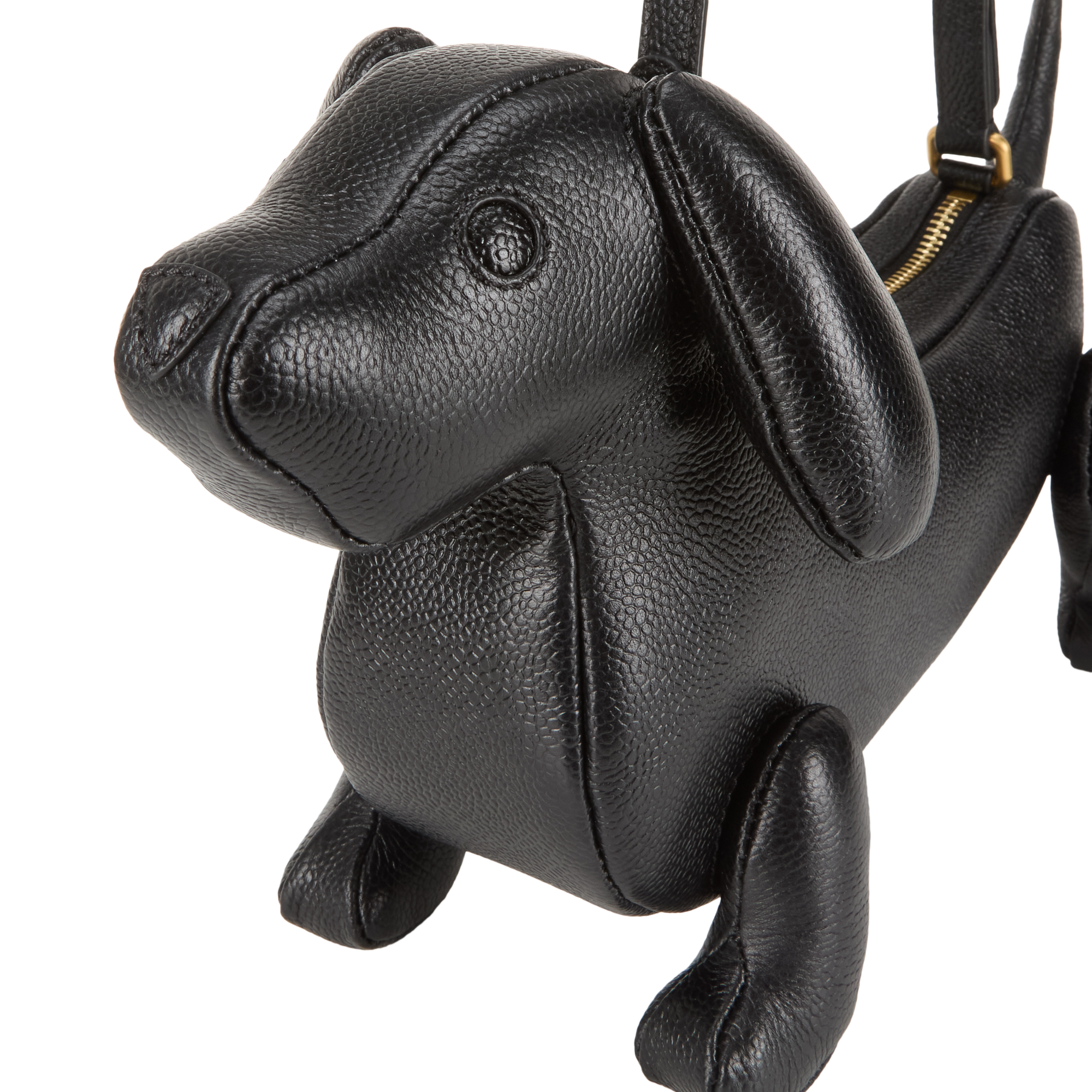 - Adjustable shoulder strap, top zip fastening, gold-tone hardware, dog-shaped silhouette, grained leather finish