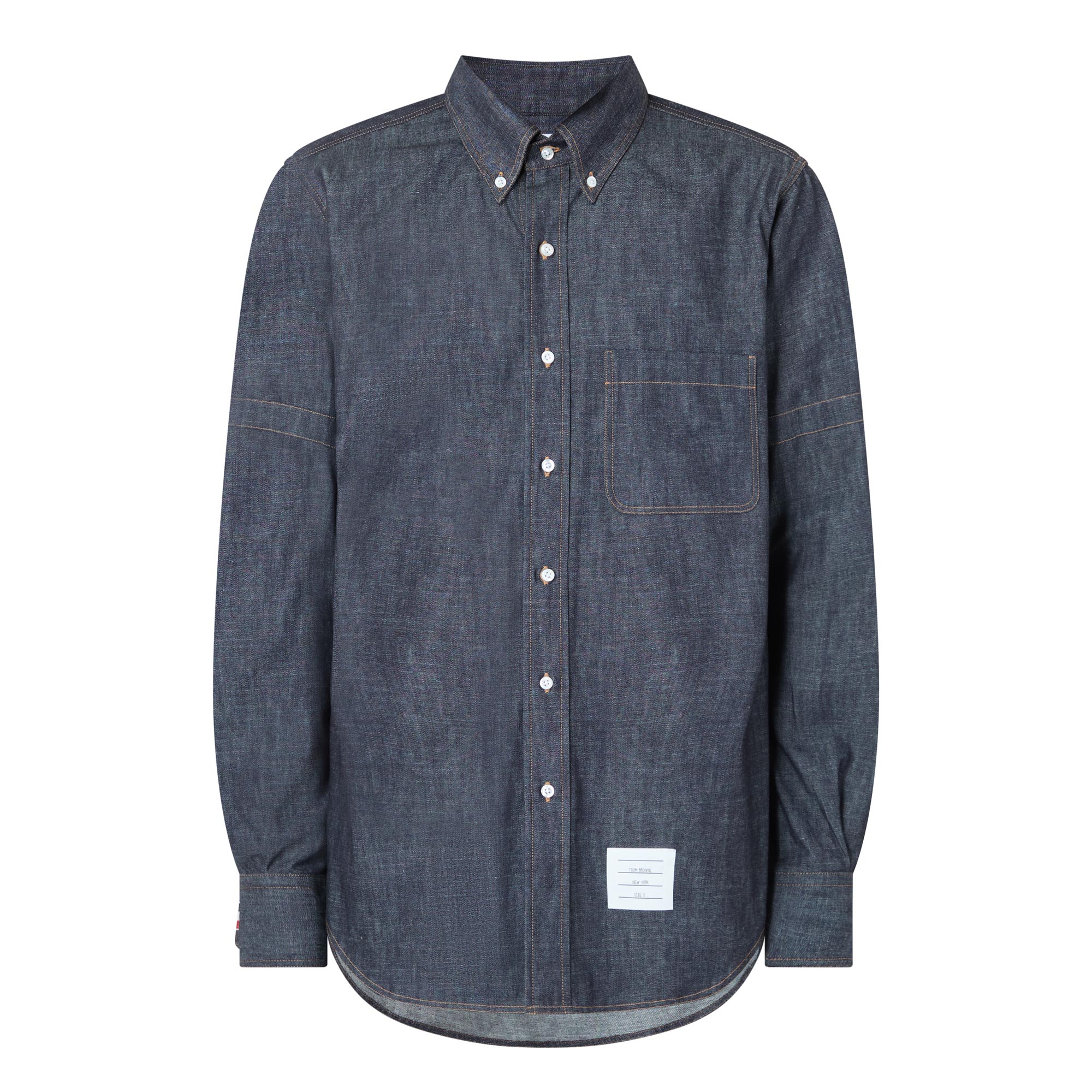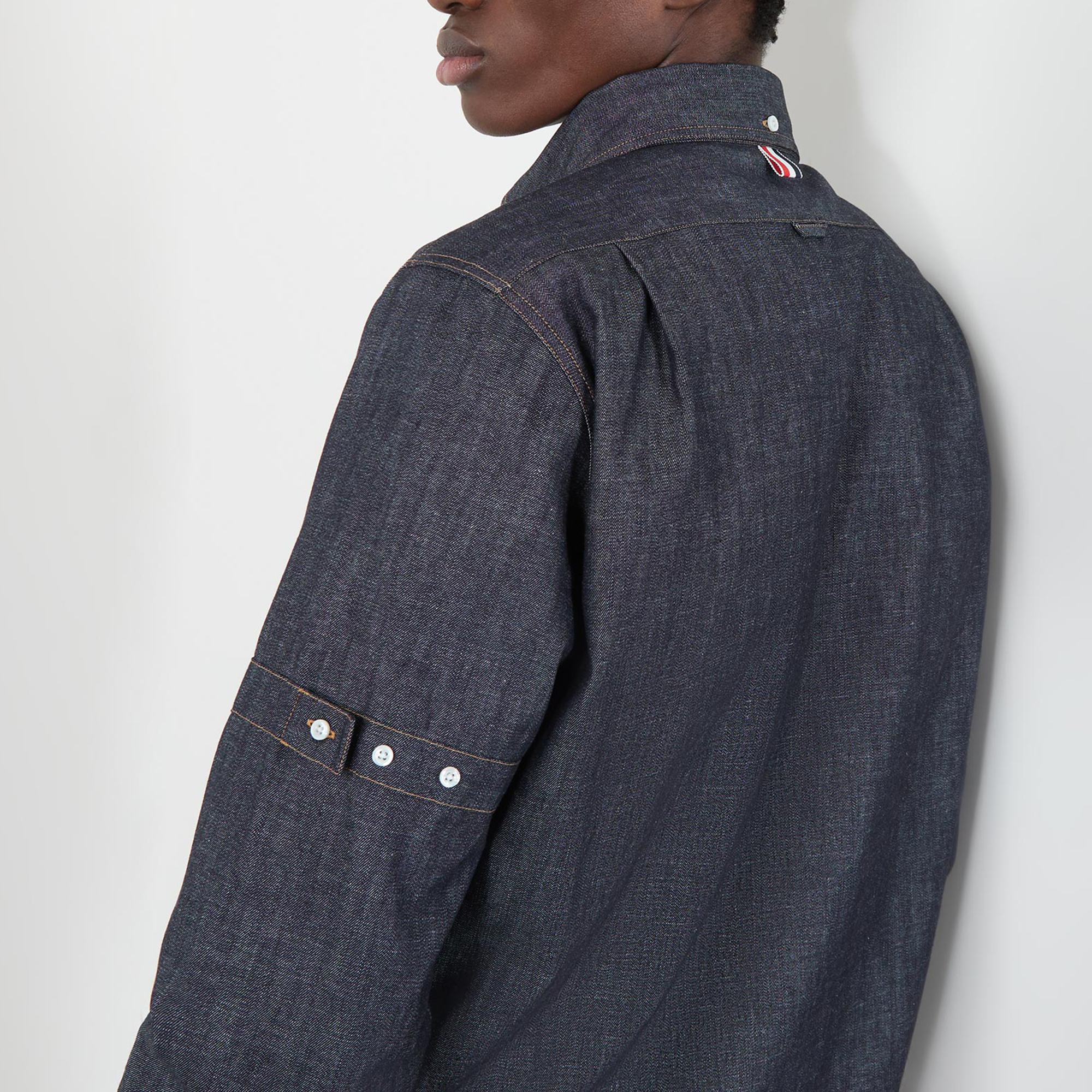 - Button-down collar, long sleeves, single-cuff, full button fastening, curved hem, button adjustable armbands, chest patch pocket, tobacco stitching, name tag appliqué, signature striped grosgrain loop tab