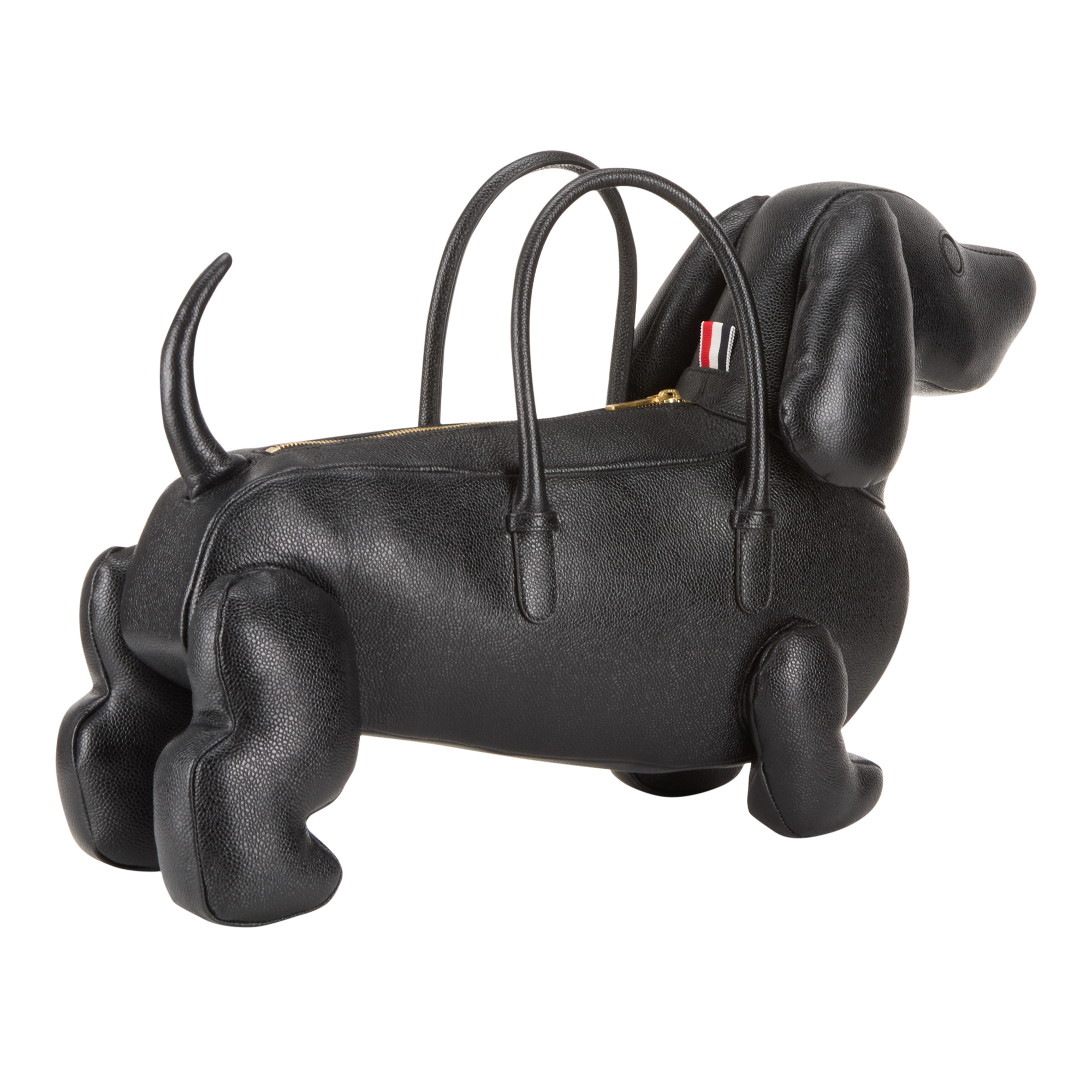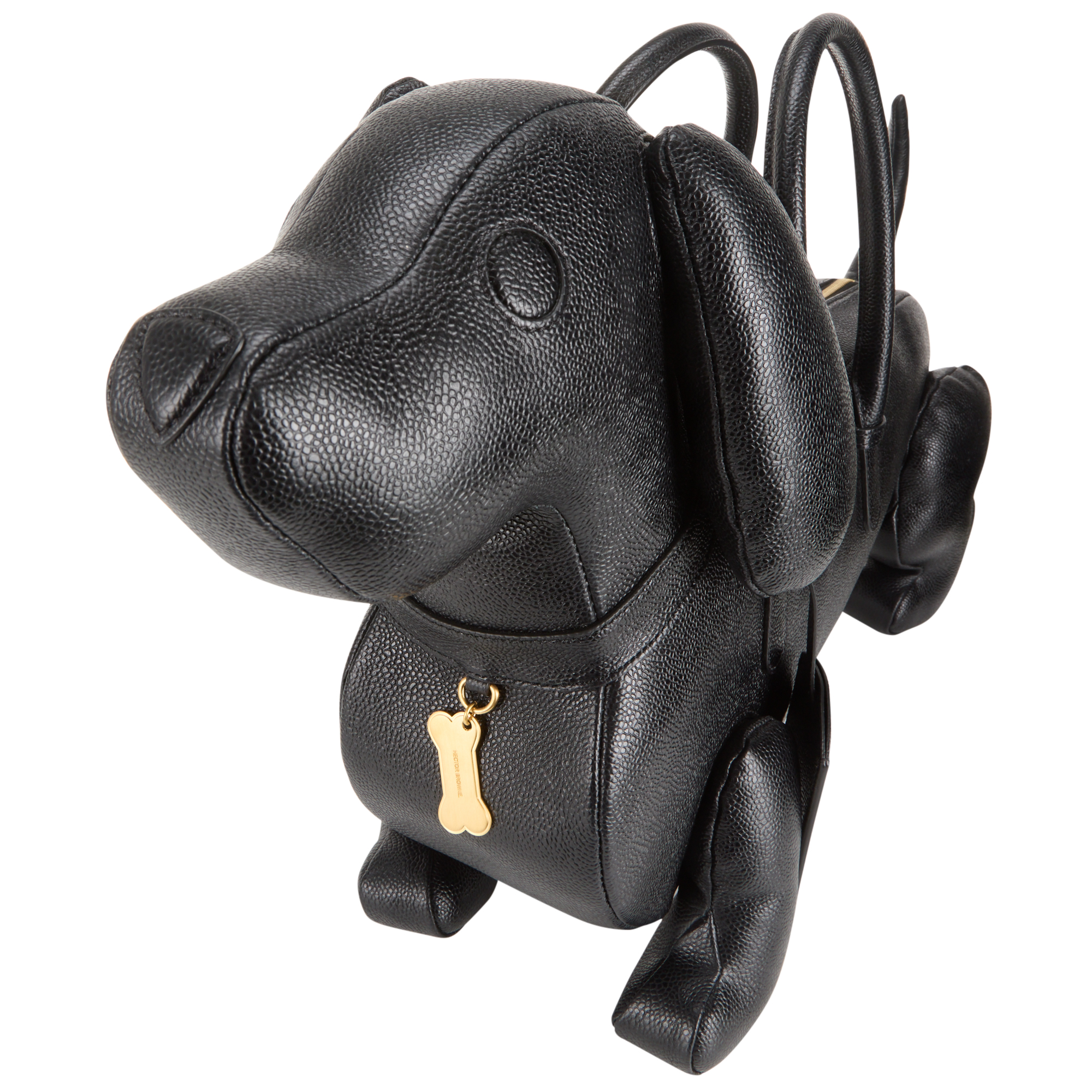 - Carry handles, top zip fastening, removable luggage tag, dog tag, gold-tone hardware, dog-shaped silhouette, grained leather finish