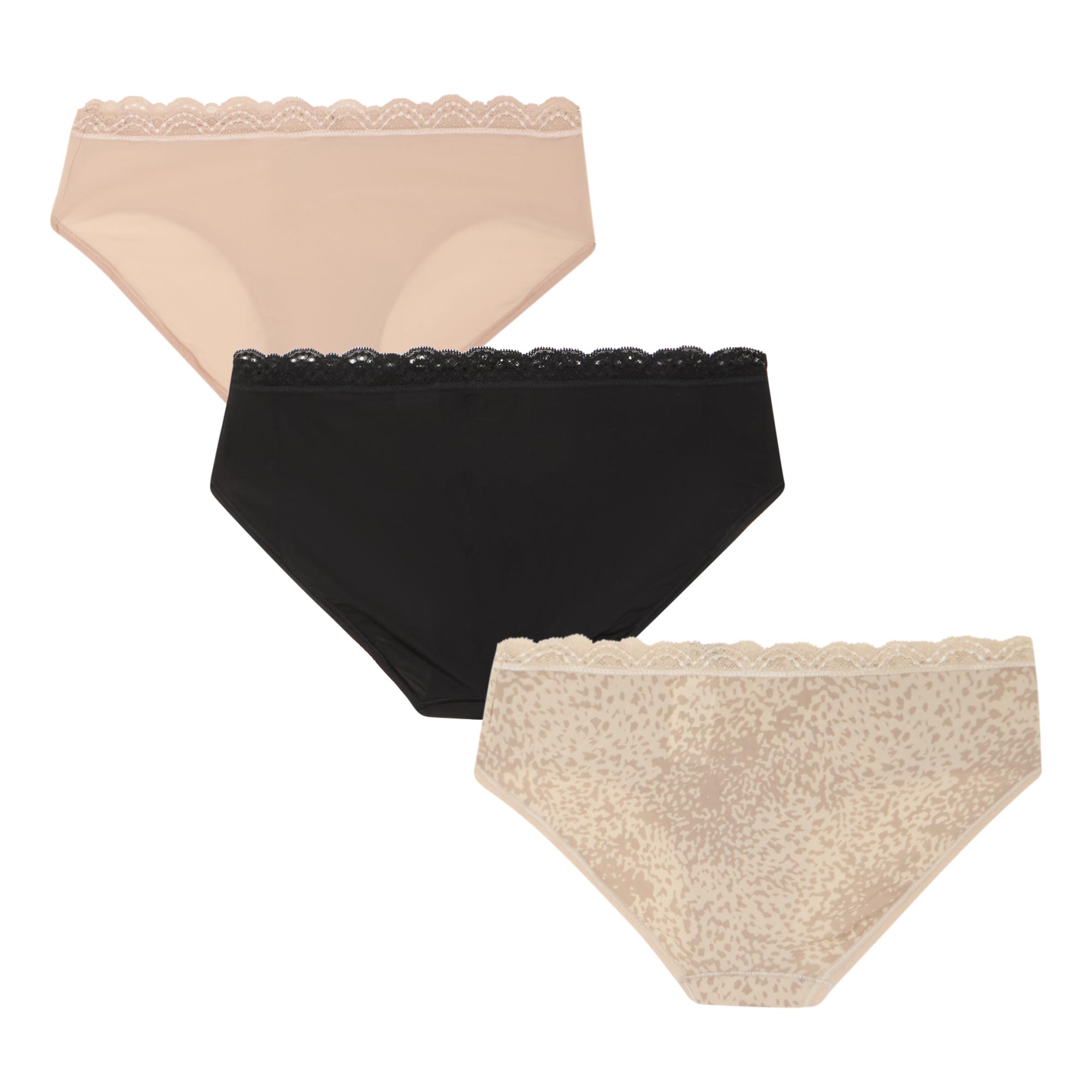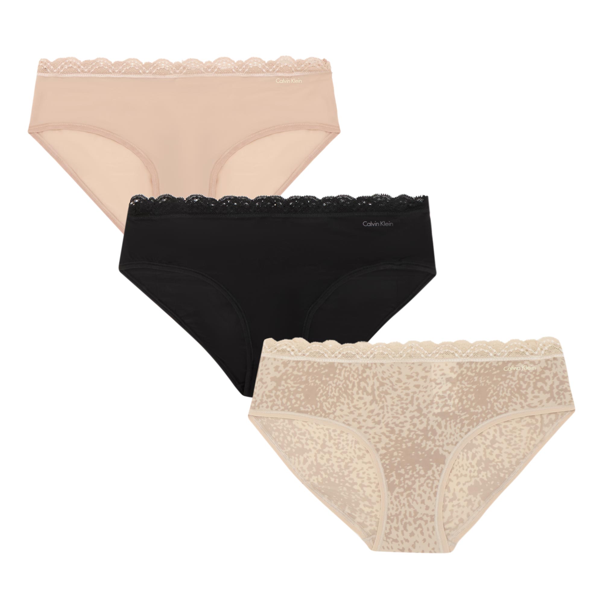 - Three-pack, mid-rise, scalloped stretch lace waistband, no-show flat edge finish, logo print at the hip, assorted styles