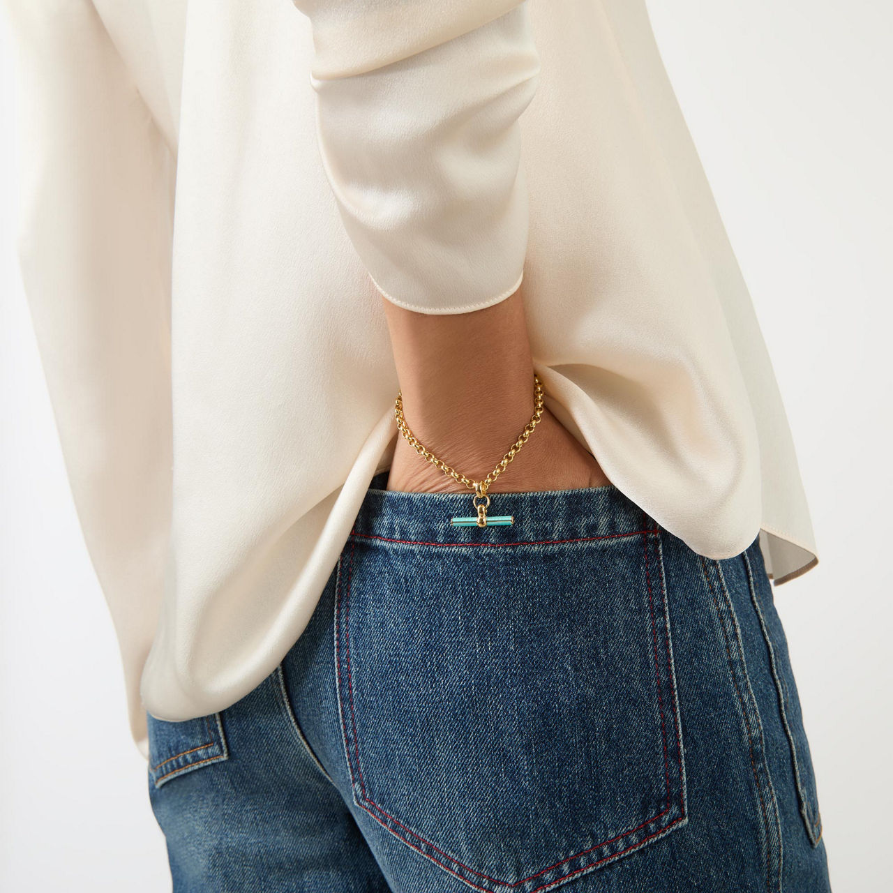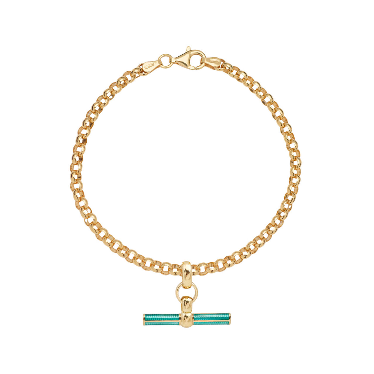 - Recycled sterling silver Belcher chain, wide brass T-bar, turquoise glossy enamel detail, lobster clasp fastening, gold-plated finish