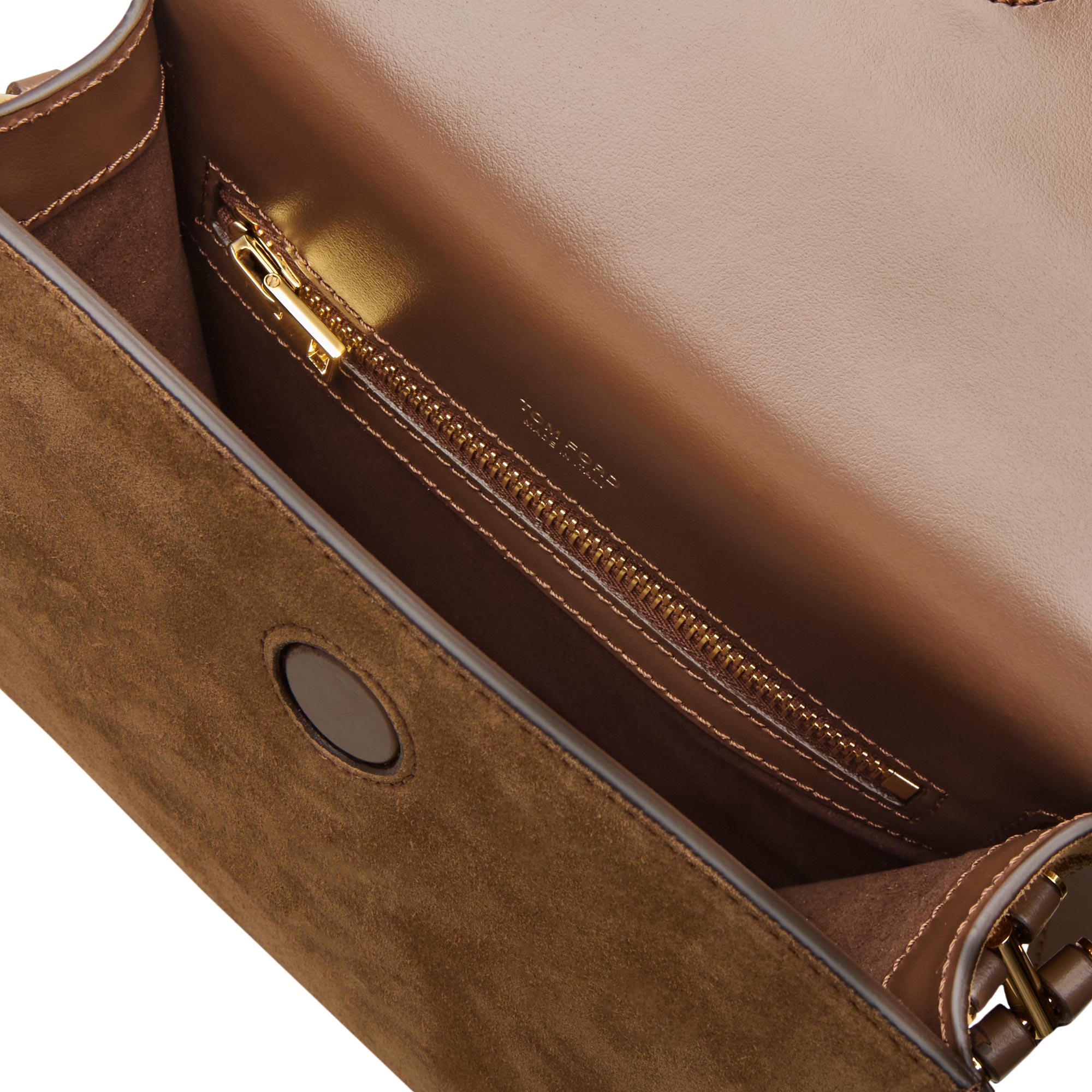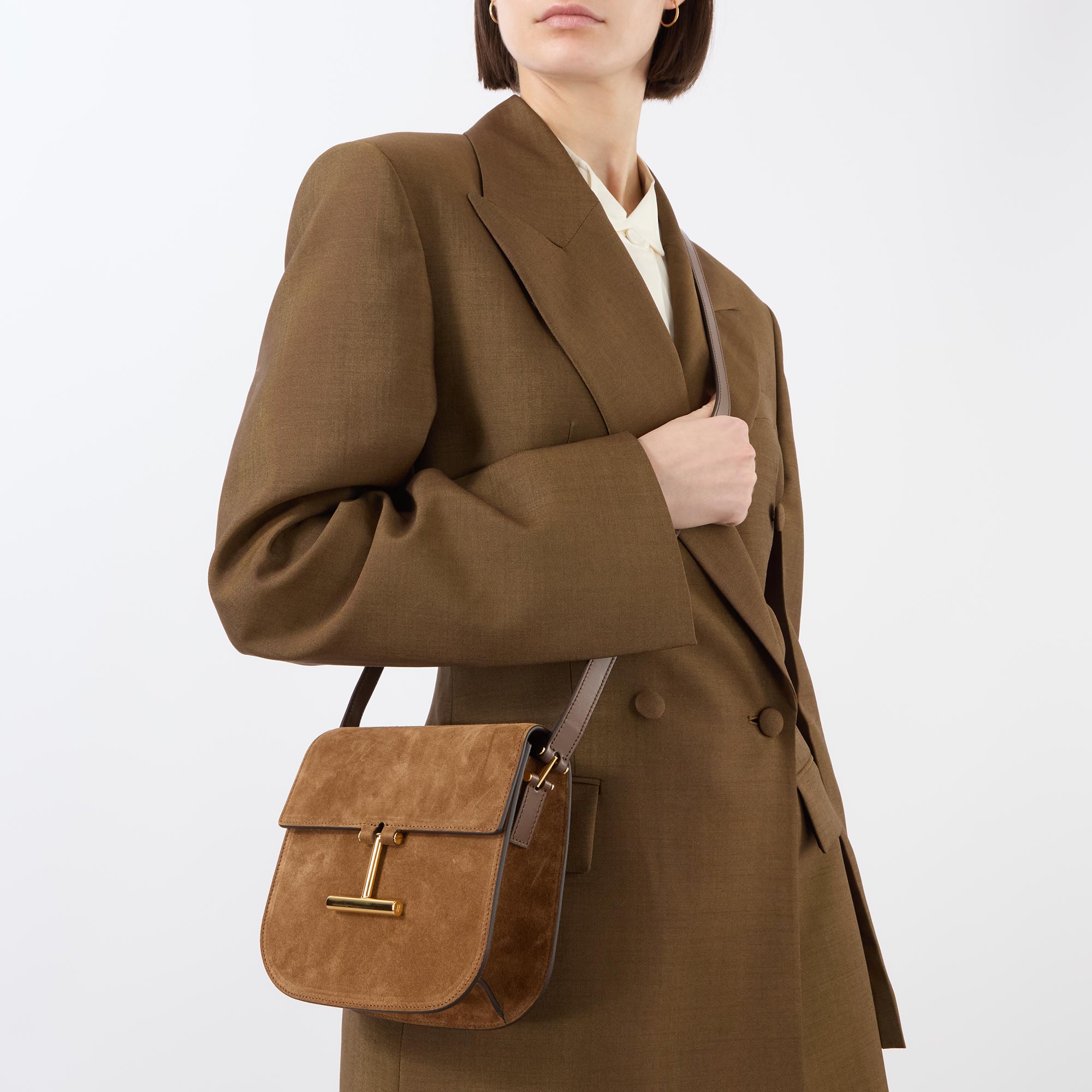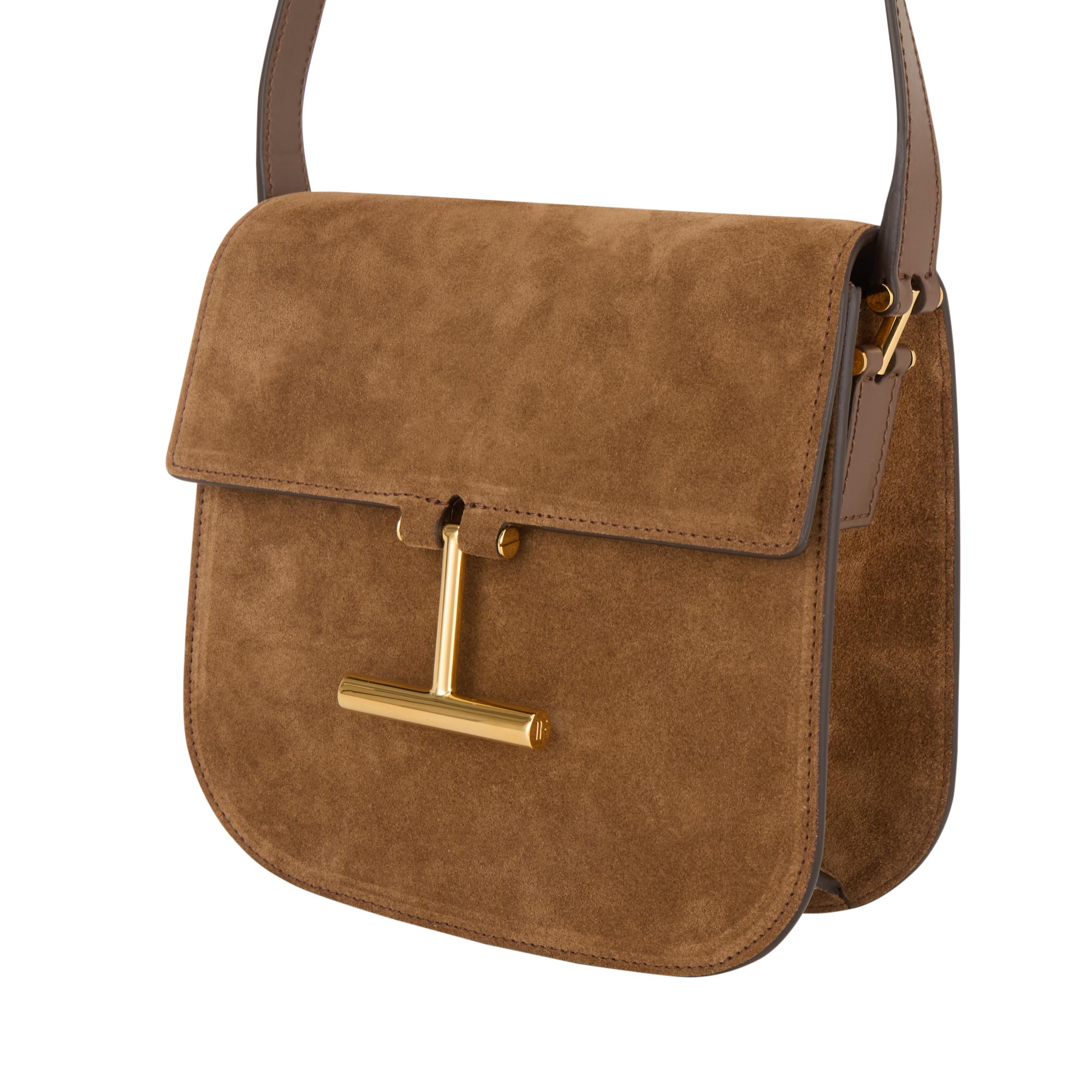 - Flap closure with magnetic button fastening, T-logo hardware, adjustable crossbody strap, structured silhouette, rounded edges, tonal stitching, gold-tone accents, suede leather finish