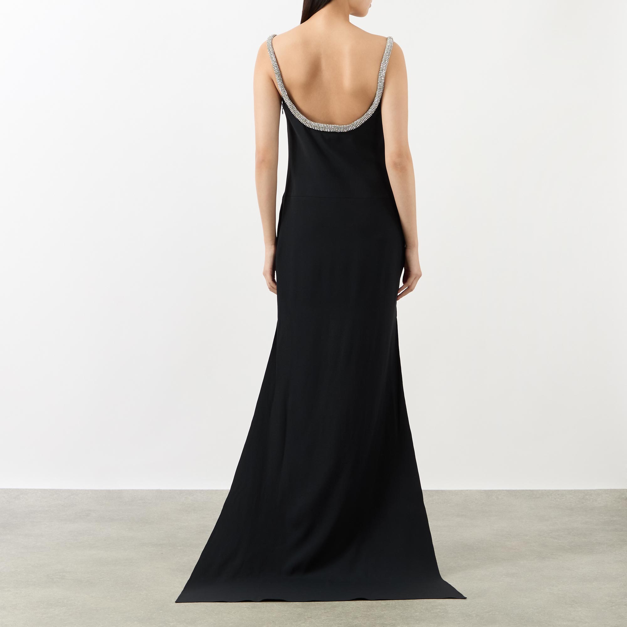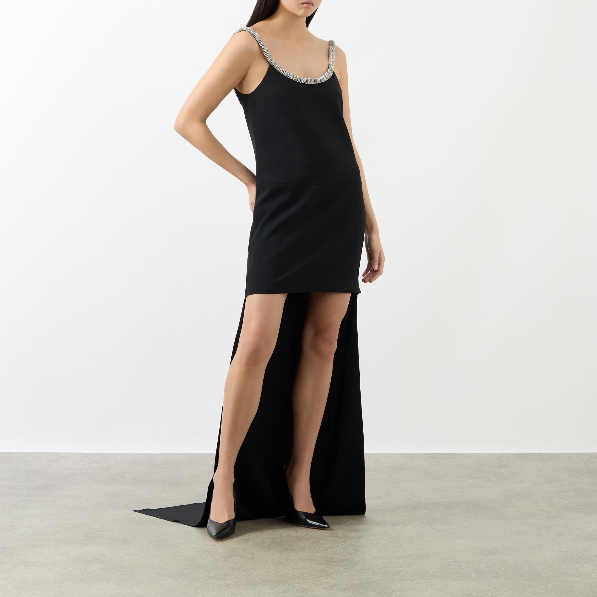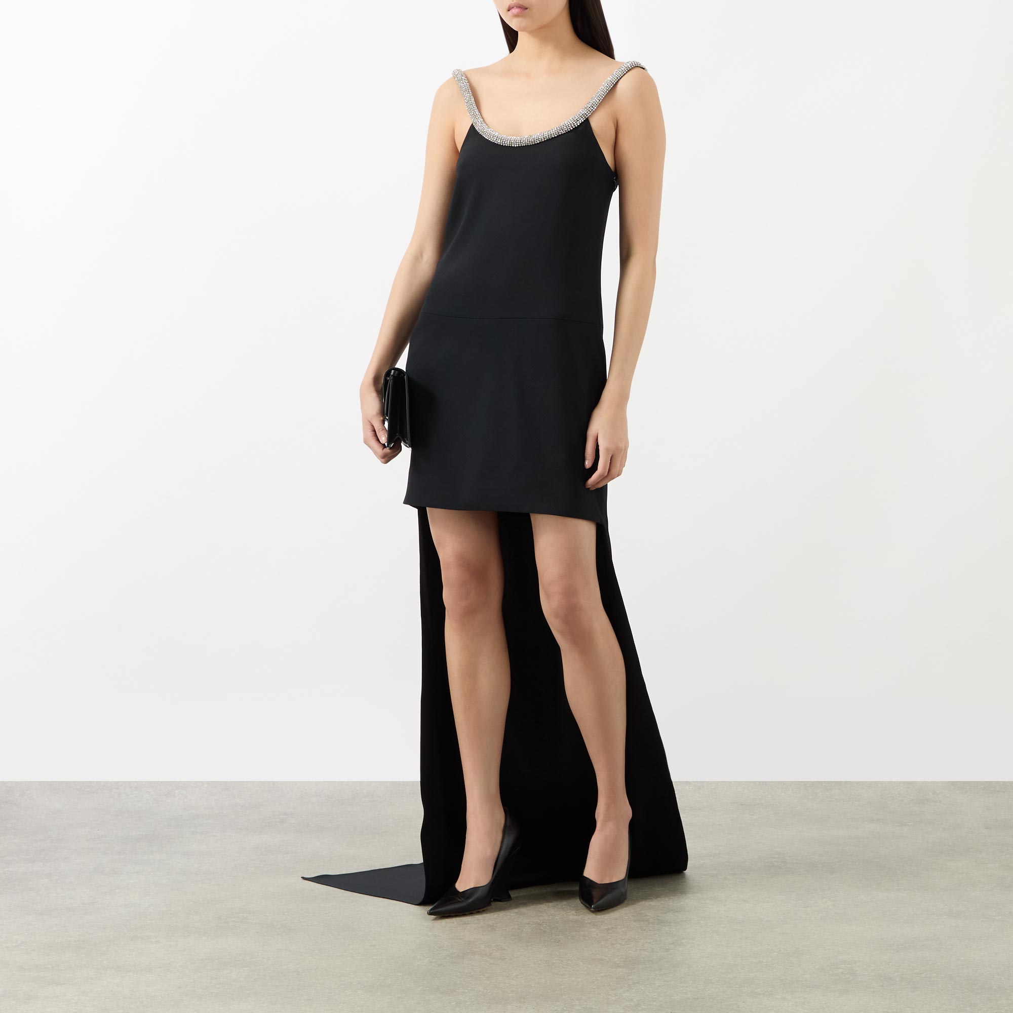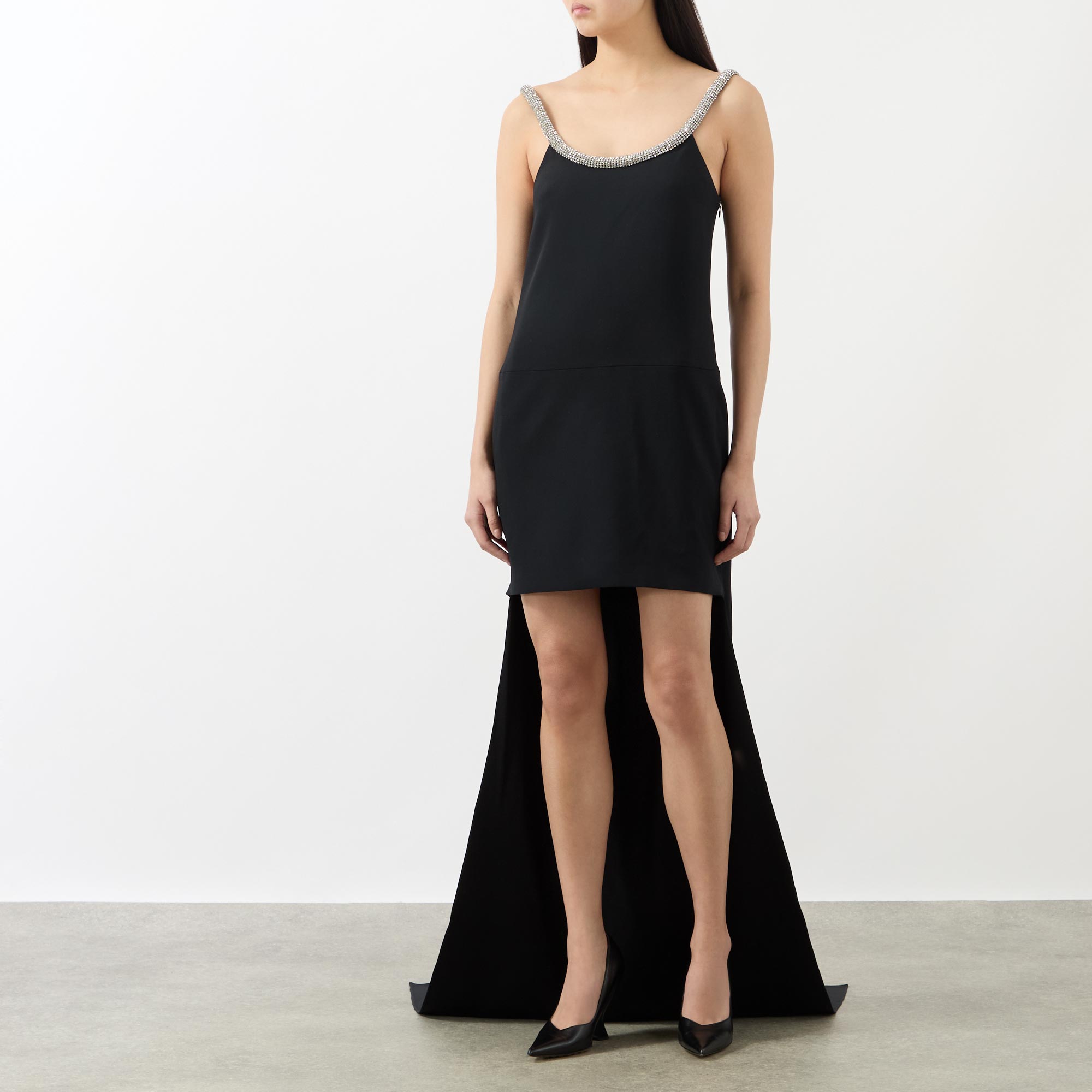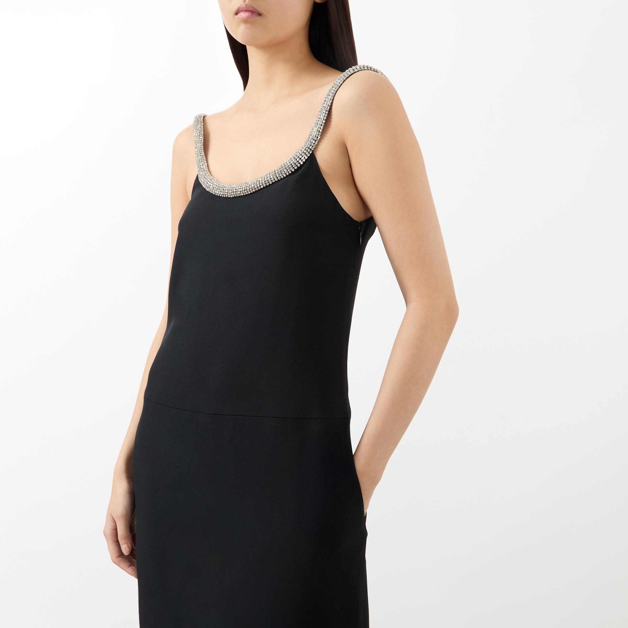 High glamour is synonymous with Tom Ford and the latest collection highlights the brand's lavish aesthetic, seen in the design of this cocktail dress. Cut from a crepe satin, it features a sculpted crystal-chain adorned neckline before falling to a high-low hemline, finished with side entry pockets.