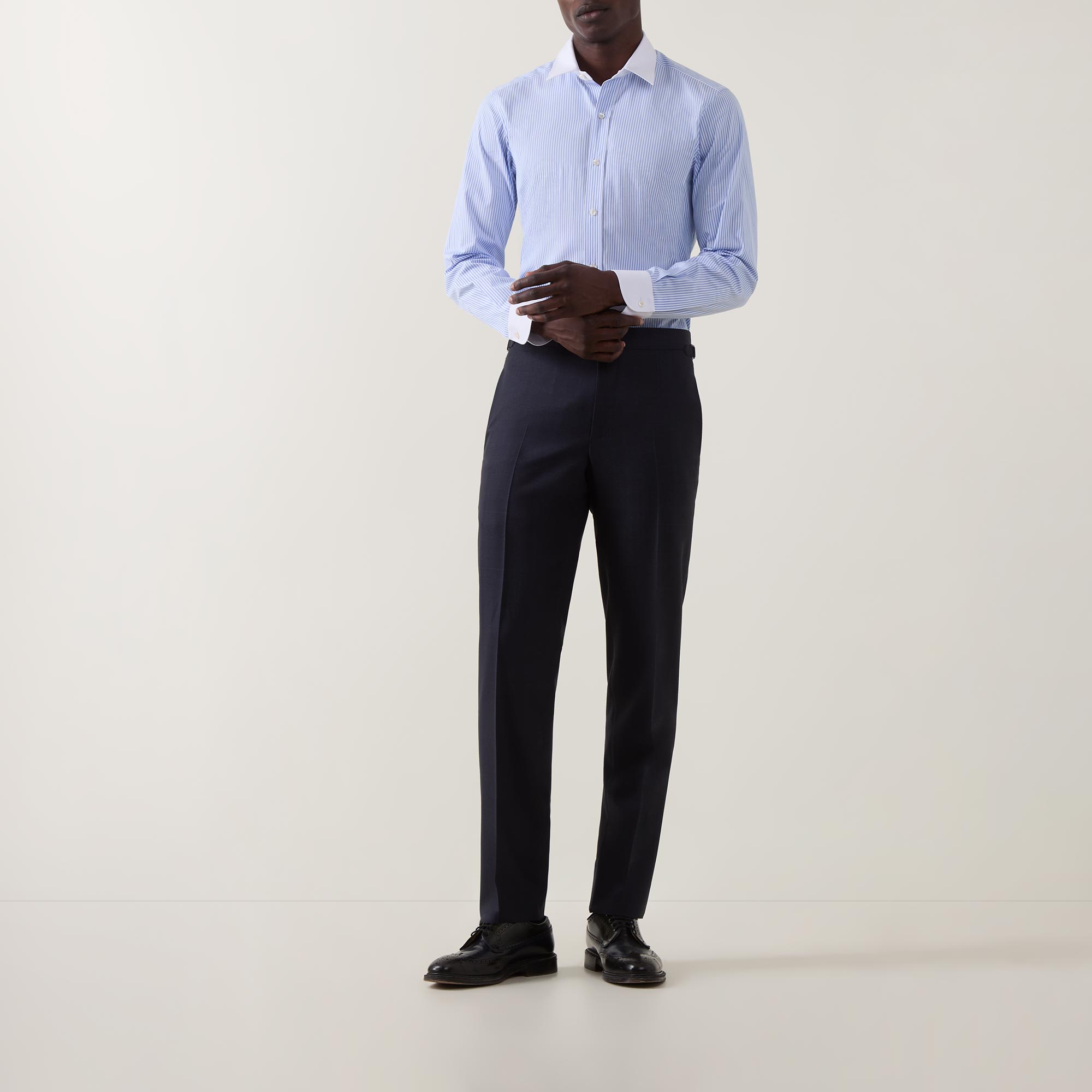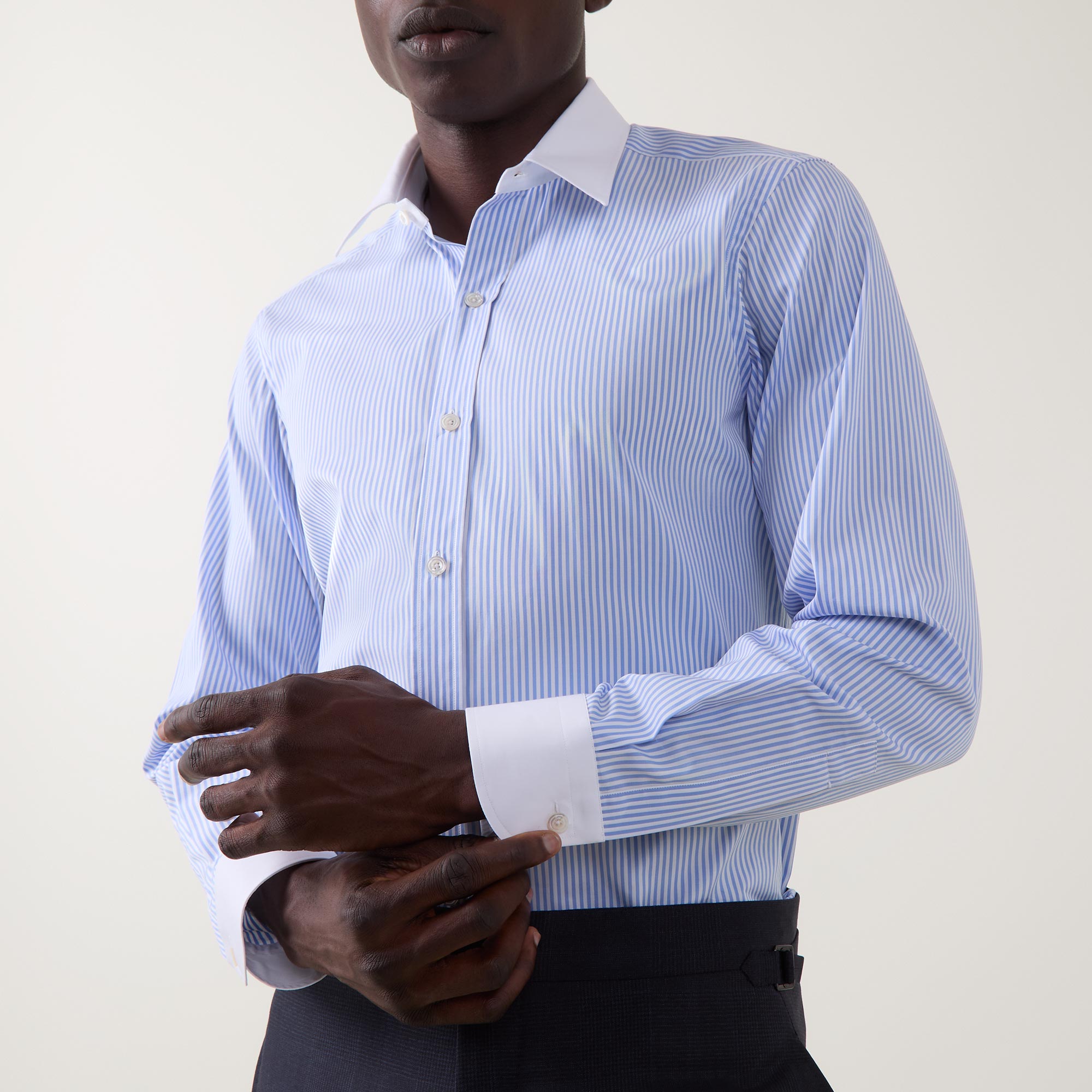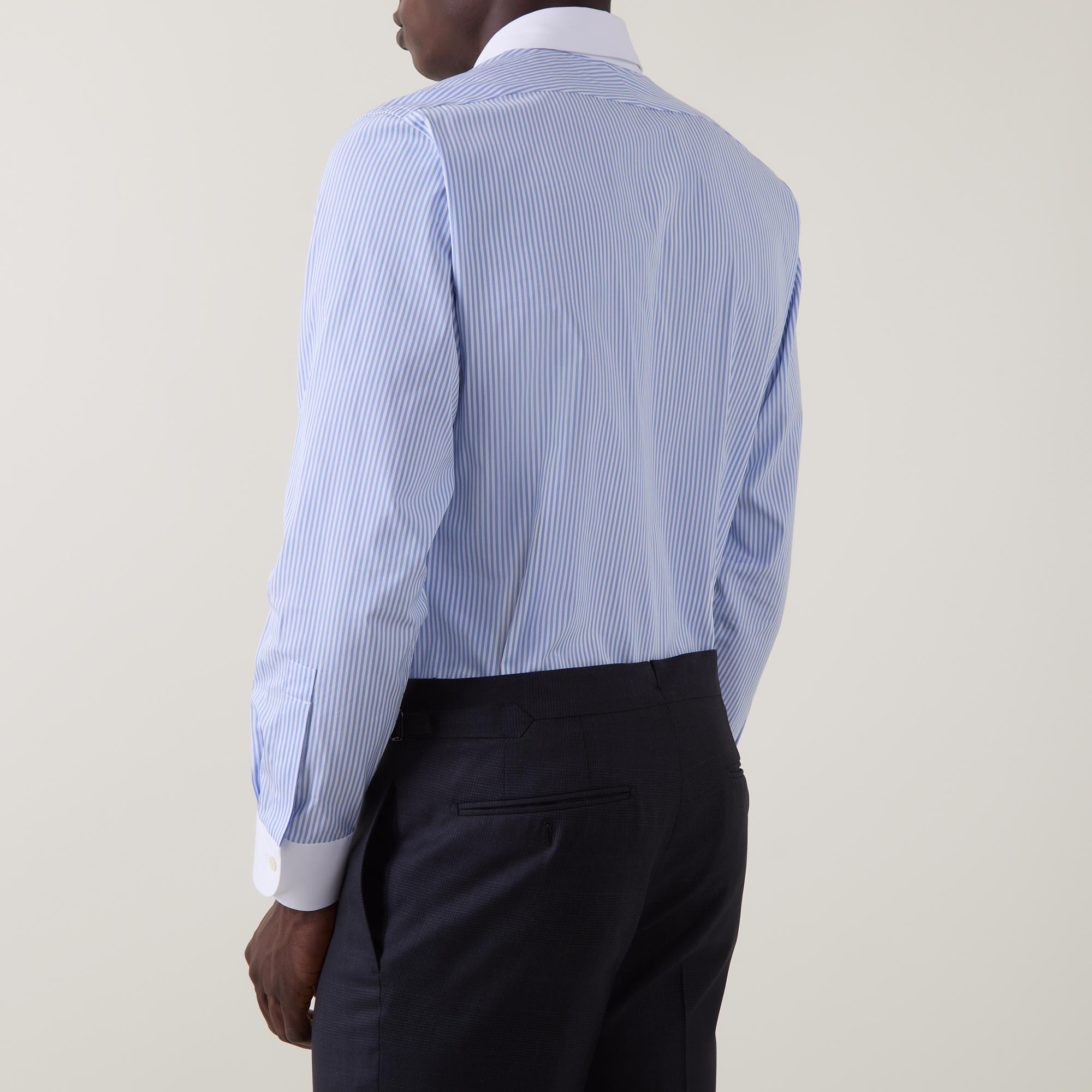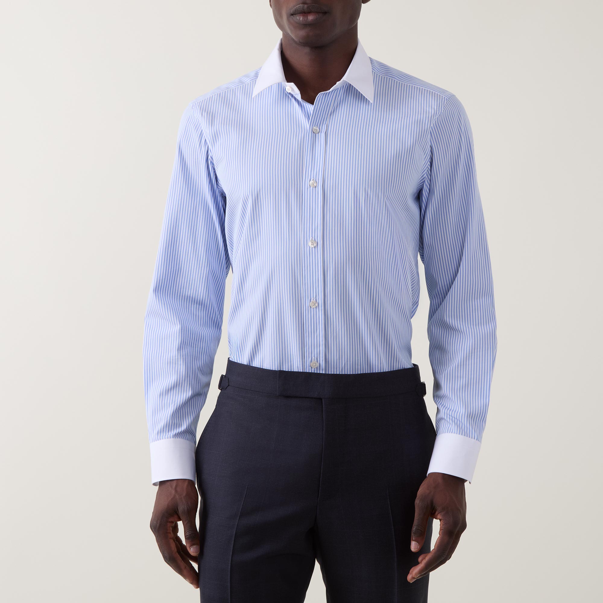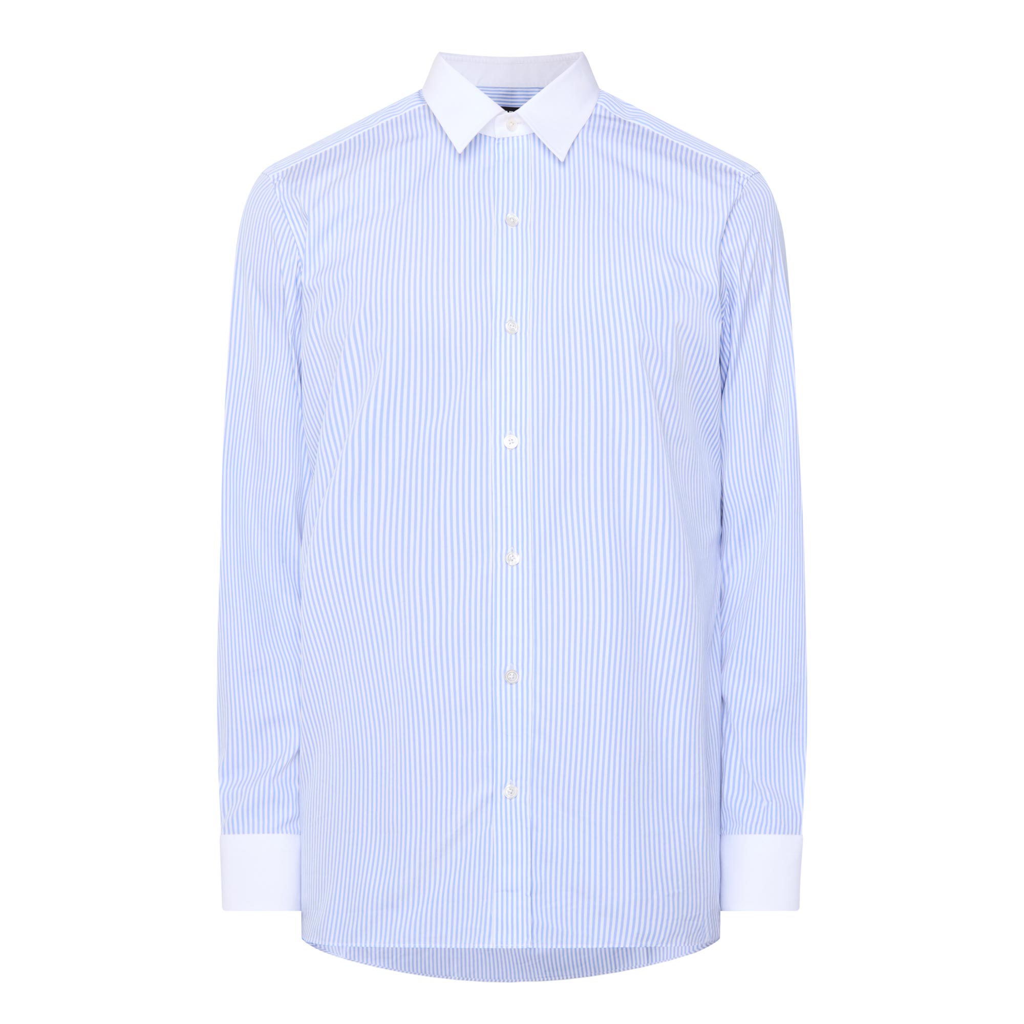 • Contrasting point collar, long sleeves, front button fastenings, darting to the back, contrasting single-button cuffs, striped pattern, tonal stitching, curved hemline, smooth fabric