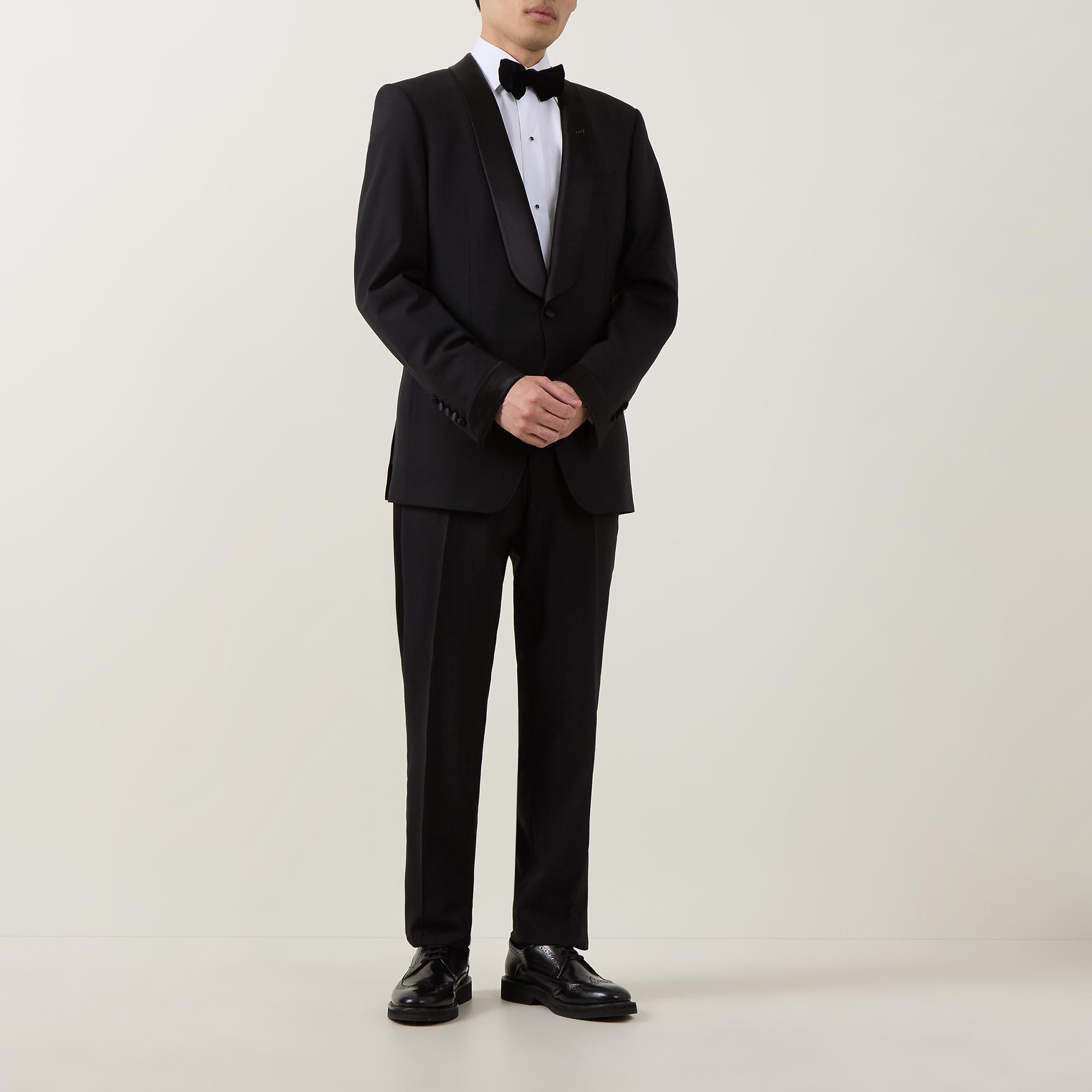 - Jacket: Tuxedo lapels, single-breasted, button fastening, slit pockets, buttoned cuffs, internal pockets. Trousers: Flat front, tab adjustable sides, pressed creases, contrast seam detail at side, side entry pockets, rear jet pockets