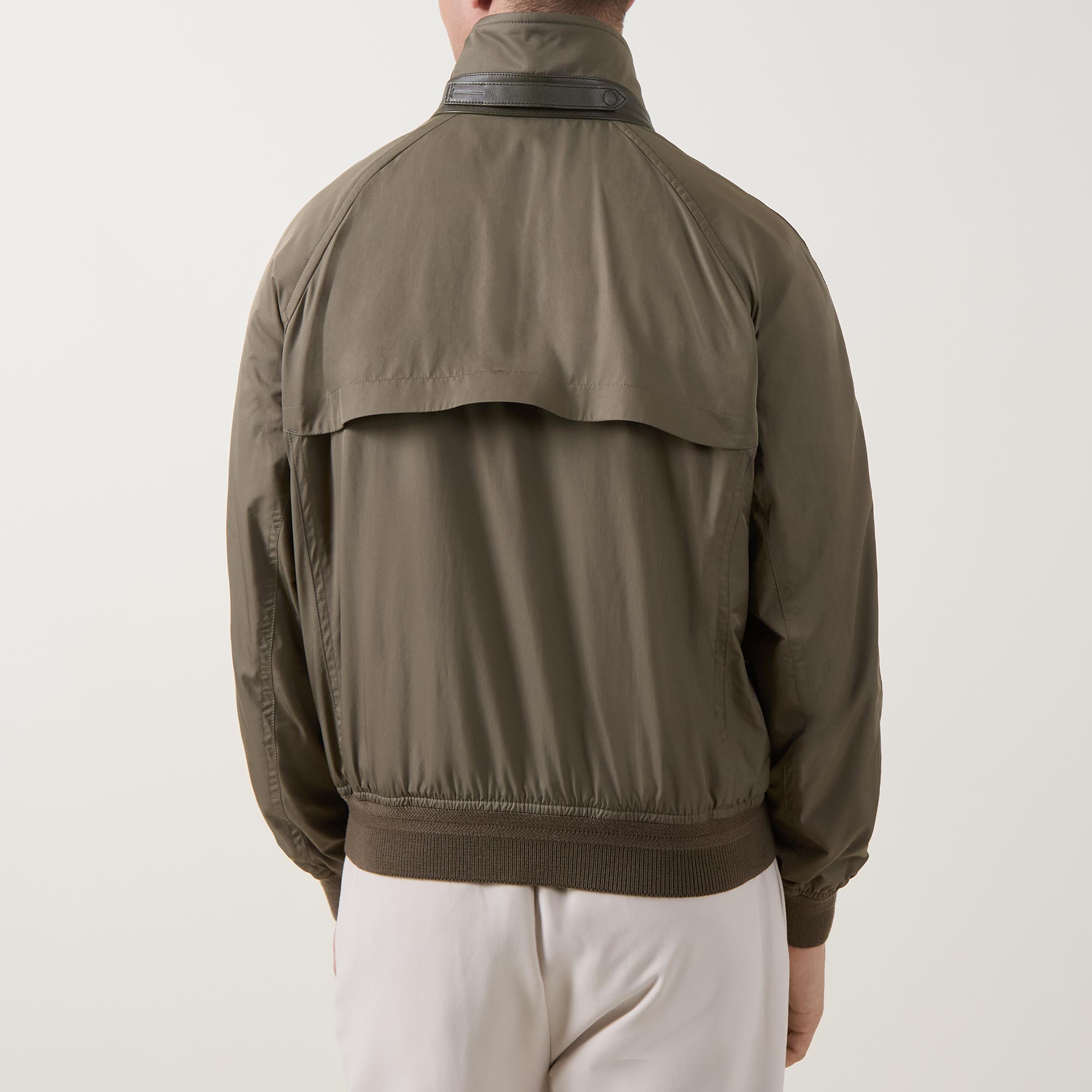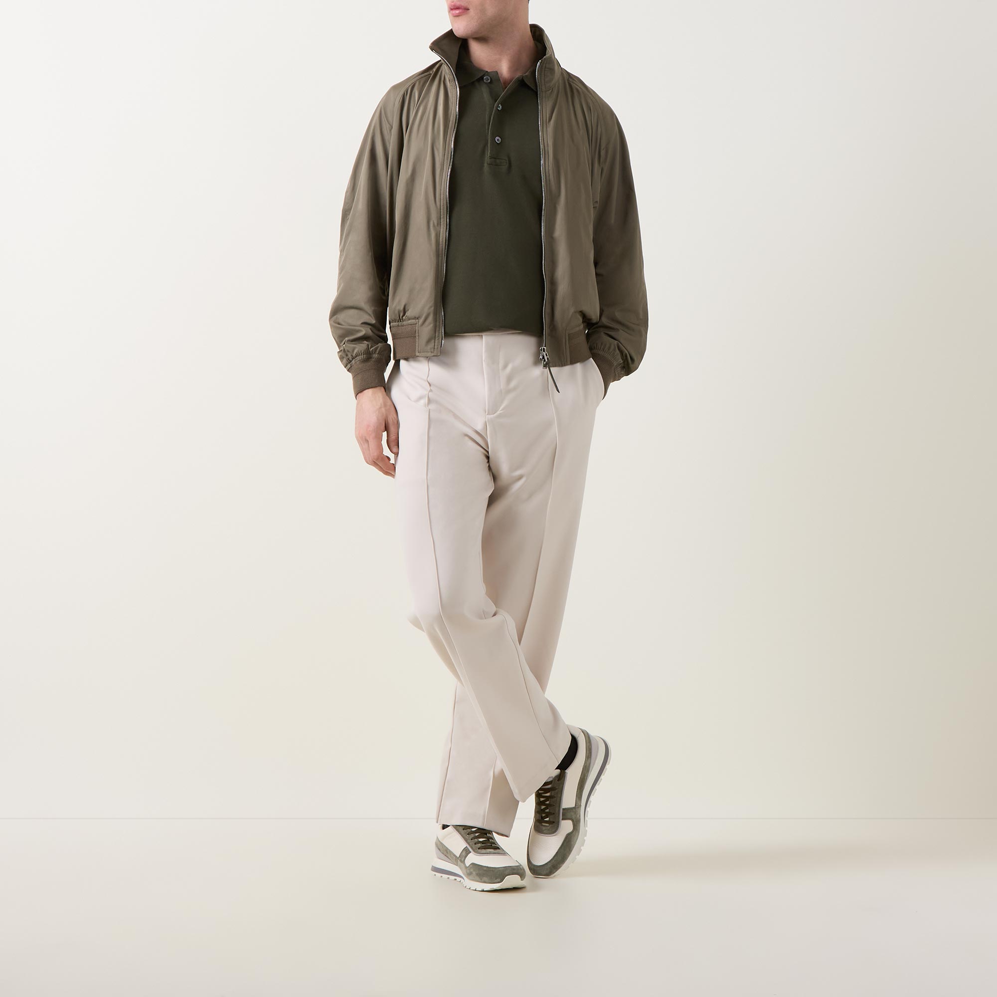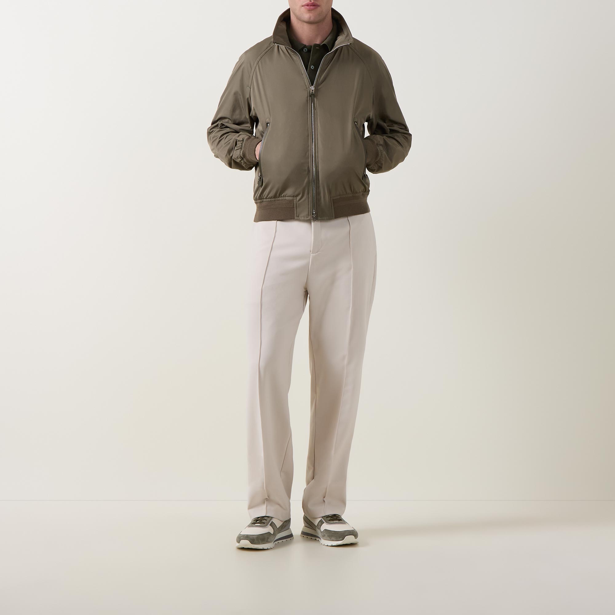 - Stand-up collar, long sleeves, full zip-through fastening, two side zip pockets, storm flap, elasticated hemline and cuffs, smooth finish